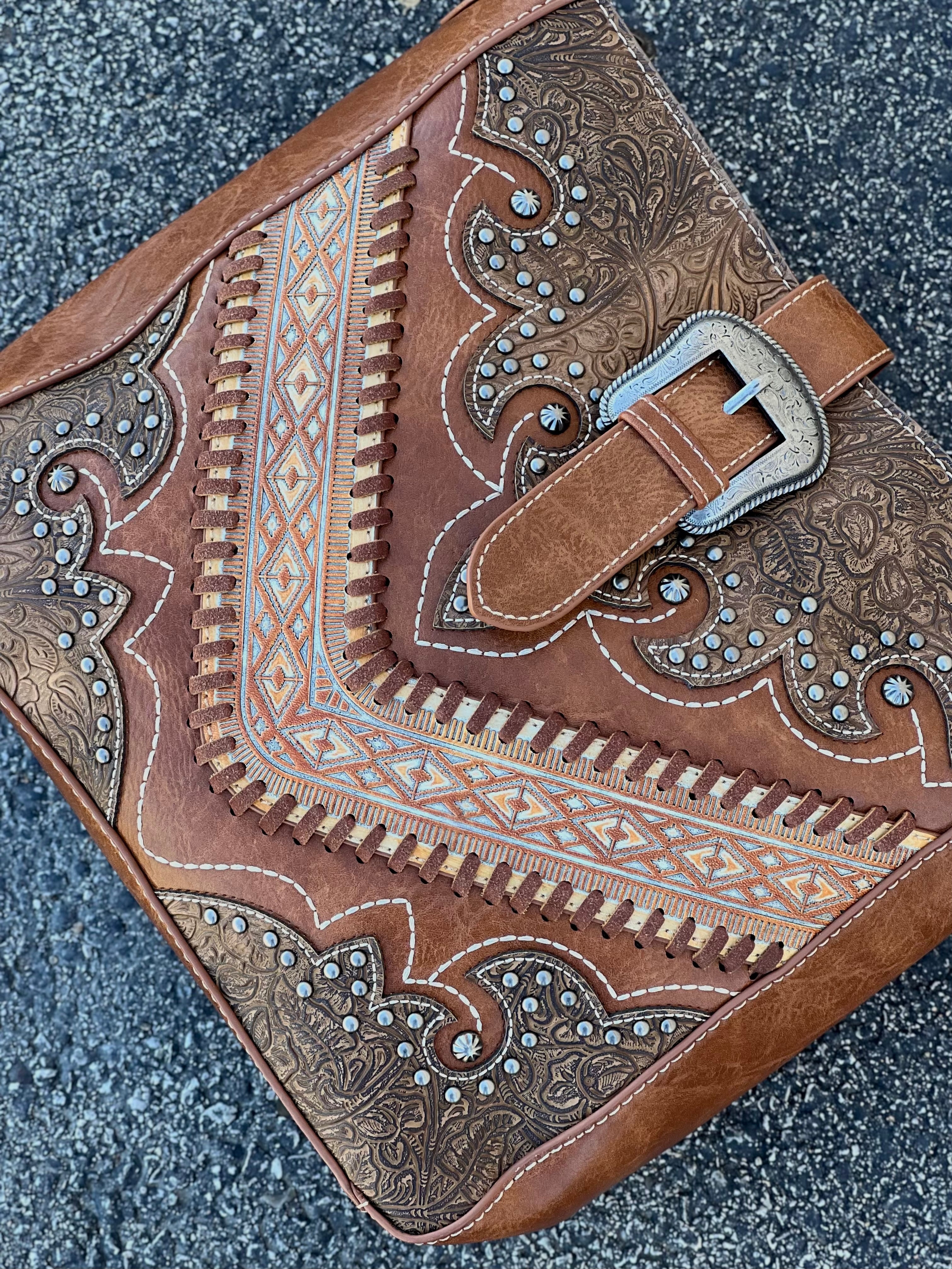- Accented with antique silver studs