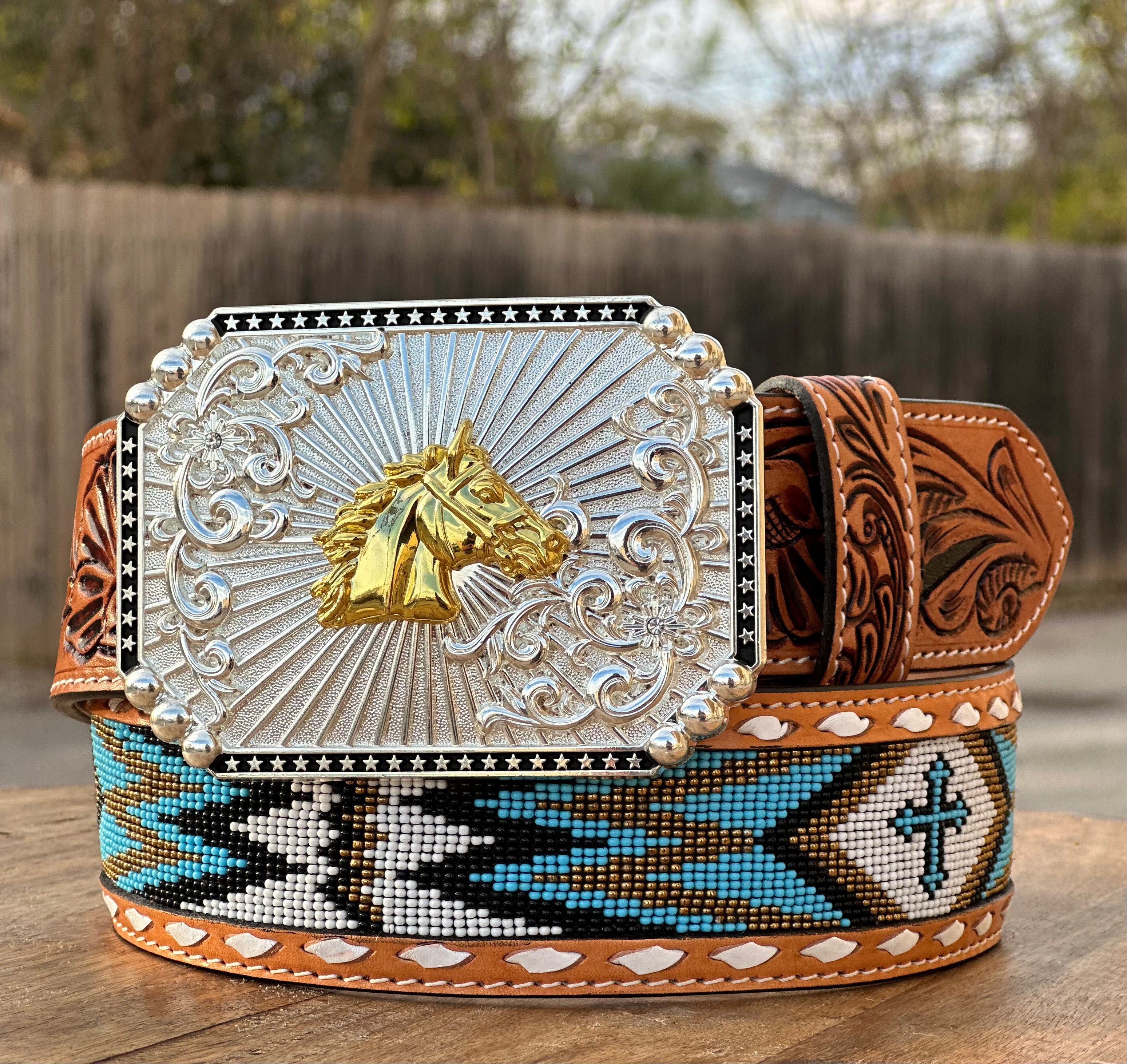 Hand-Tooled Artesanal Tabs With Blue and White Beaded Leather Belt ( Read Description Before Ordering)