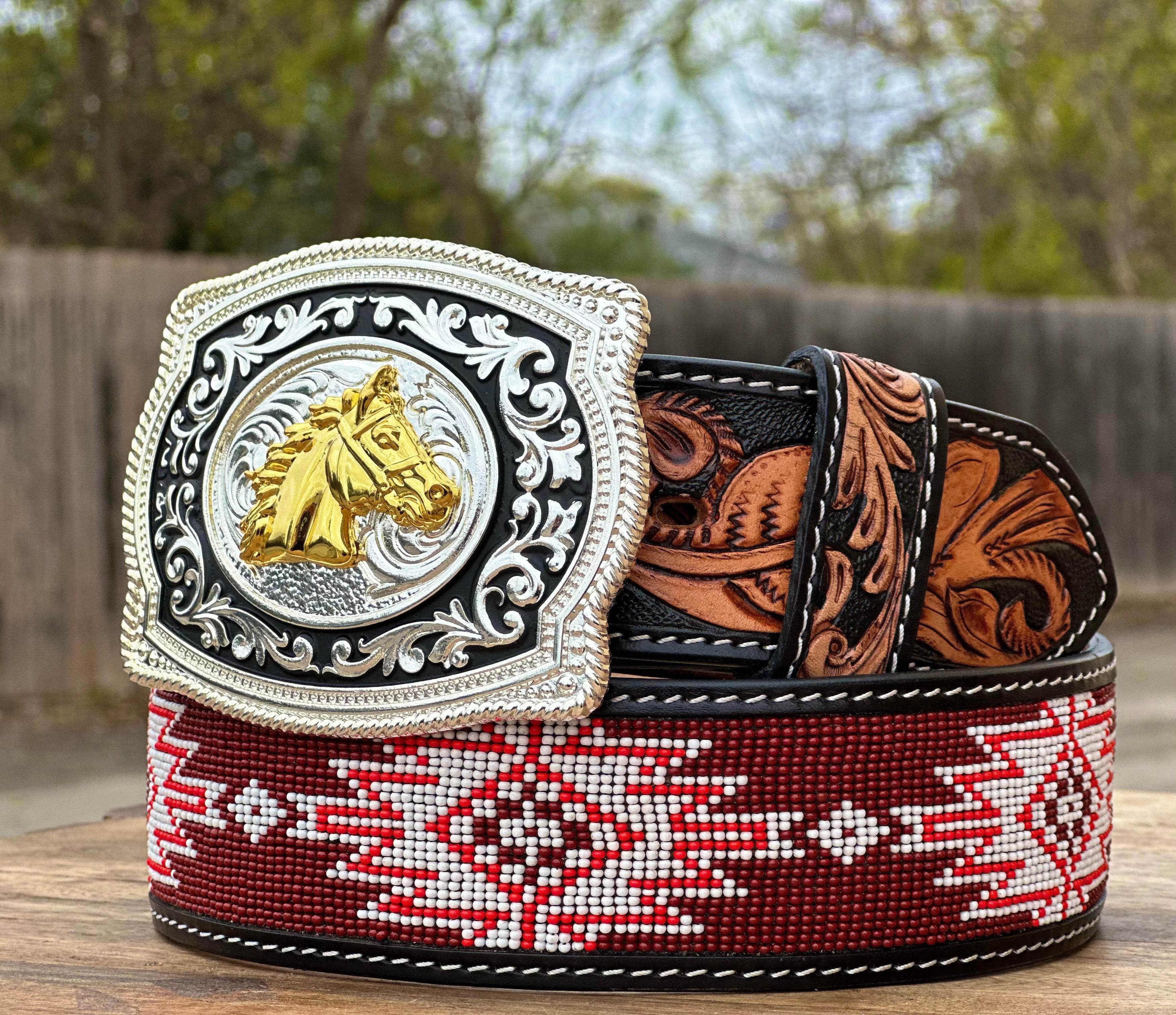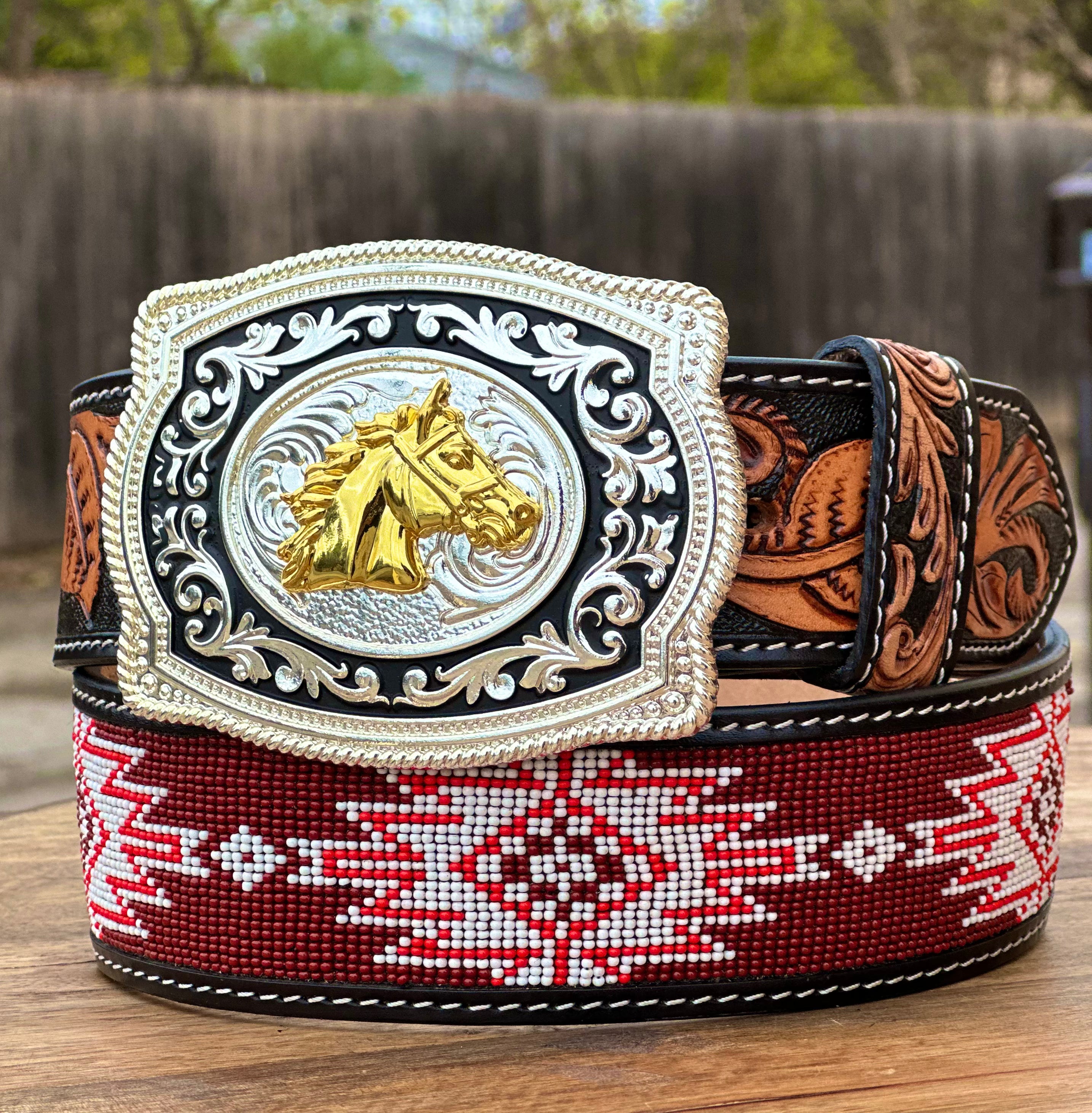Hand-Tooled Artesanal Tabs With Maroon And White Beaded Leather Belt (Read Description Before Ordering)