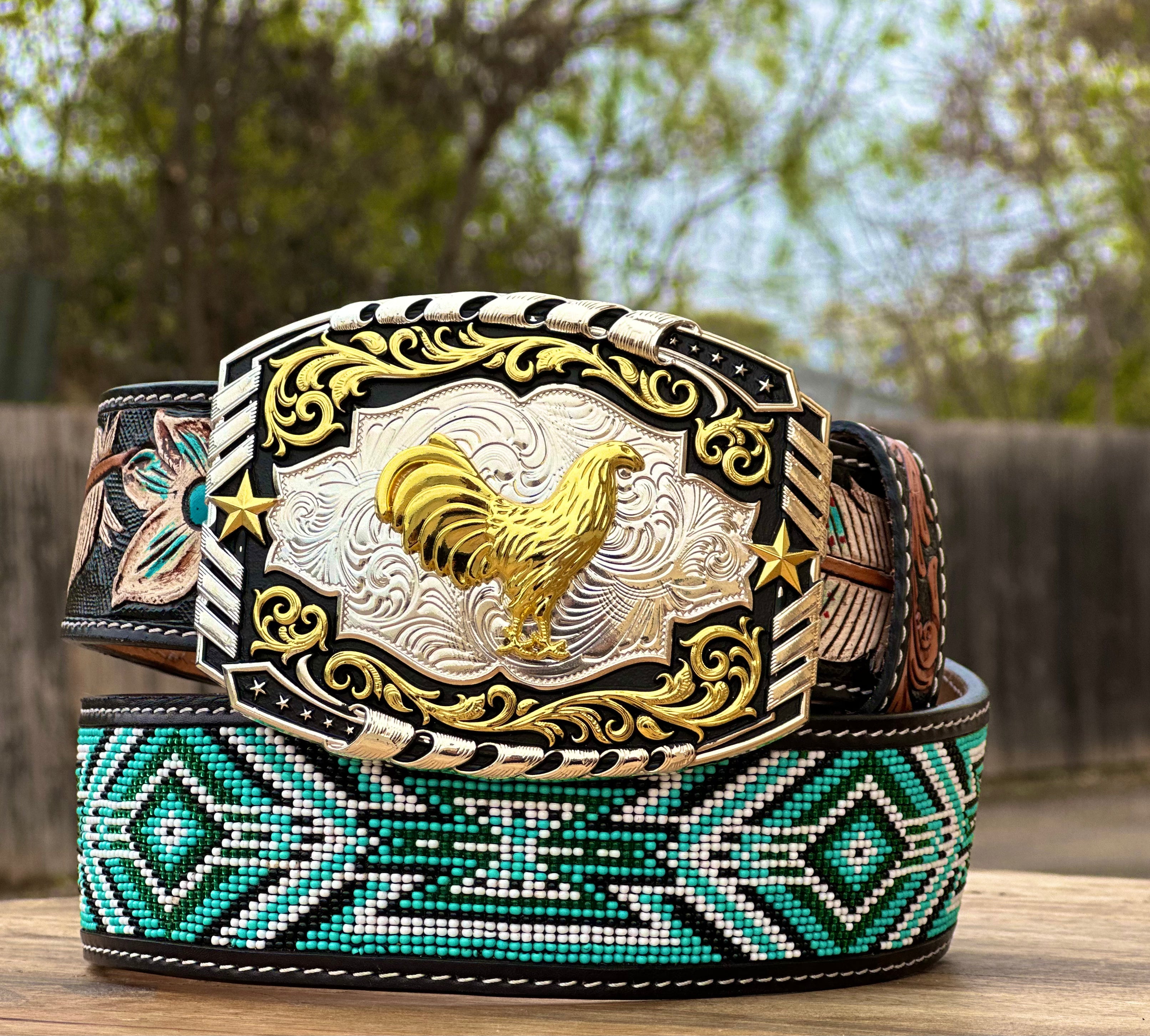 Hand-Tooled Artesanal Tabs With Mint Green, White and Black Beaded Leather Belt ( Read Description Before Ordering)