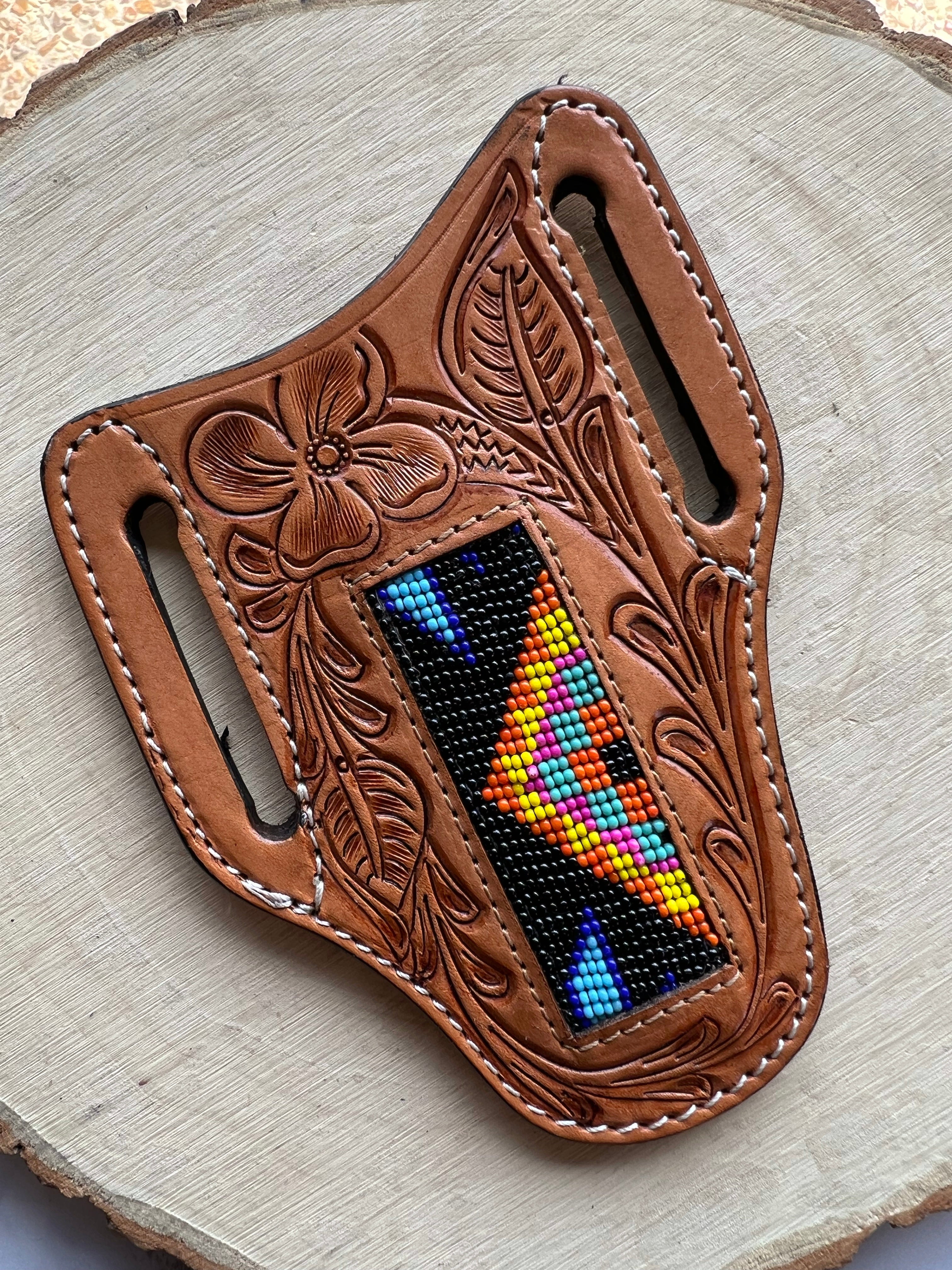Honey Hand-Tooled With a Side Colorful Triangle Beaded Knife Sheath