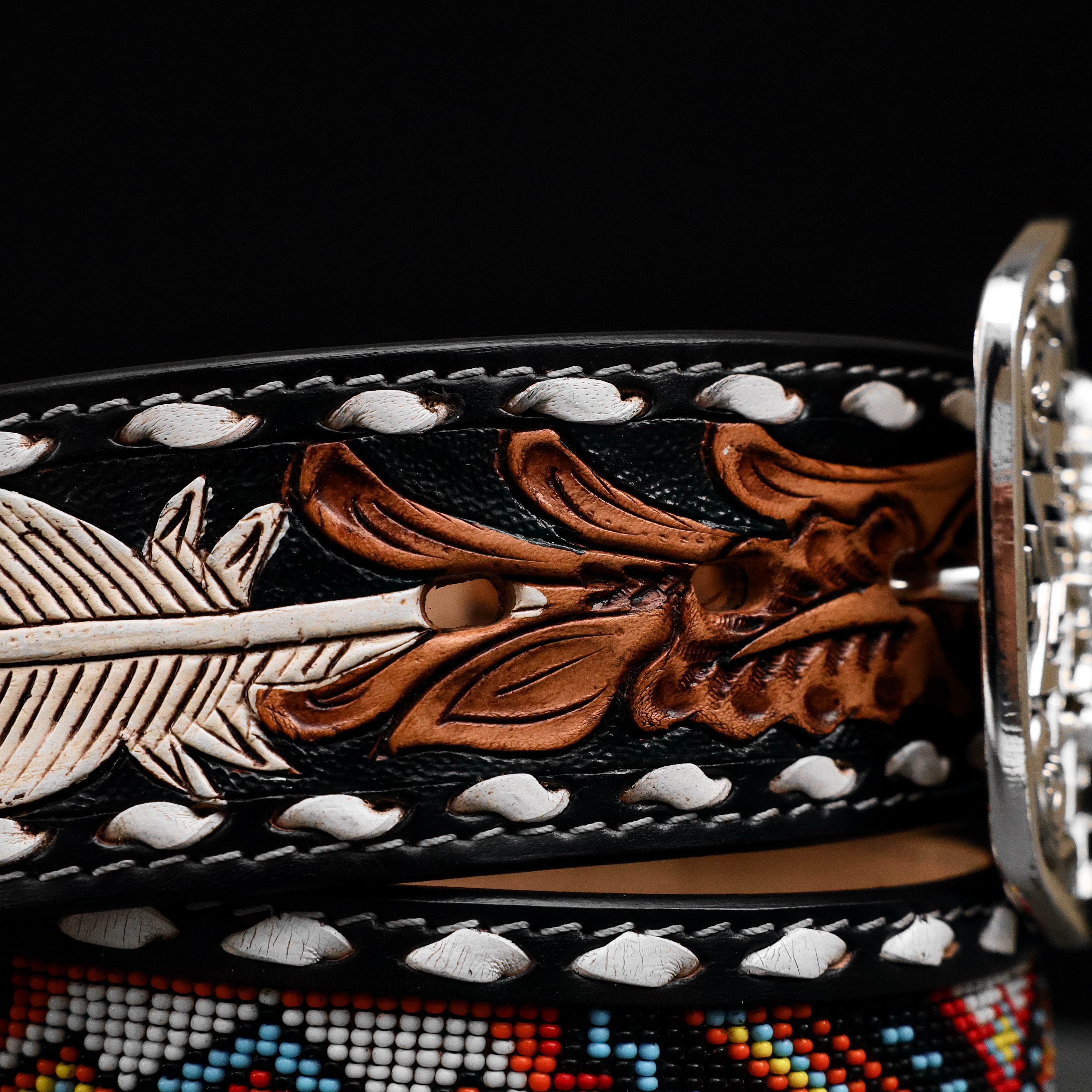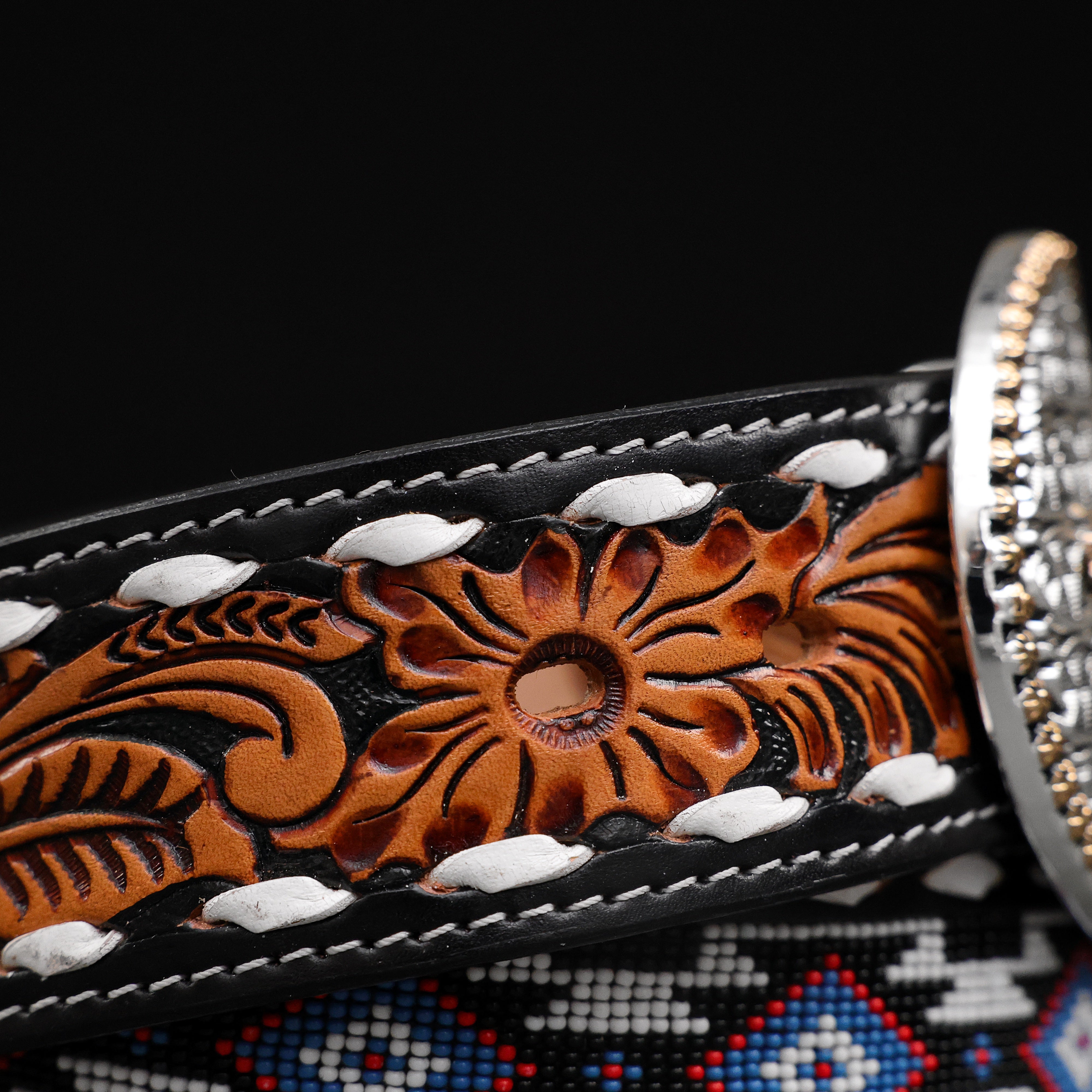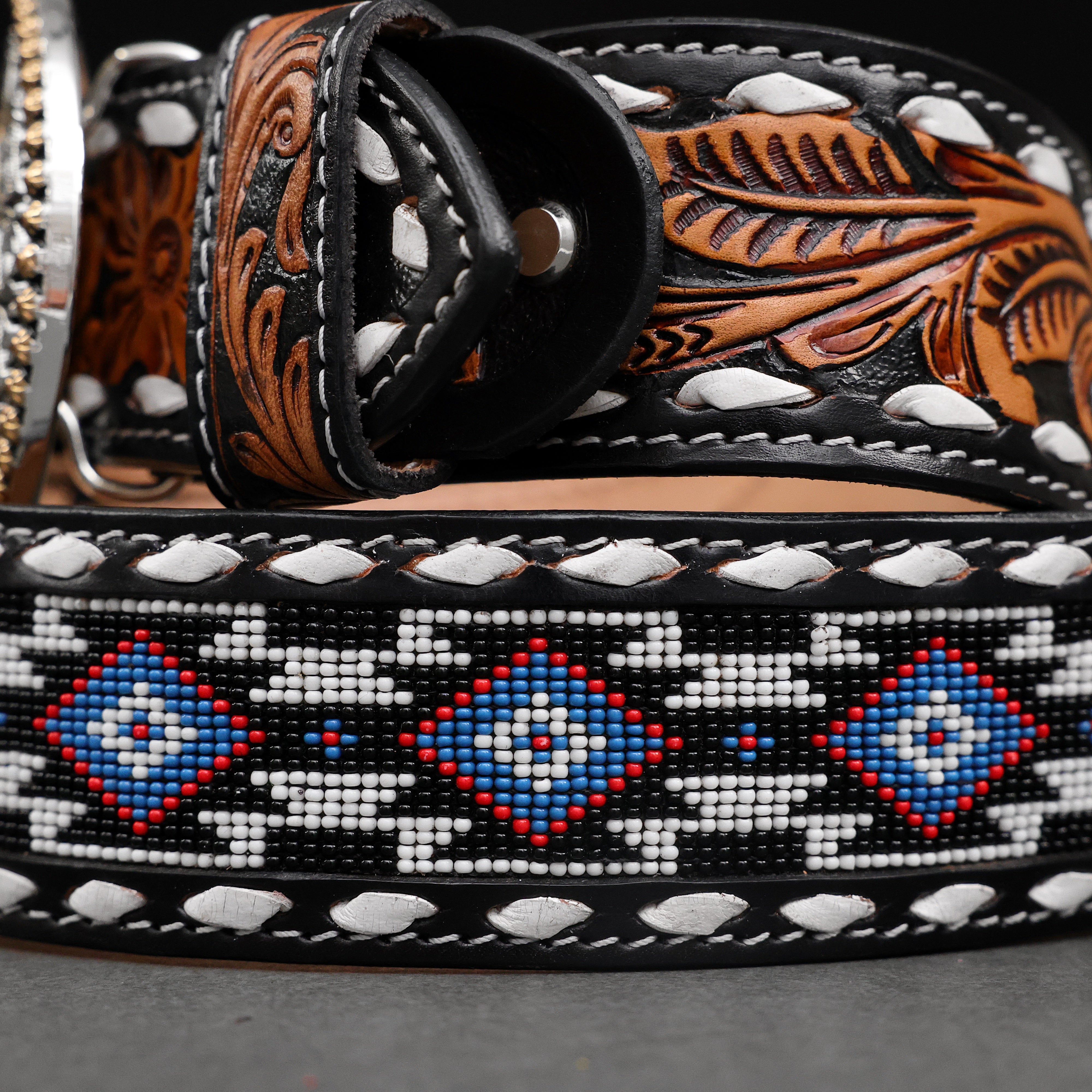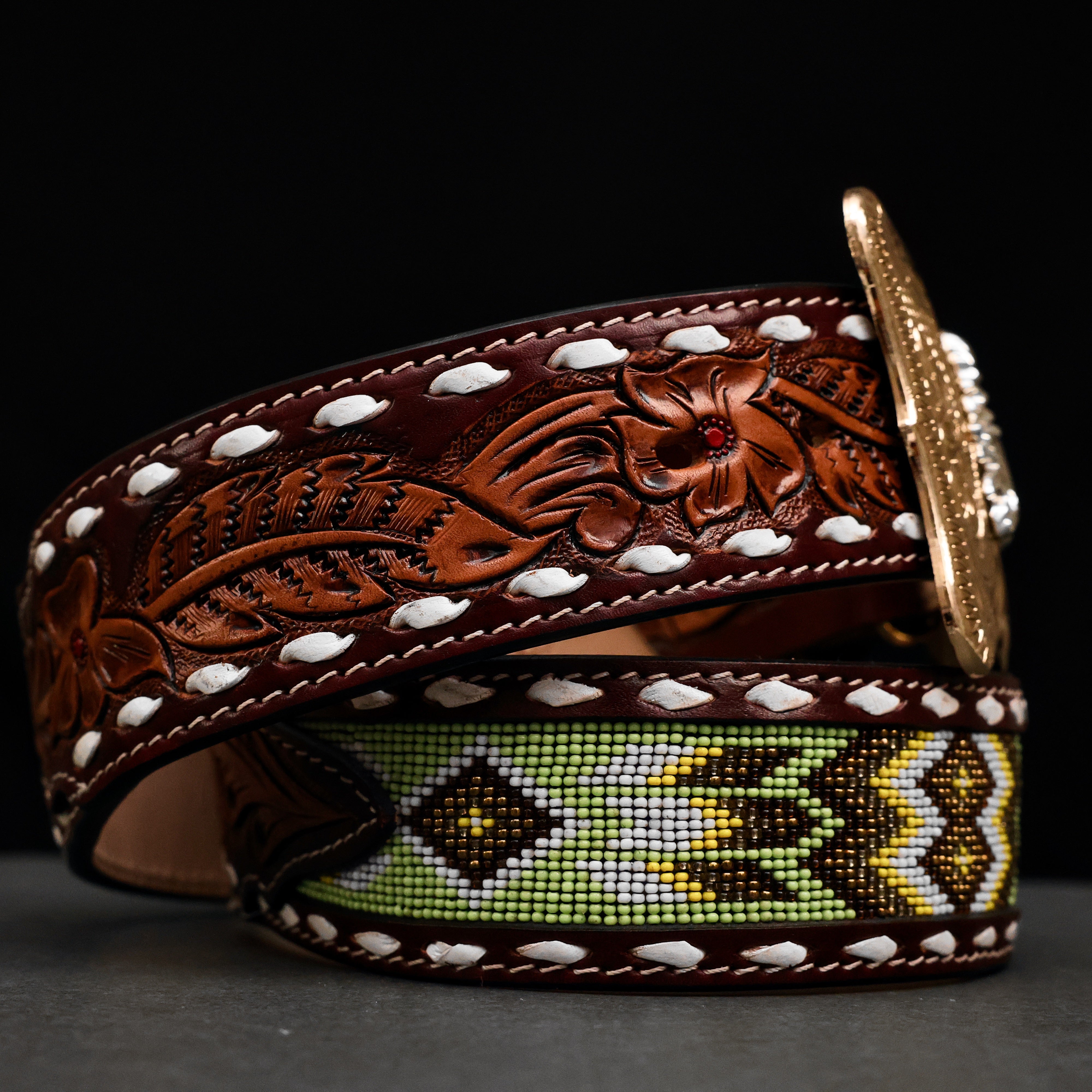 Hand-Tooled Artesanal Beaded Leather Belt