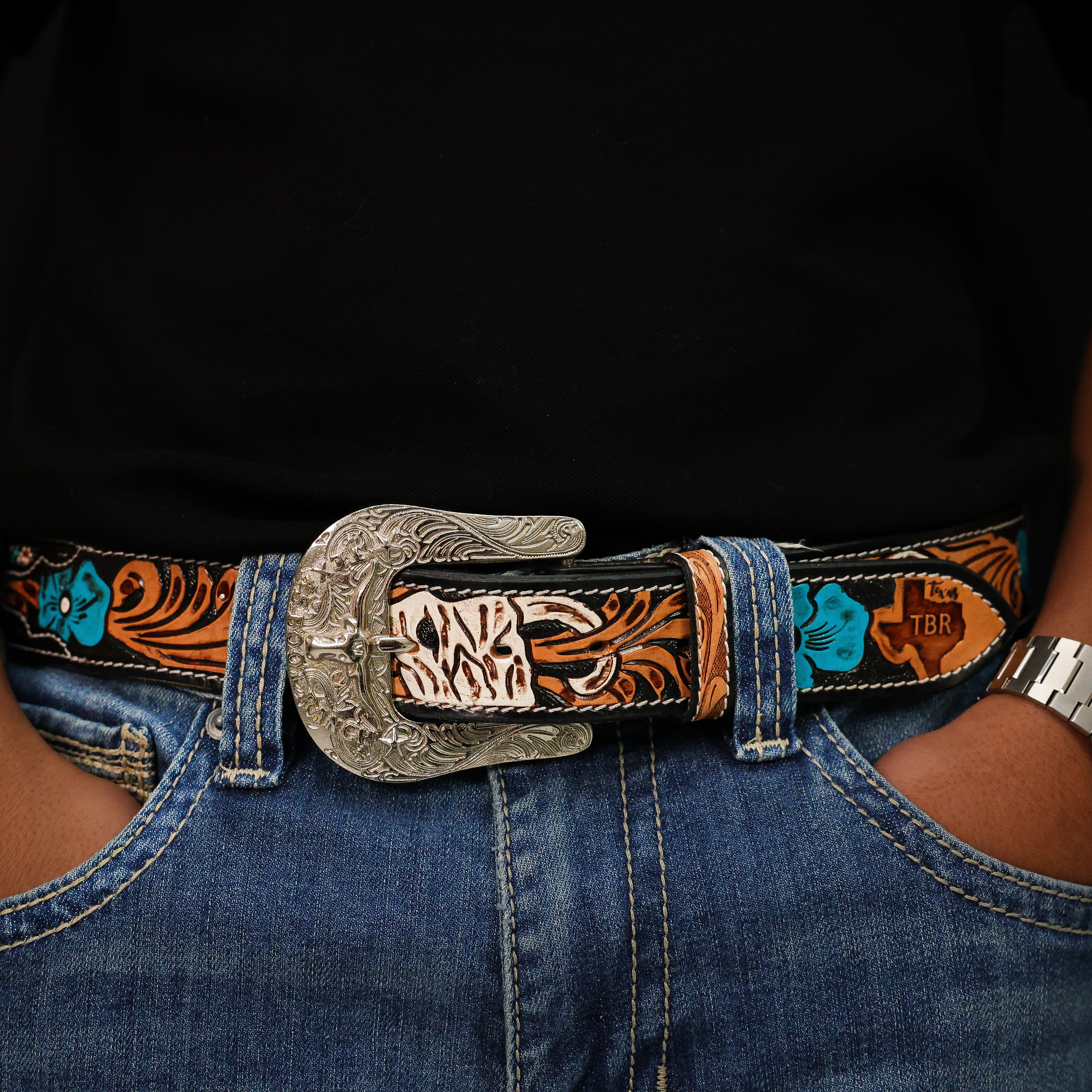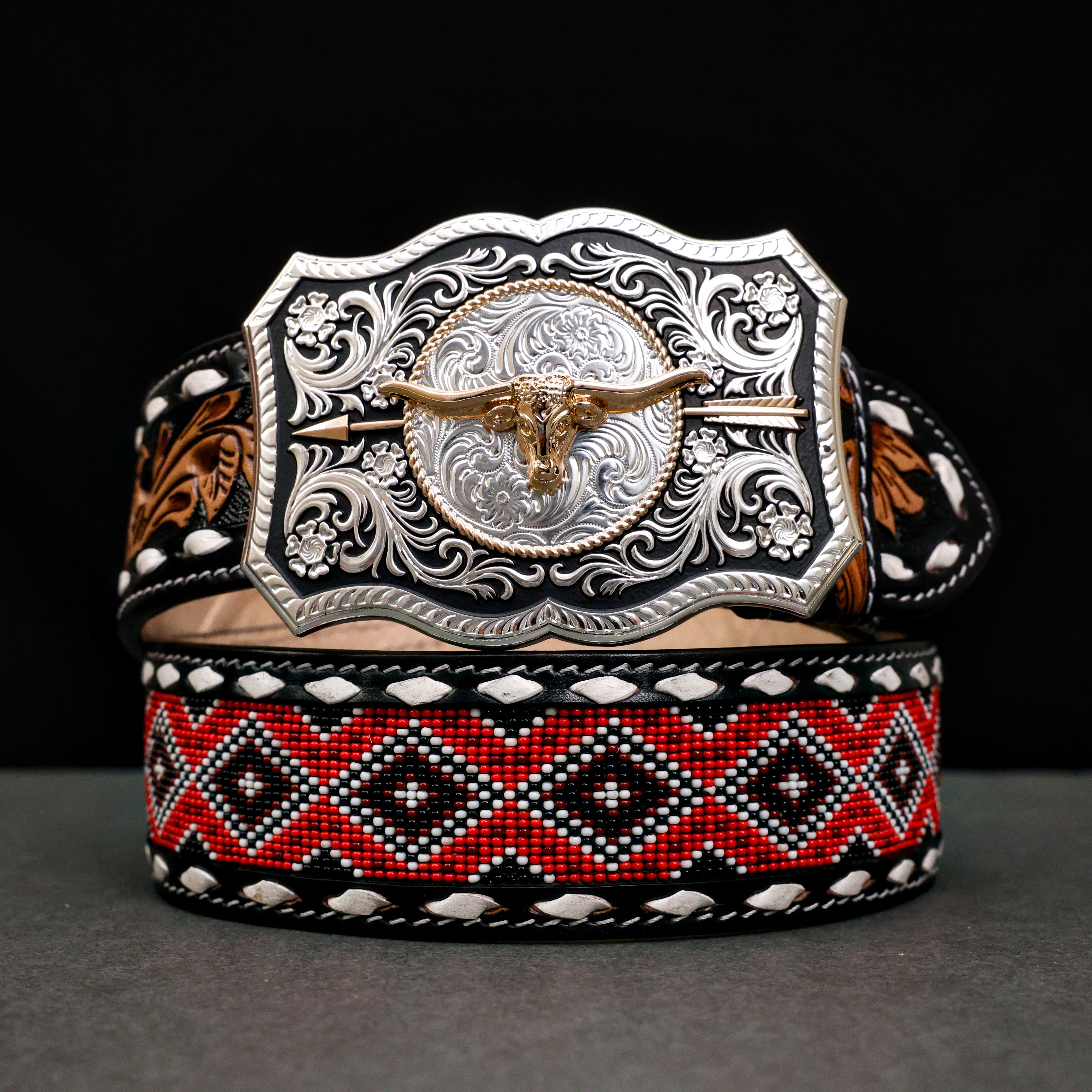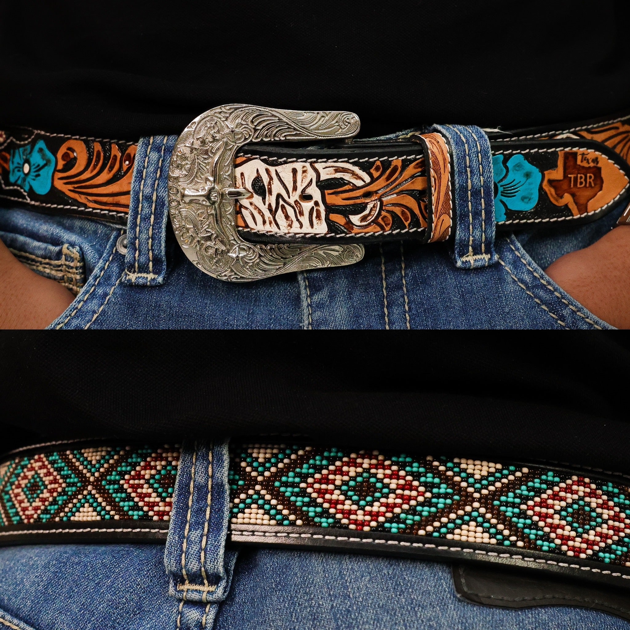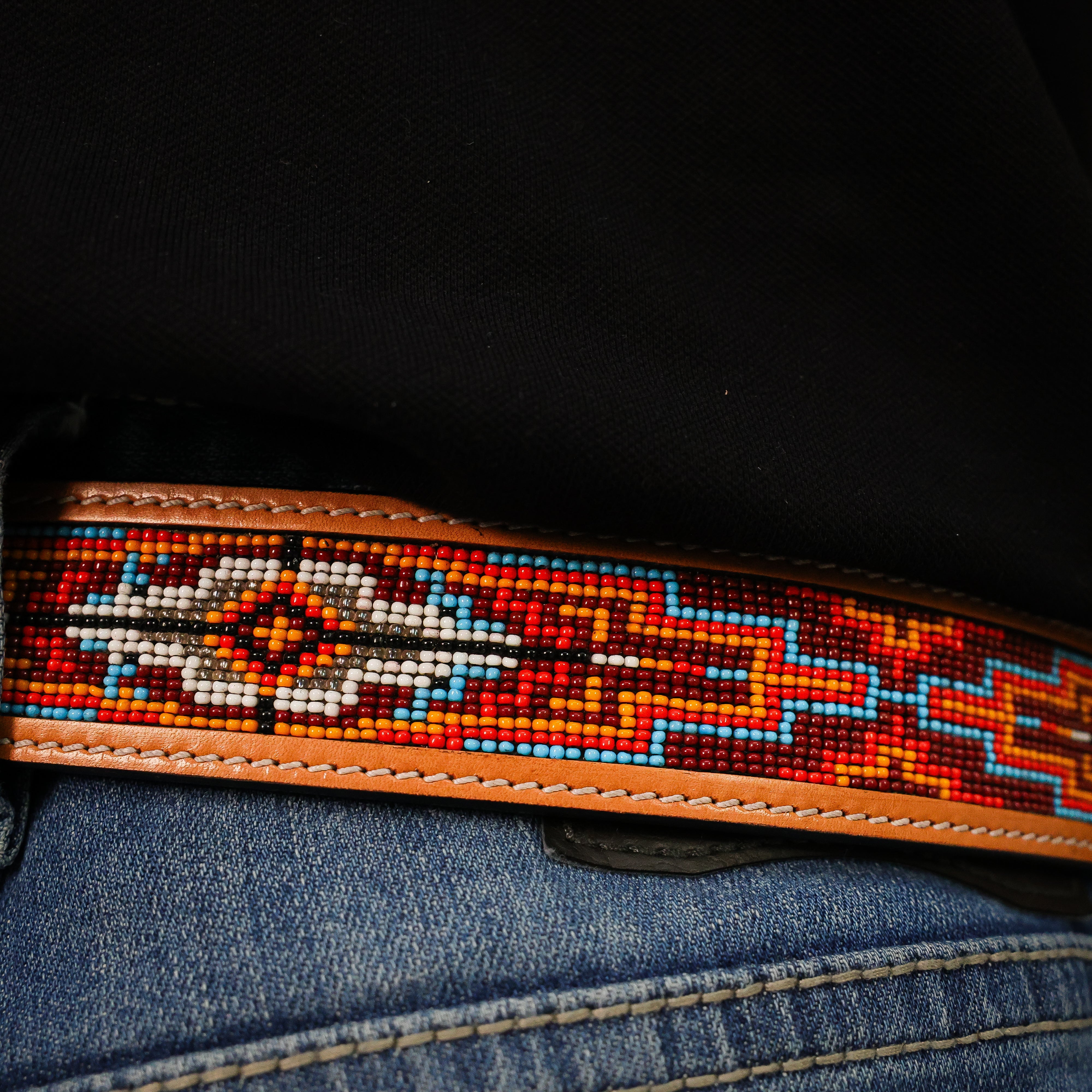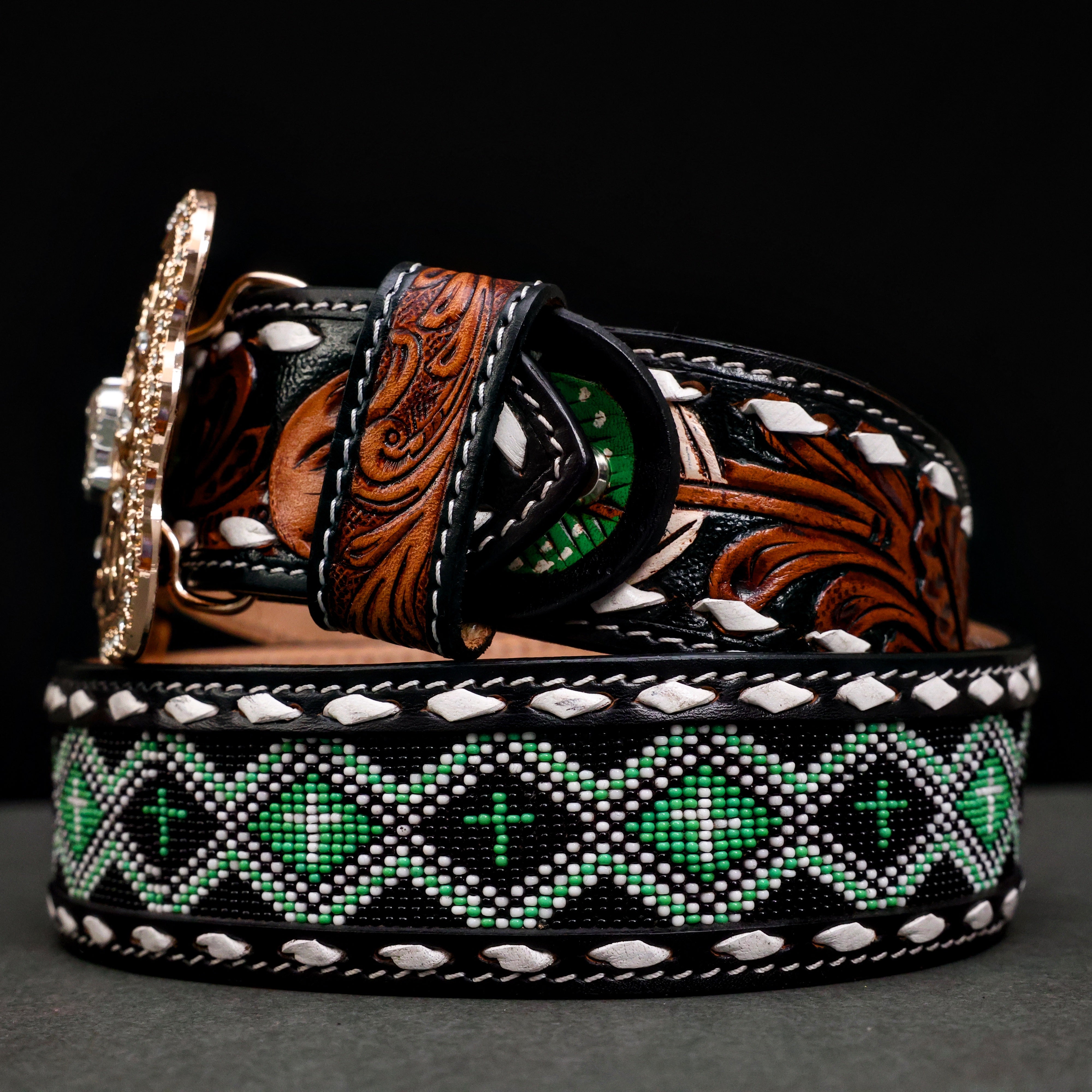 Hand-Tooled Artesanal Beaded Leather Belt