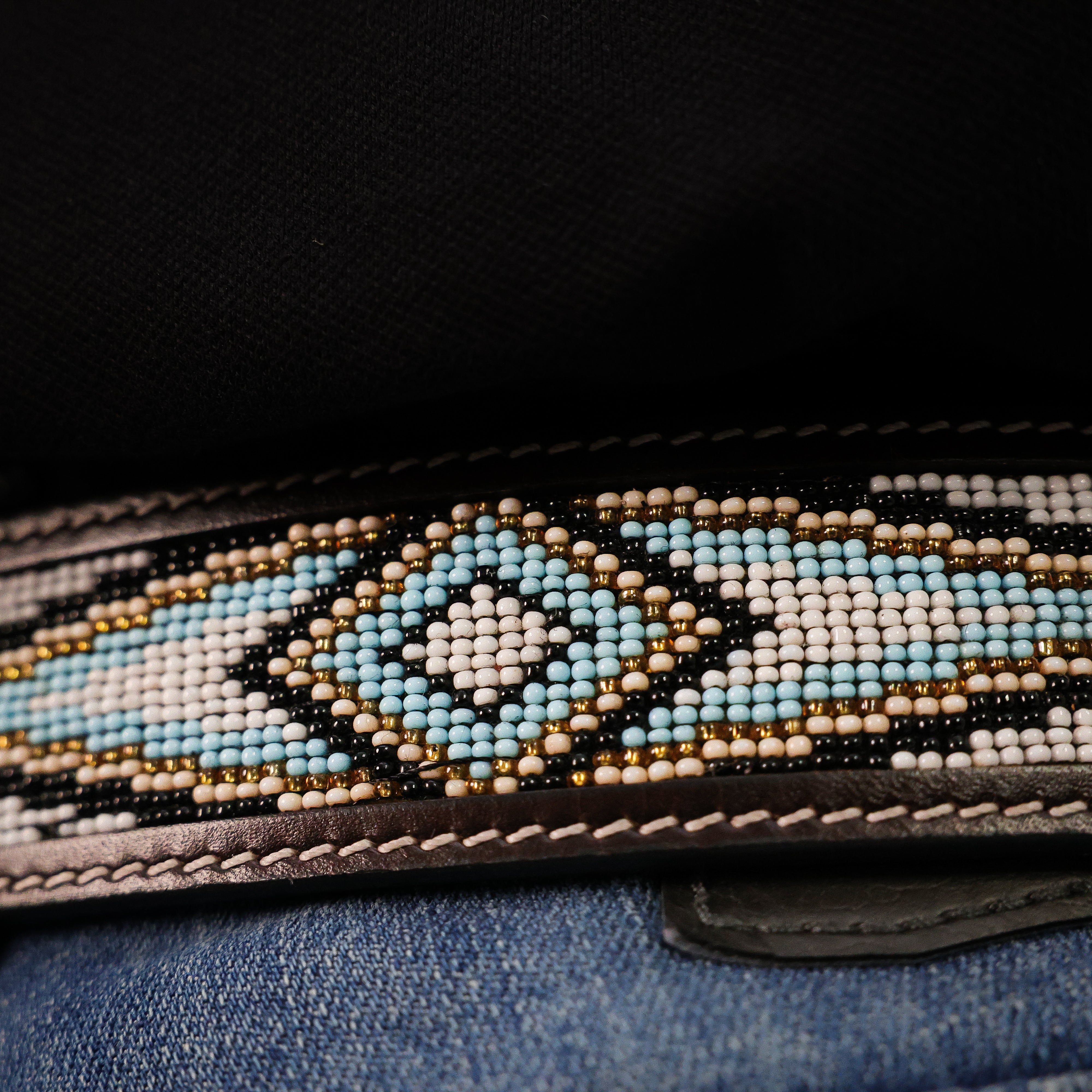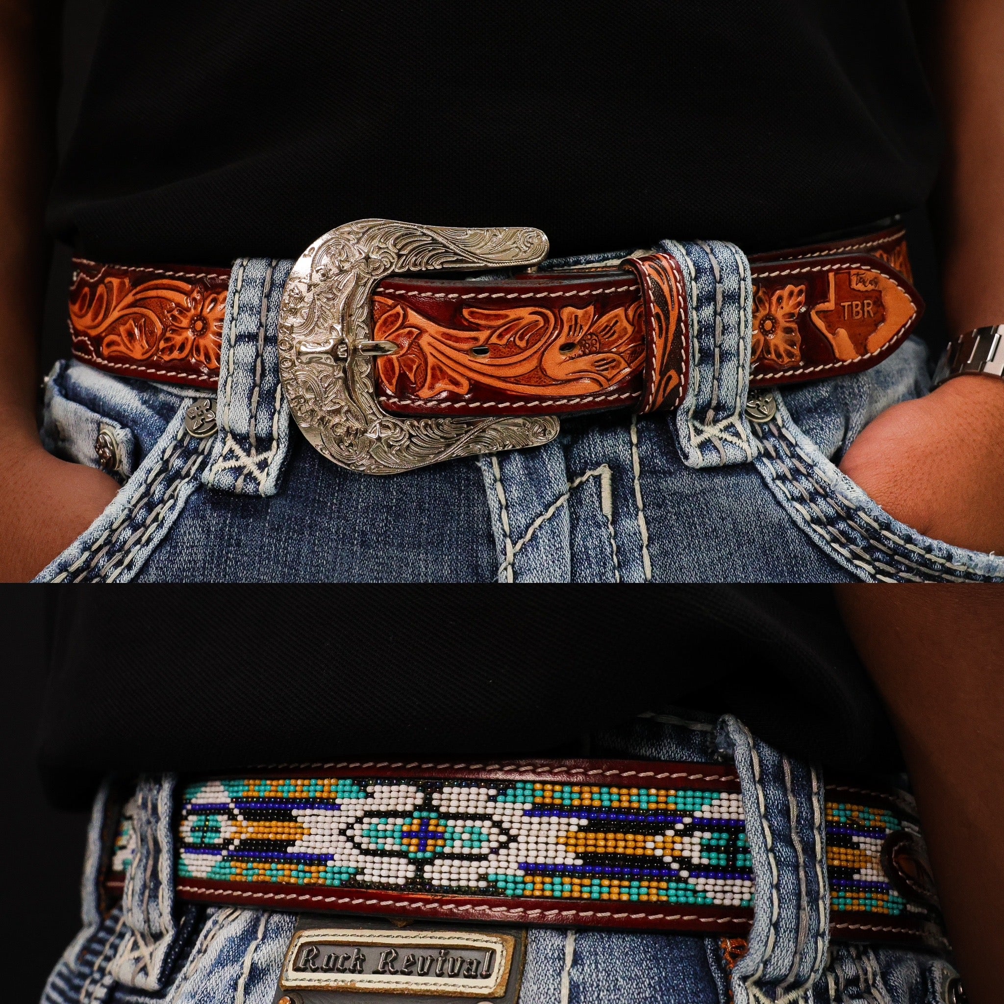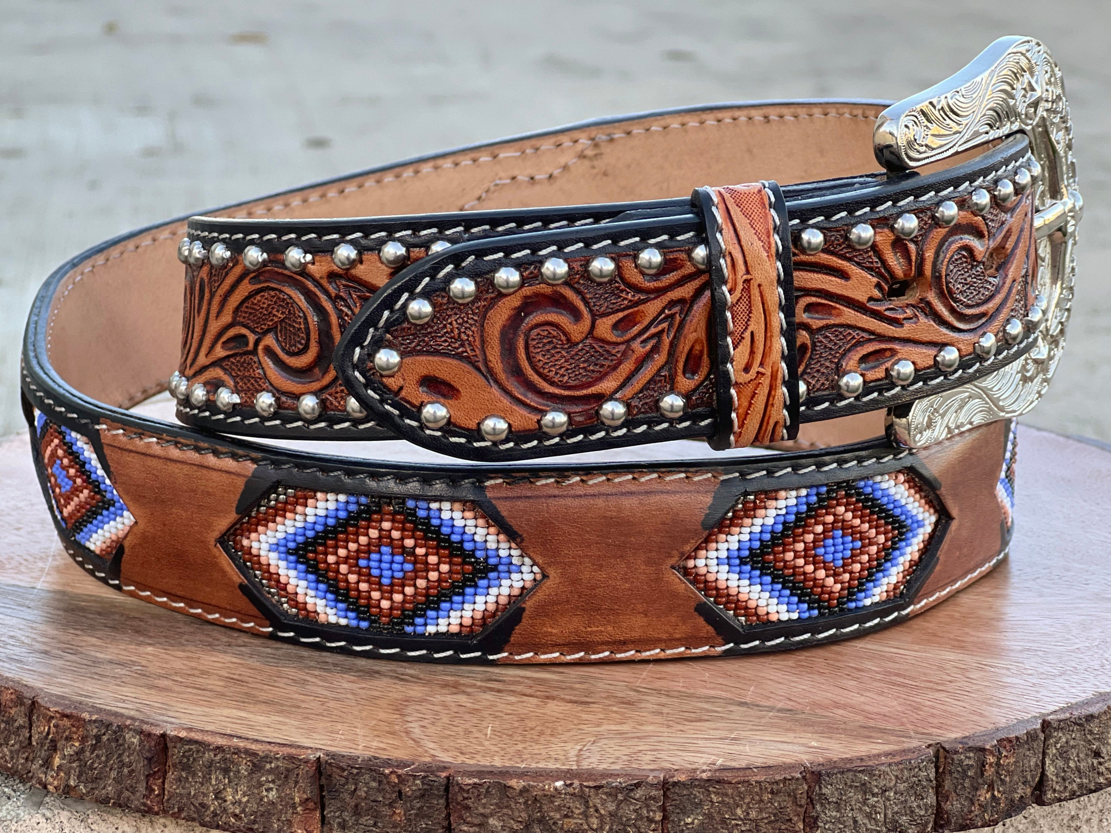 Honey Hand-Tooled Leather Artesanal Tabs With Silver Studs Green & White Beaded Belt