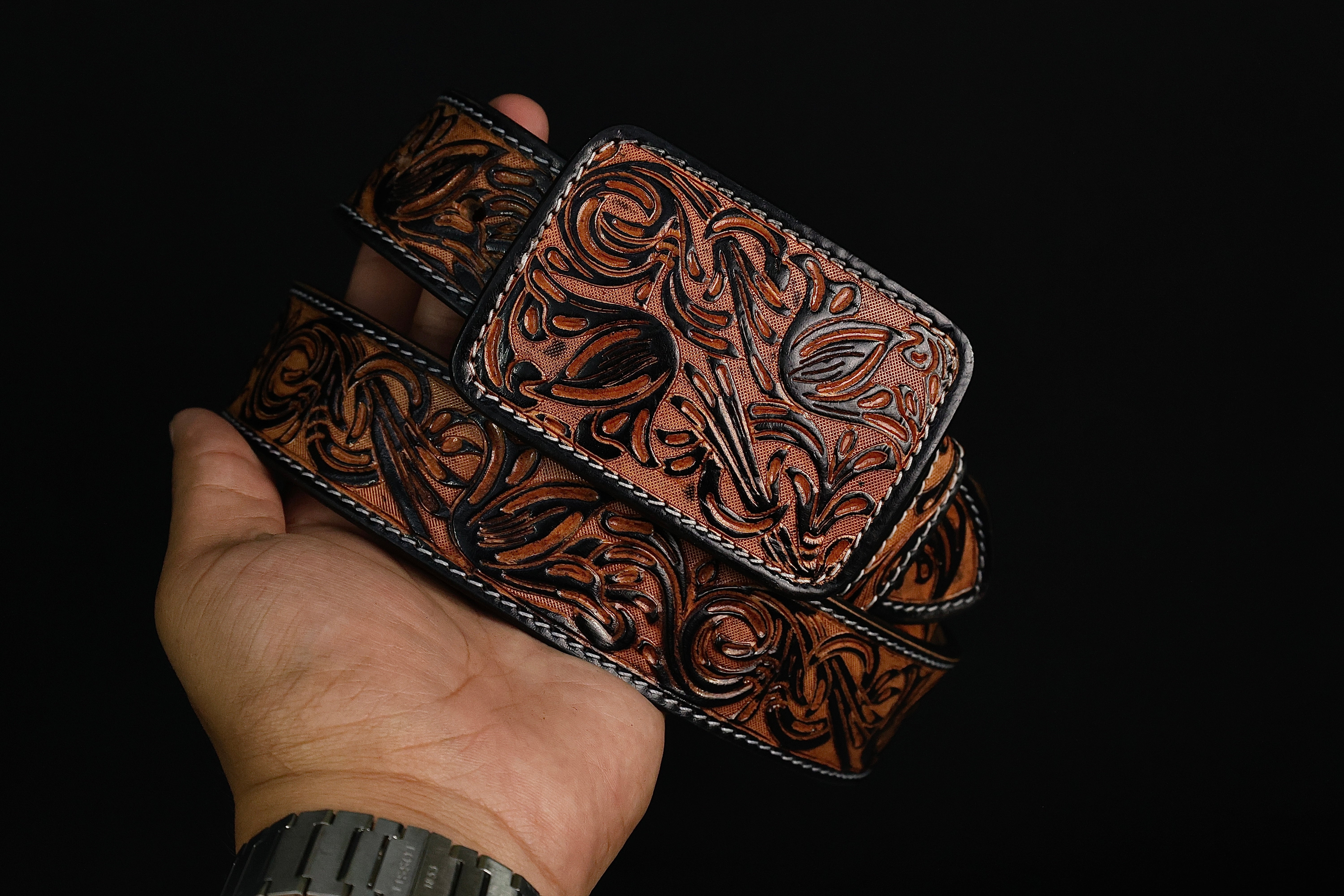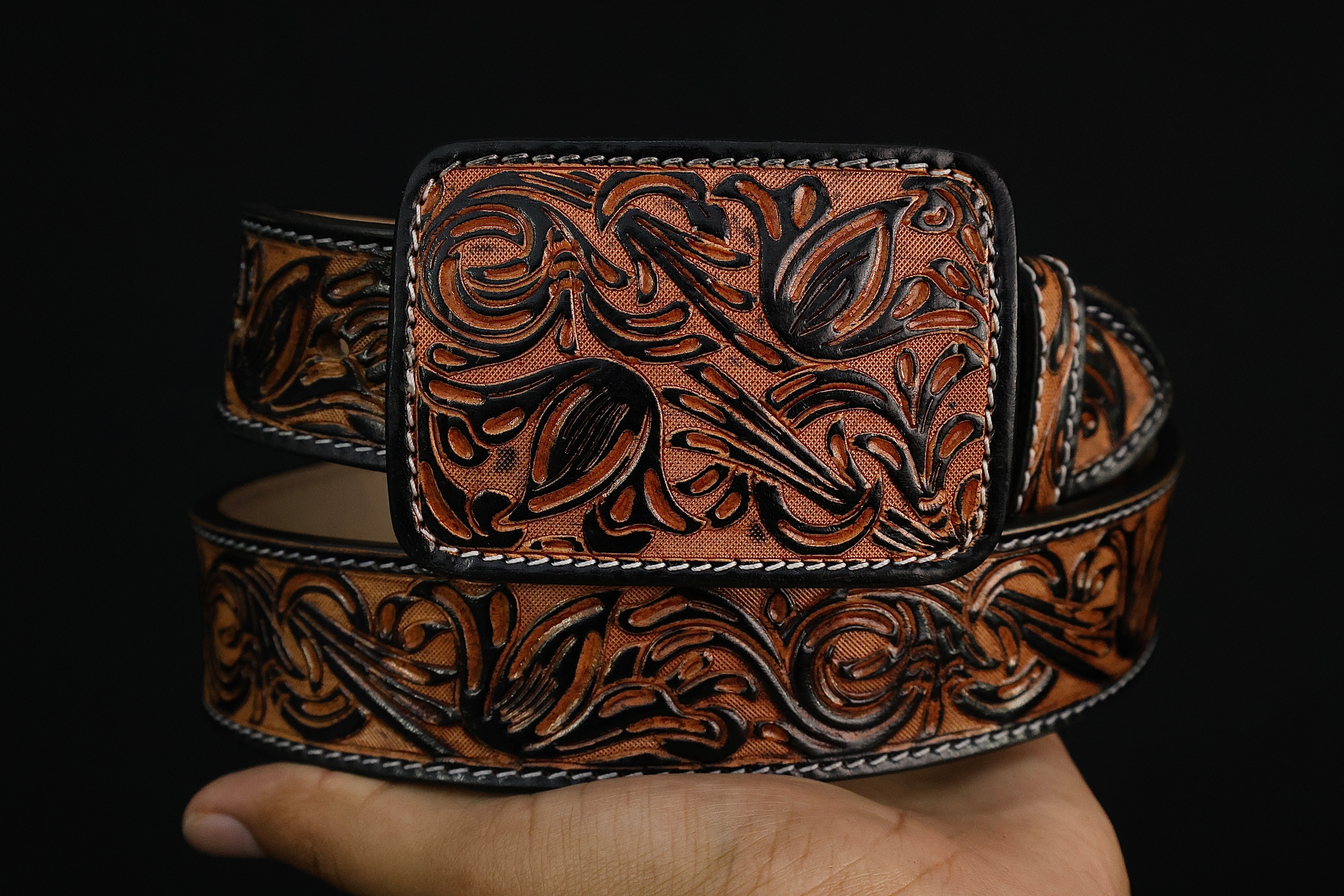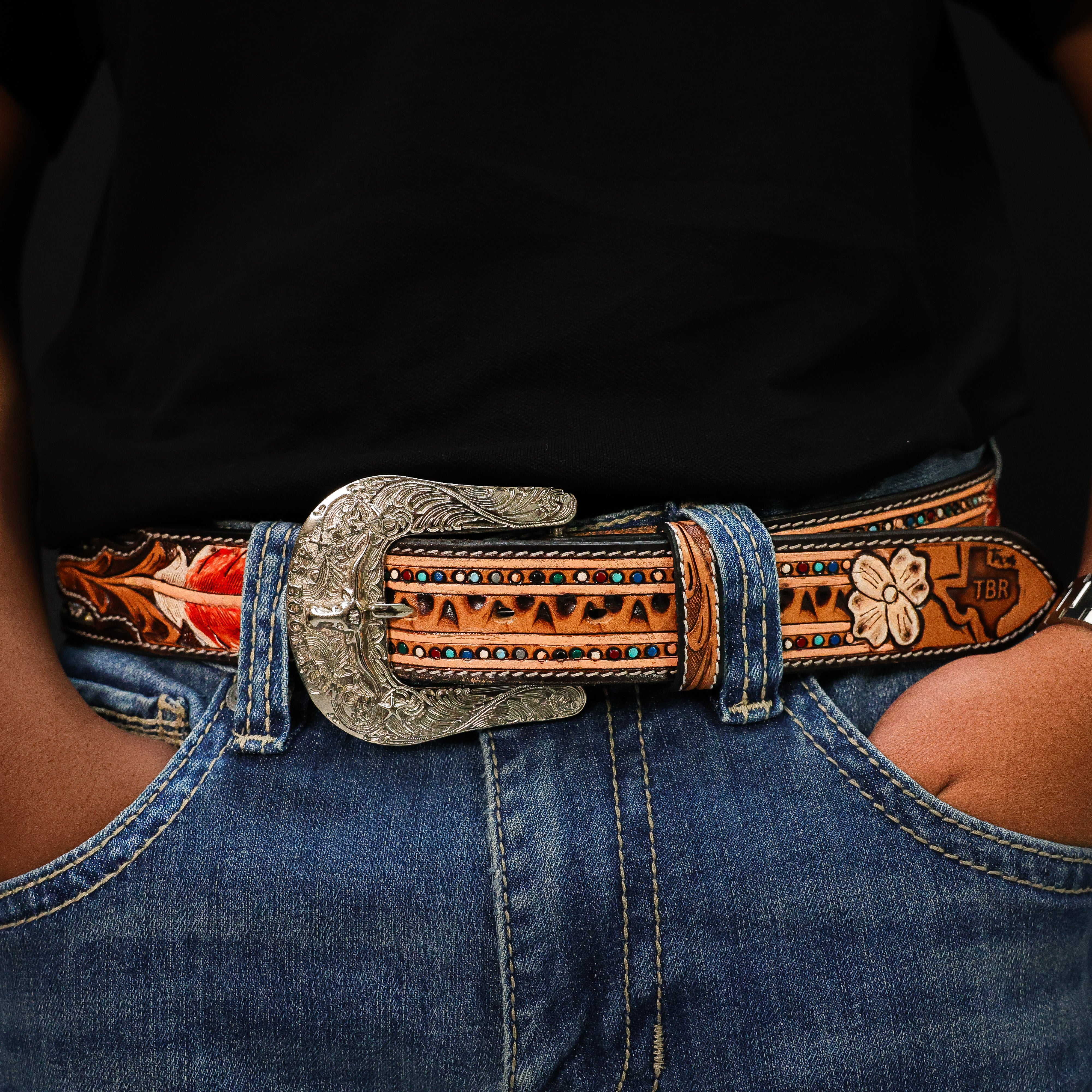 Honey Hand-Tooled Leather Belt With Silver Studs
