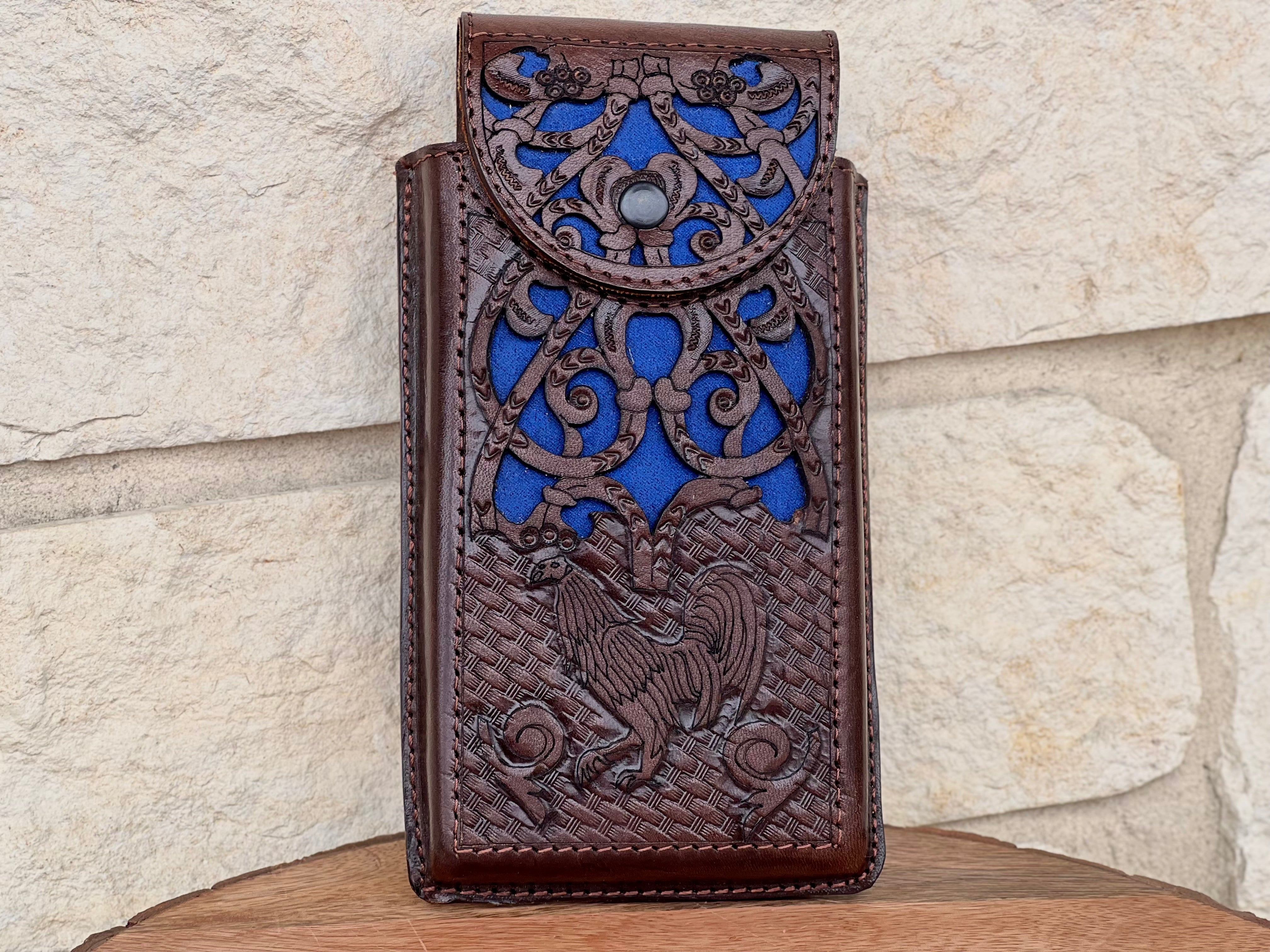 Honey Hand-Tooled Leather Artesanal Tabs With Silver Studs Brown and Purple Beaded Belt