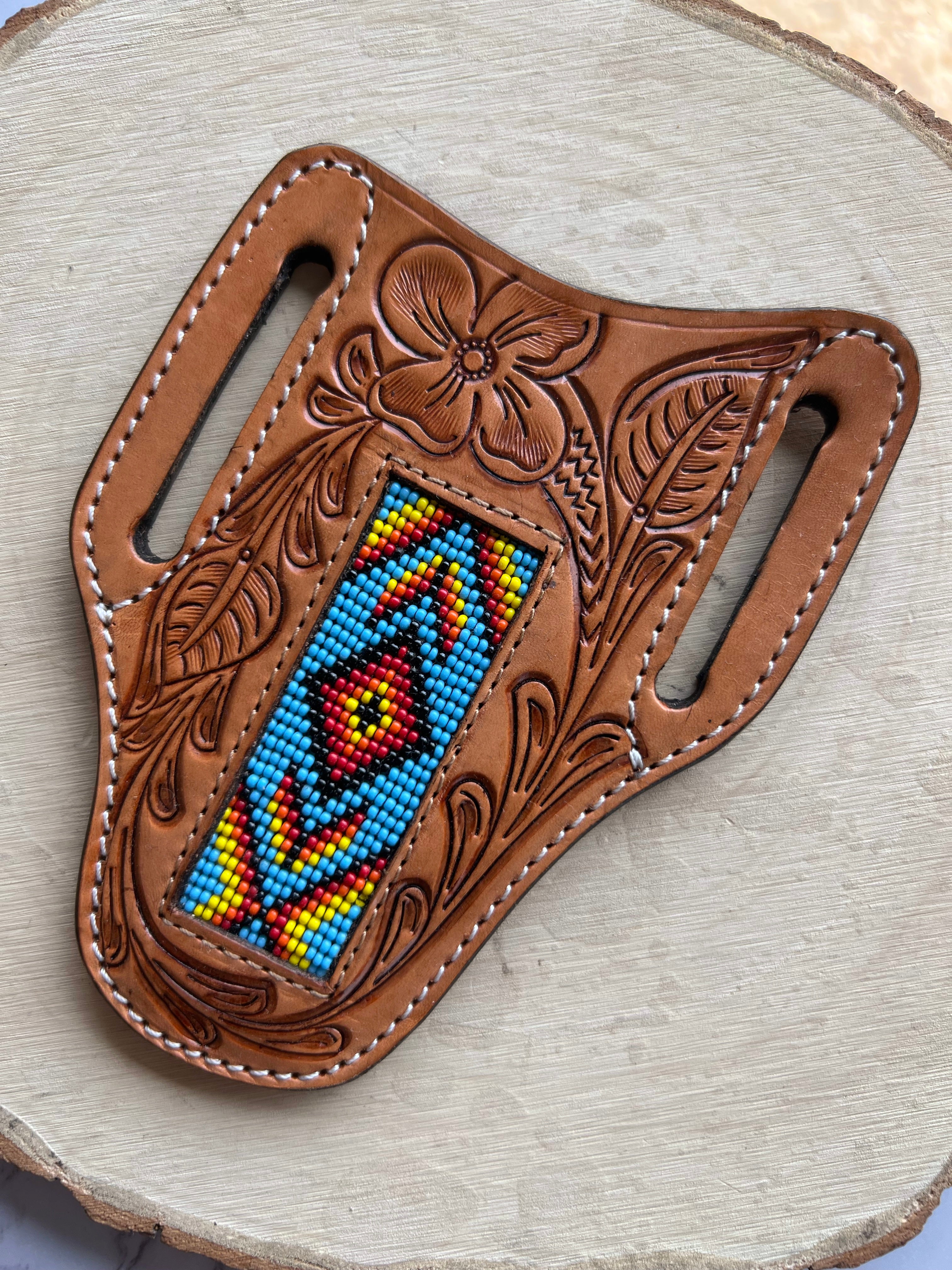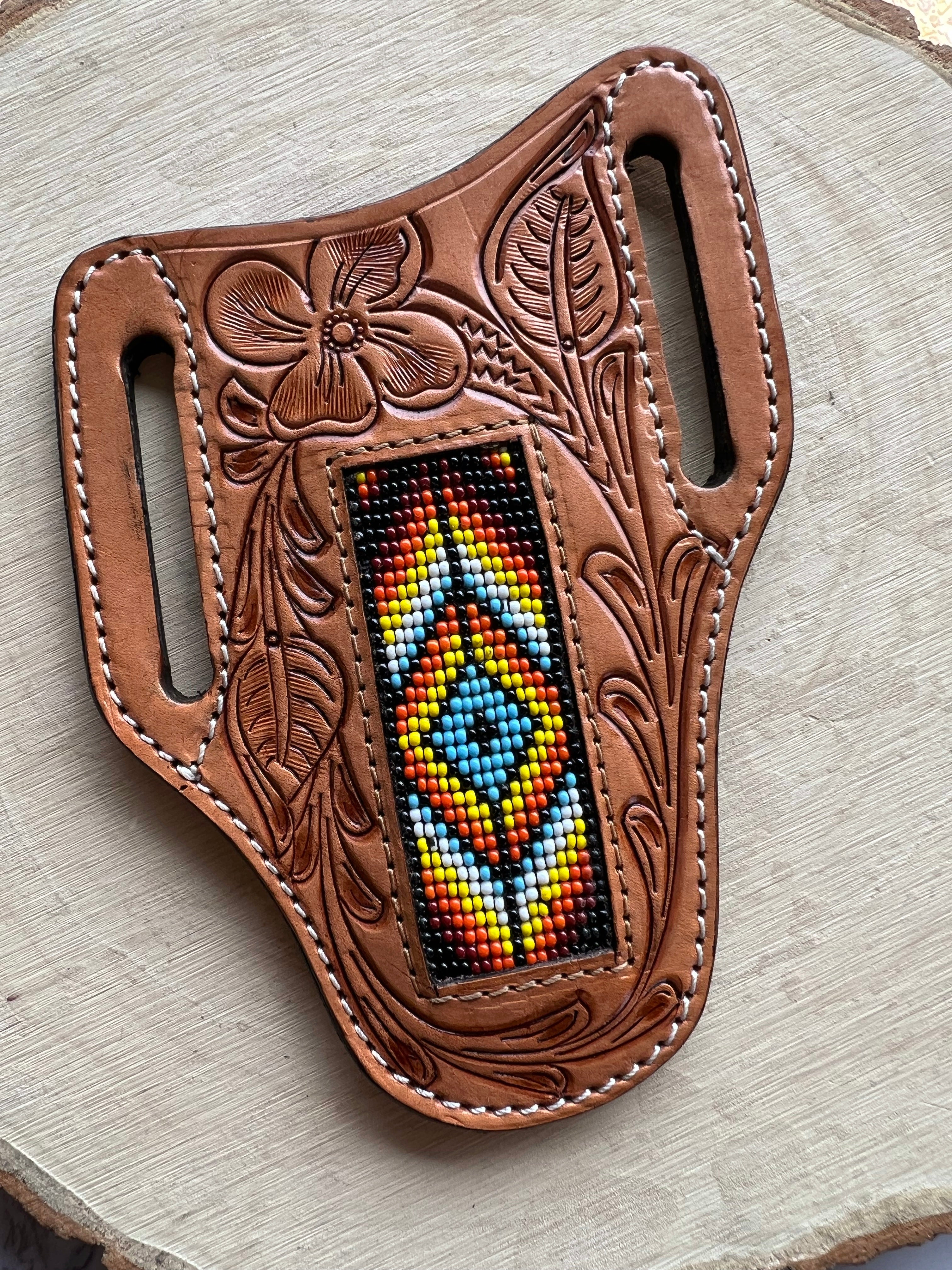 Honey Hand-Tooled With a Side Colorful Triangle Beaded Knife Sheath