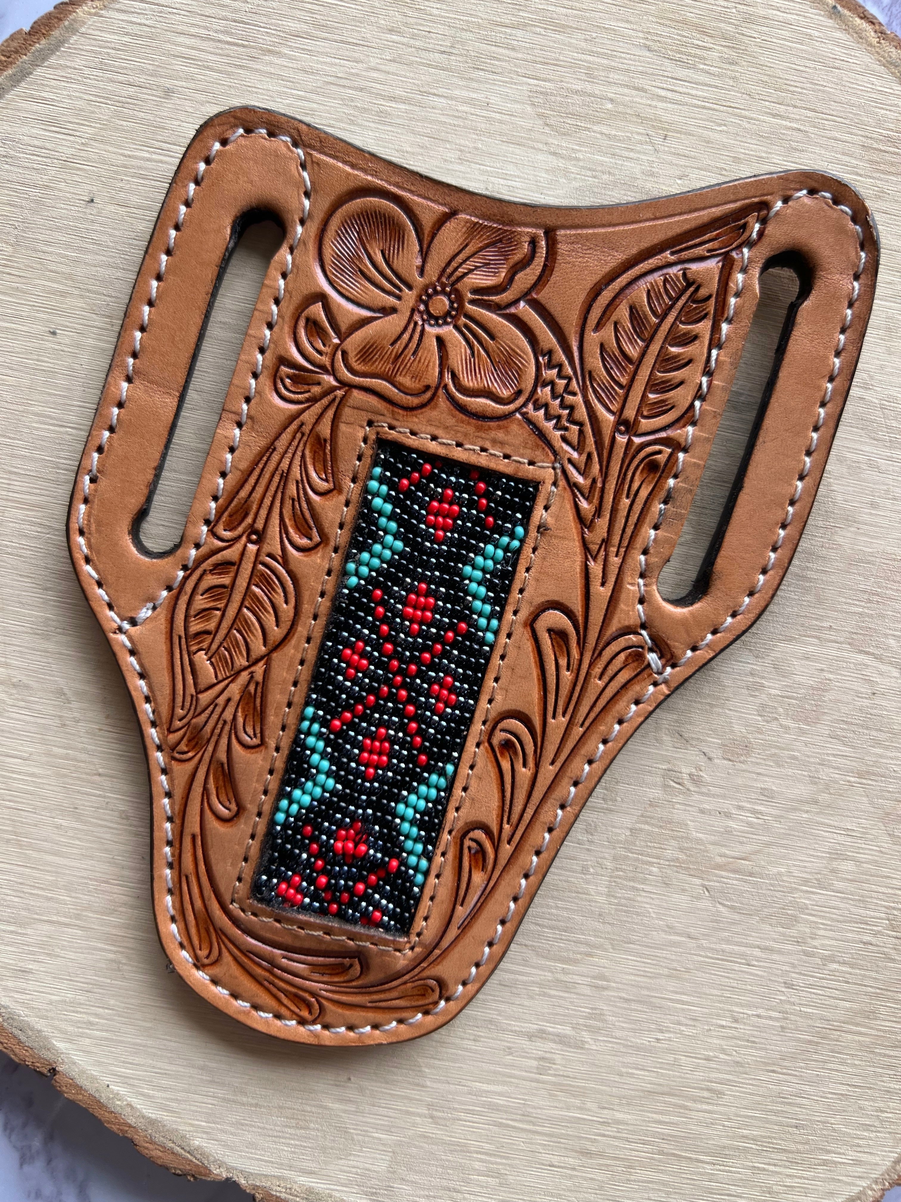 Honey Hand-Tooled With Black, Red and Green Beaded Knife Sheath