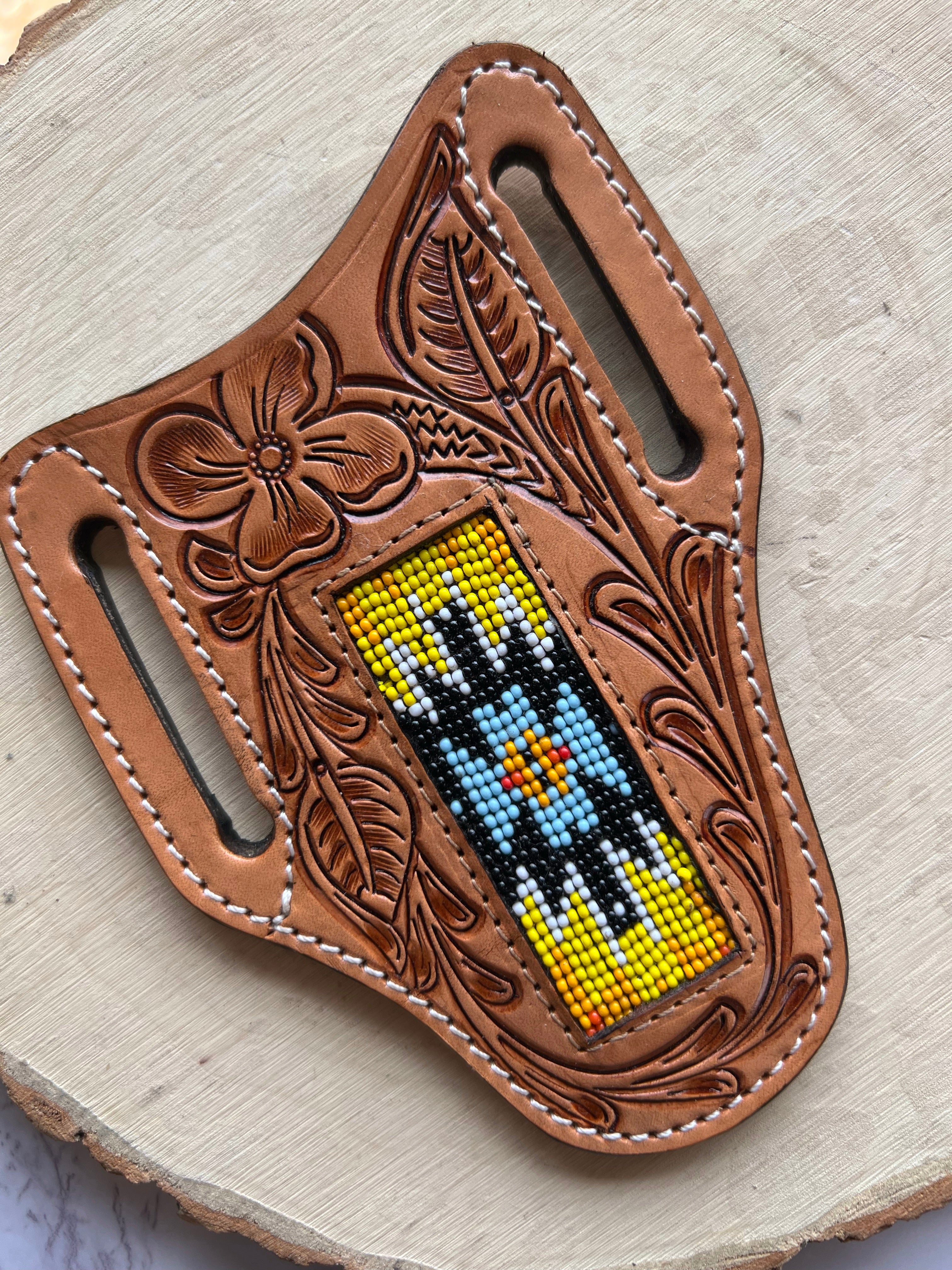 Honey Hand-tooled With Yellow and Black Beaded Knife Sheath