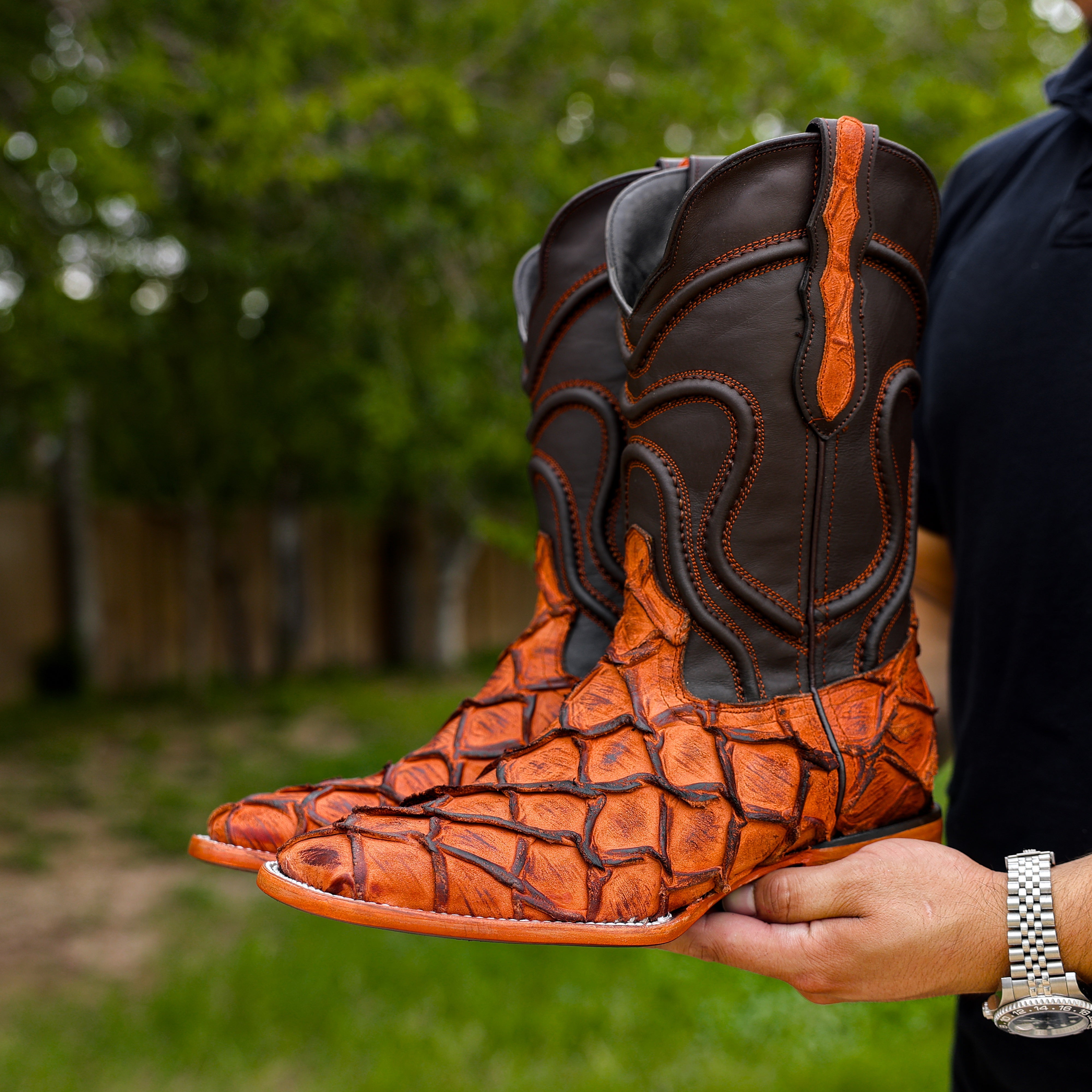 Matte Rustic Cognac Pirarucu Leather Boots - Square Toe