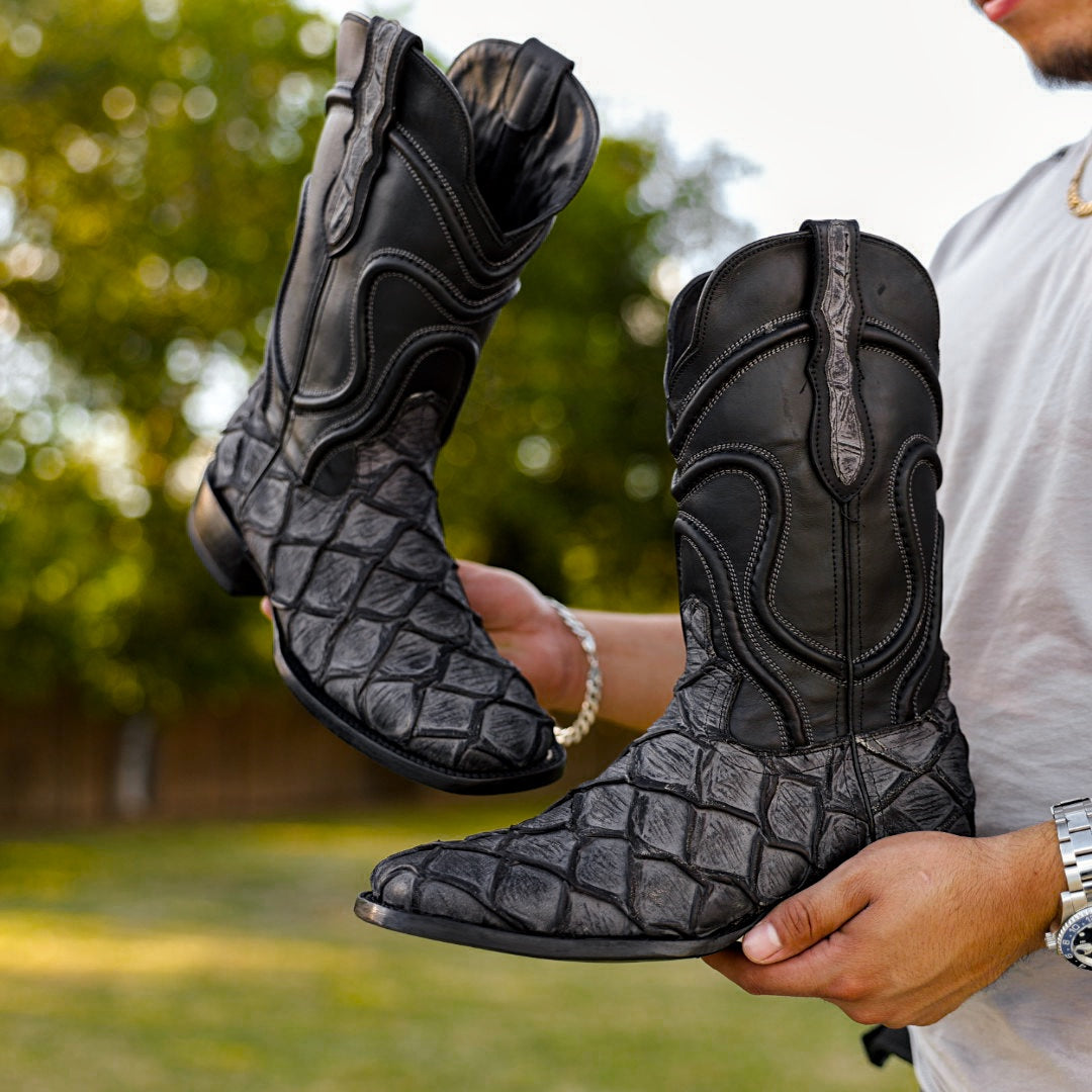 Meteorite Grey Rustic Pirarucu Leather Boots - Square Toe