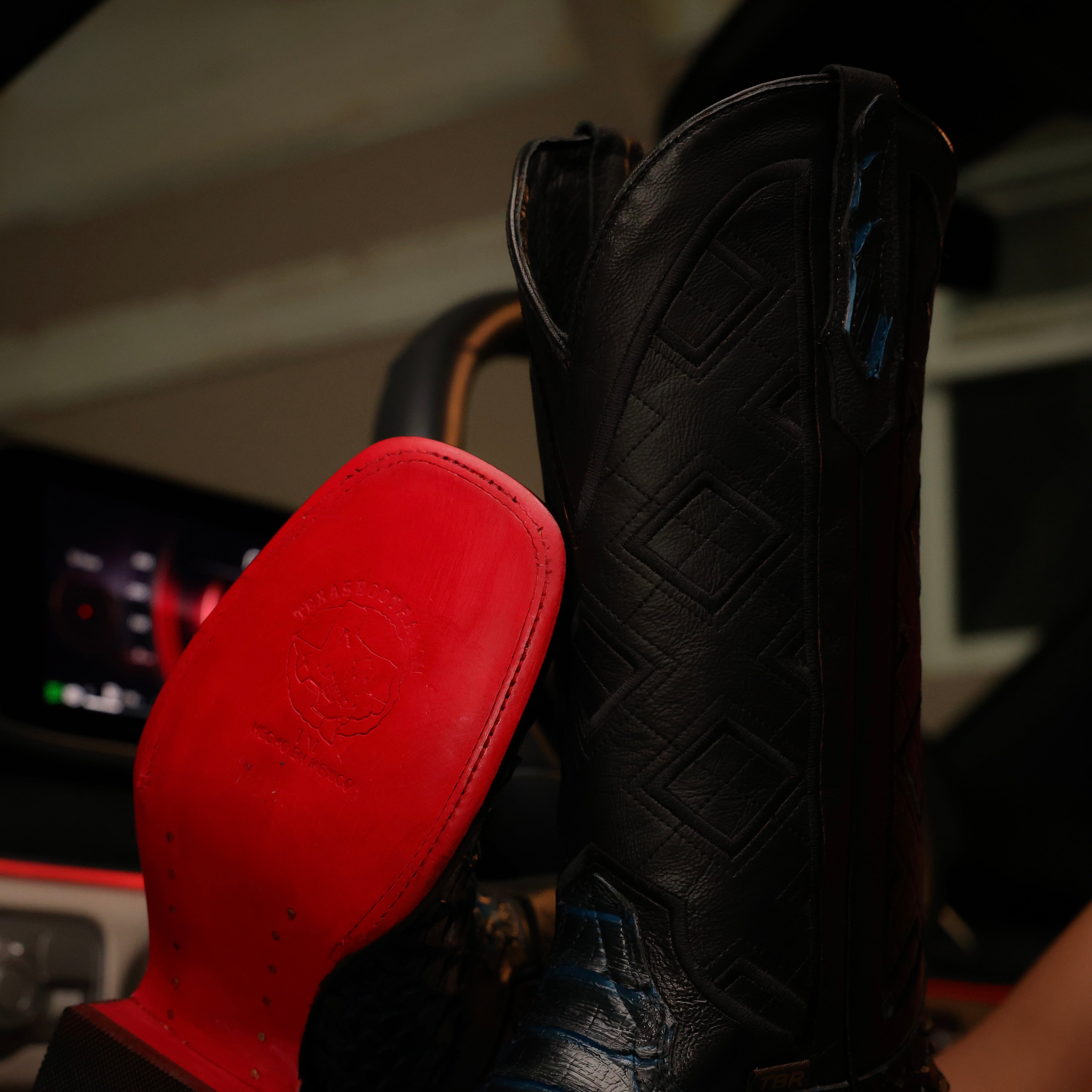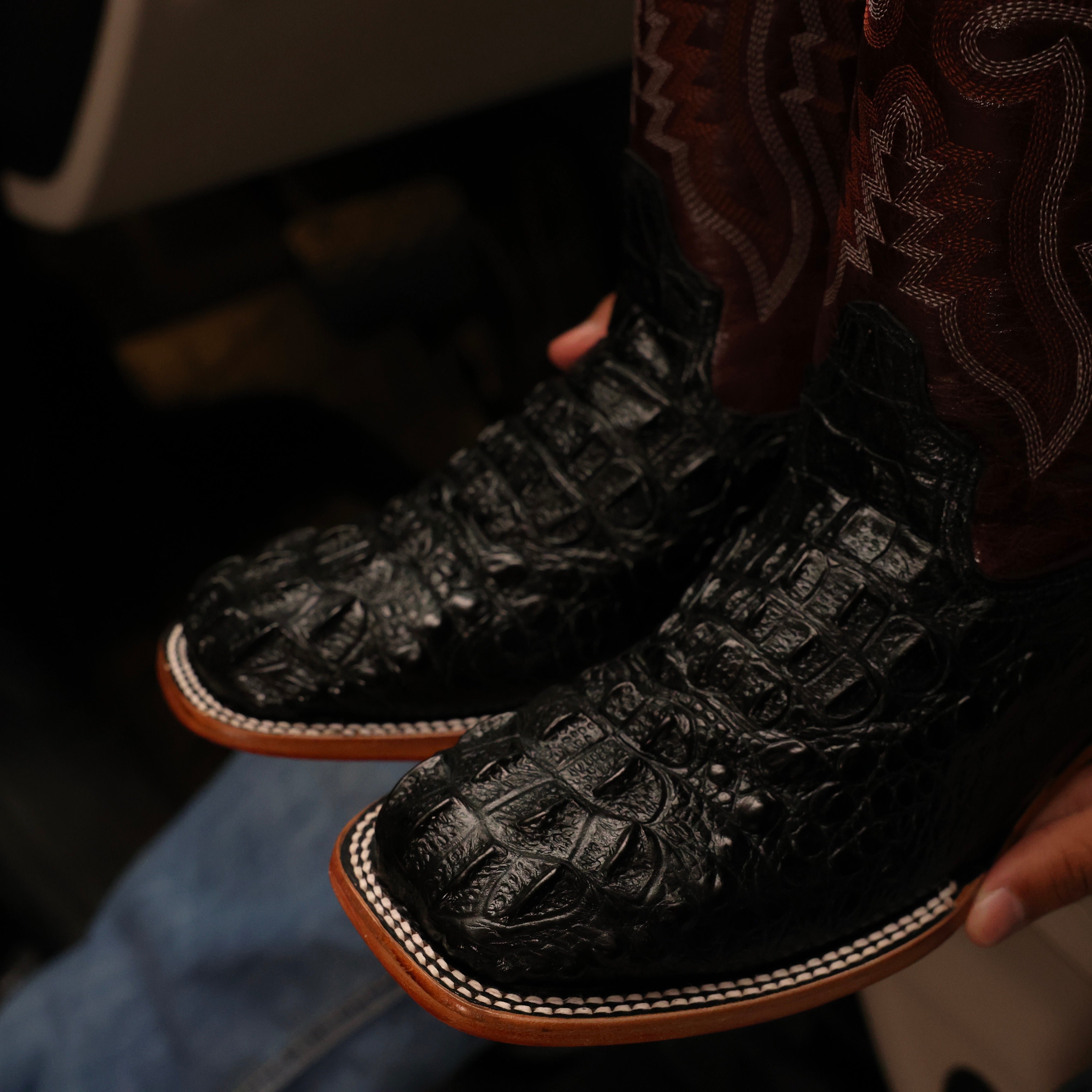 Black Caiman Leather Boots With Black Shaft - Square Toe
