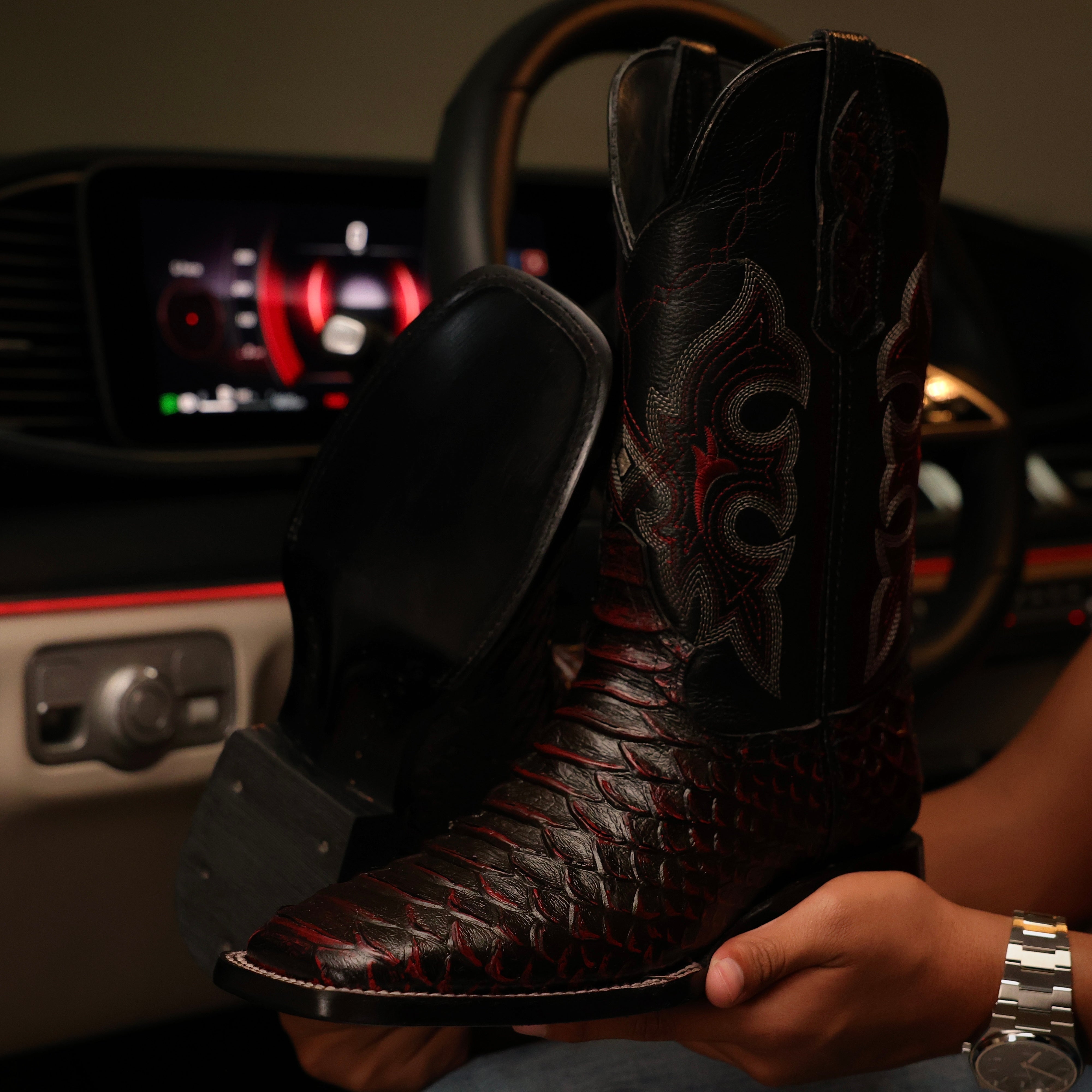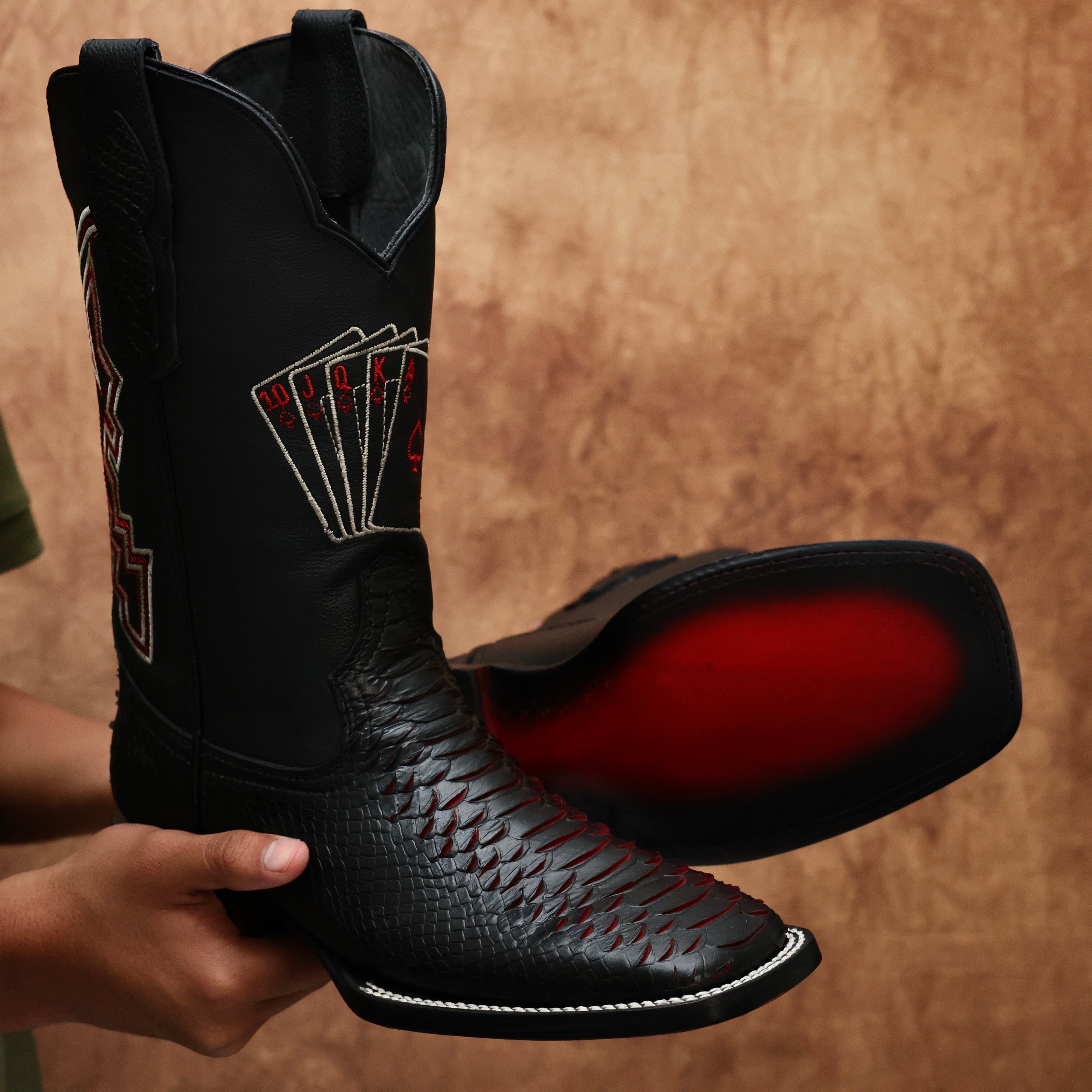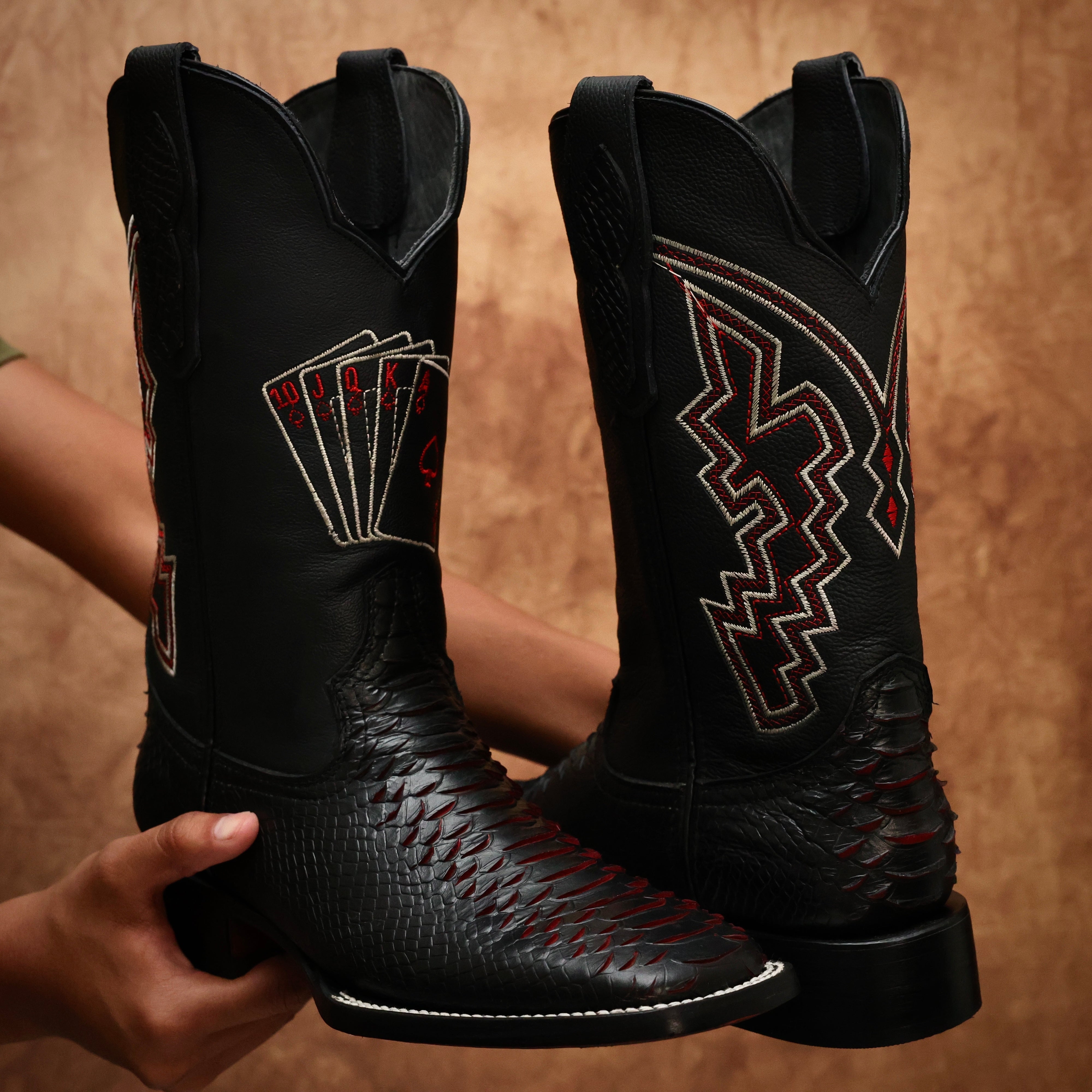 Black Cherry Anaconda Leather Boots - Square Toe