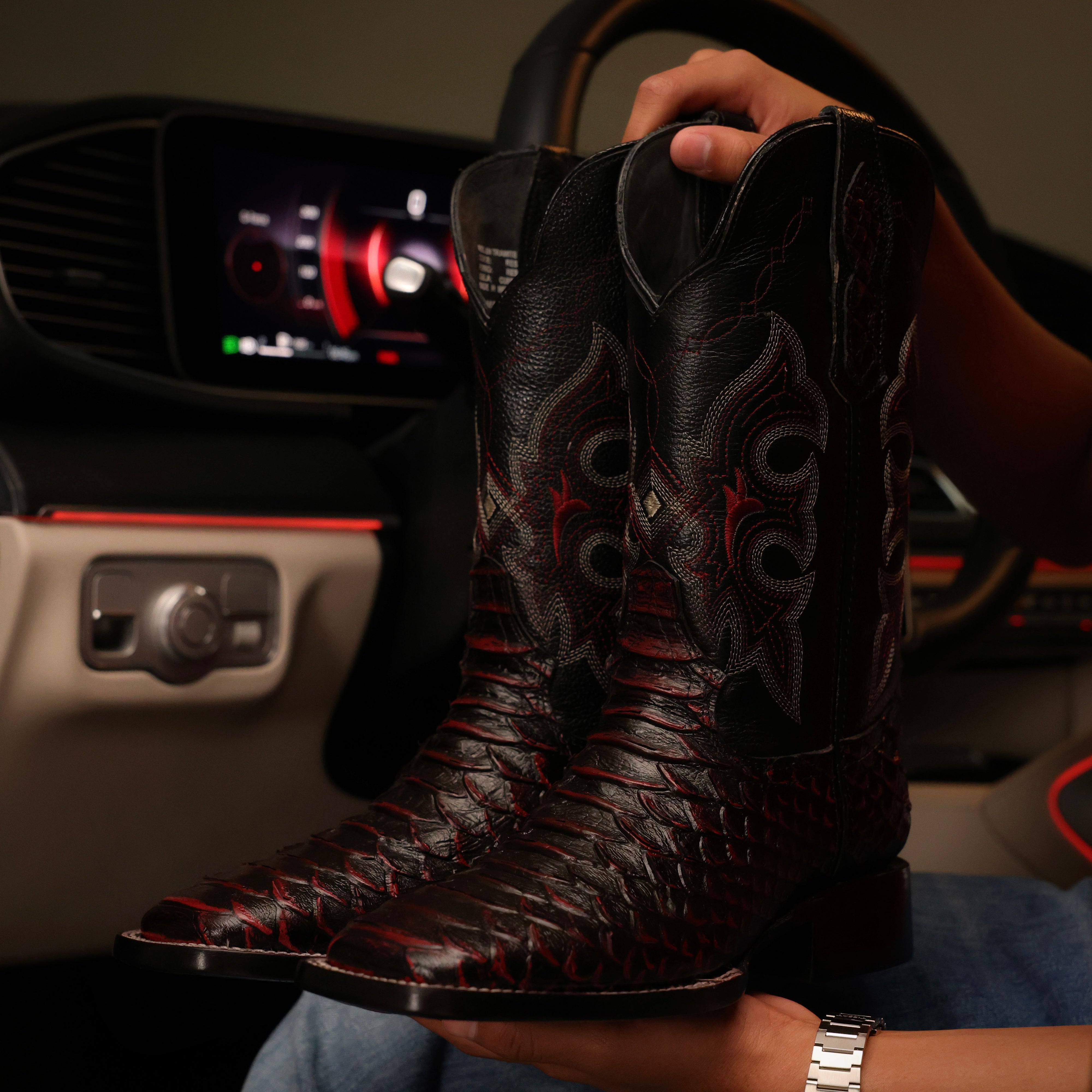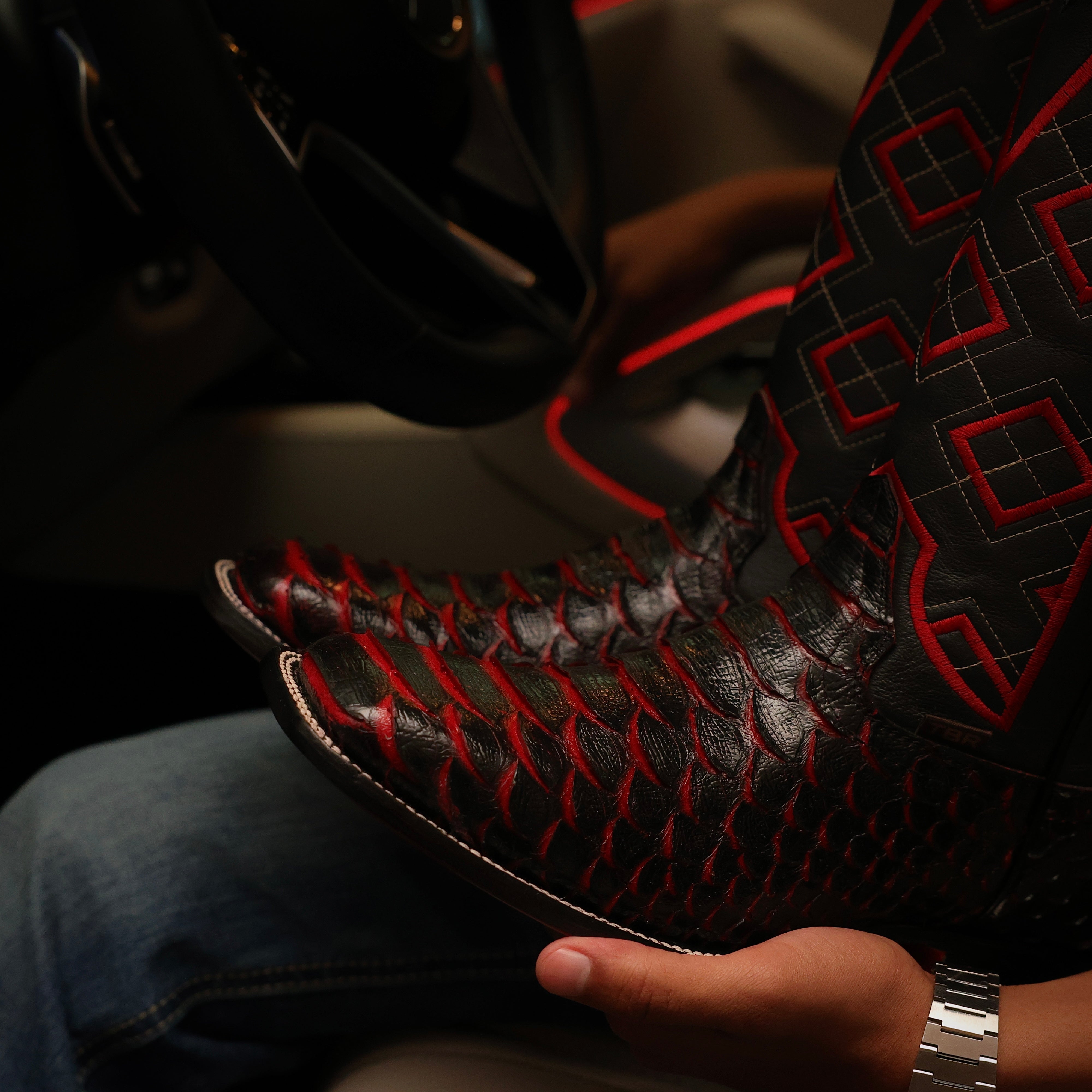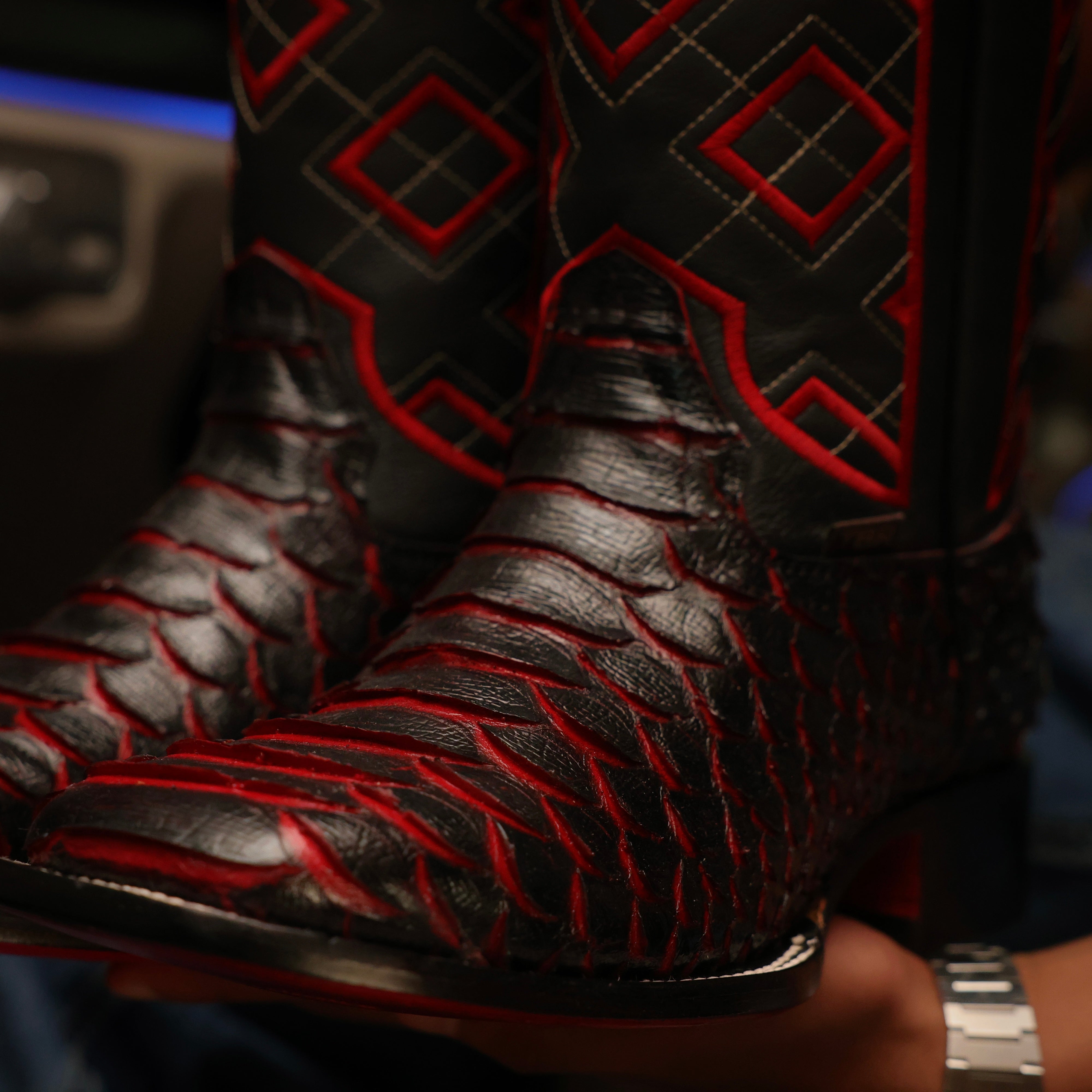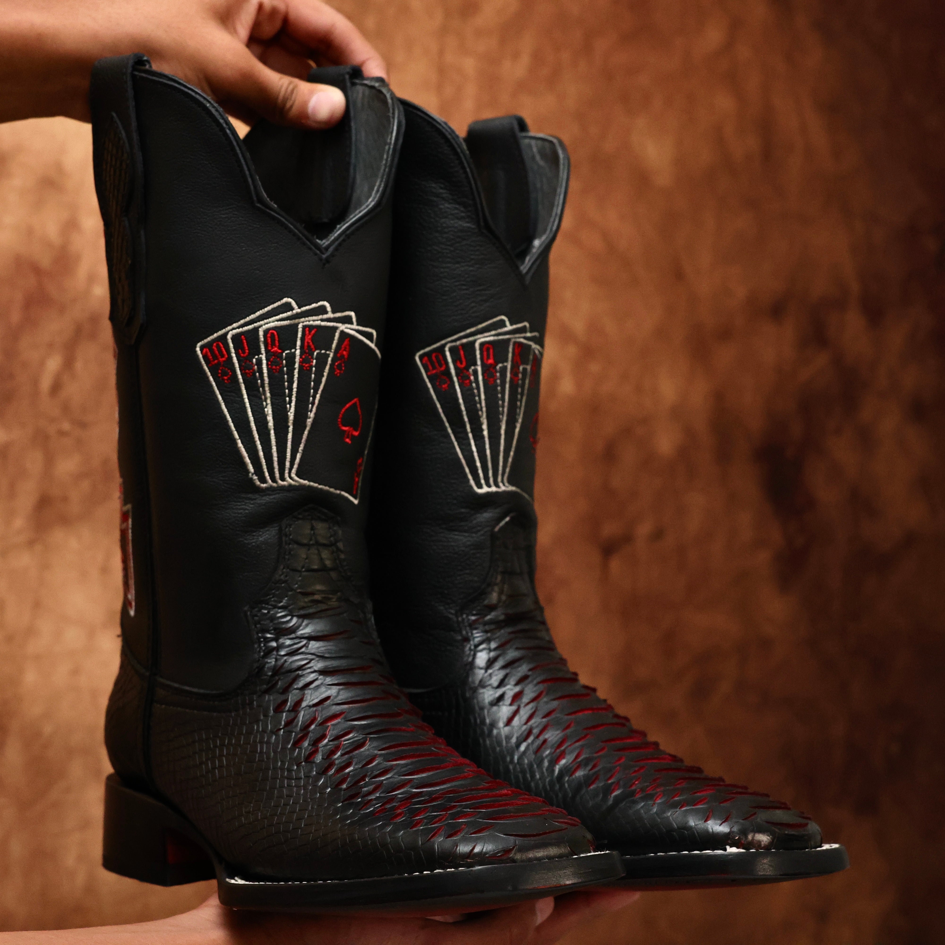 Black Cherry Anaconda Leather Boots - Square Toe
