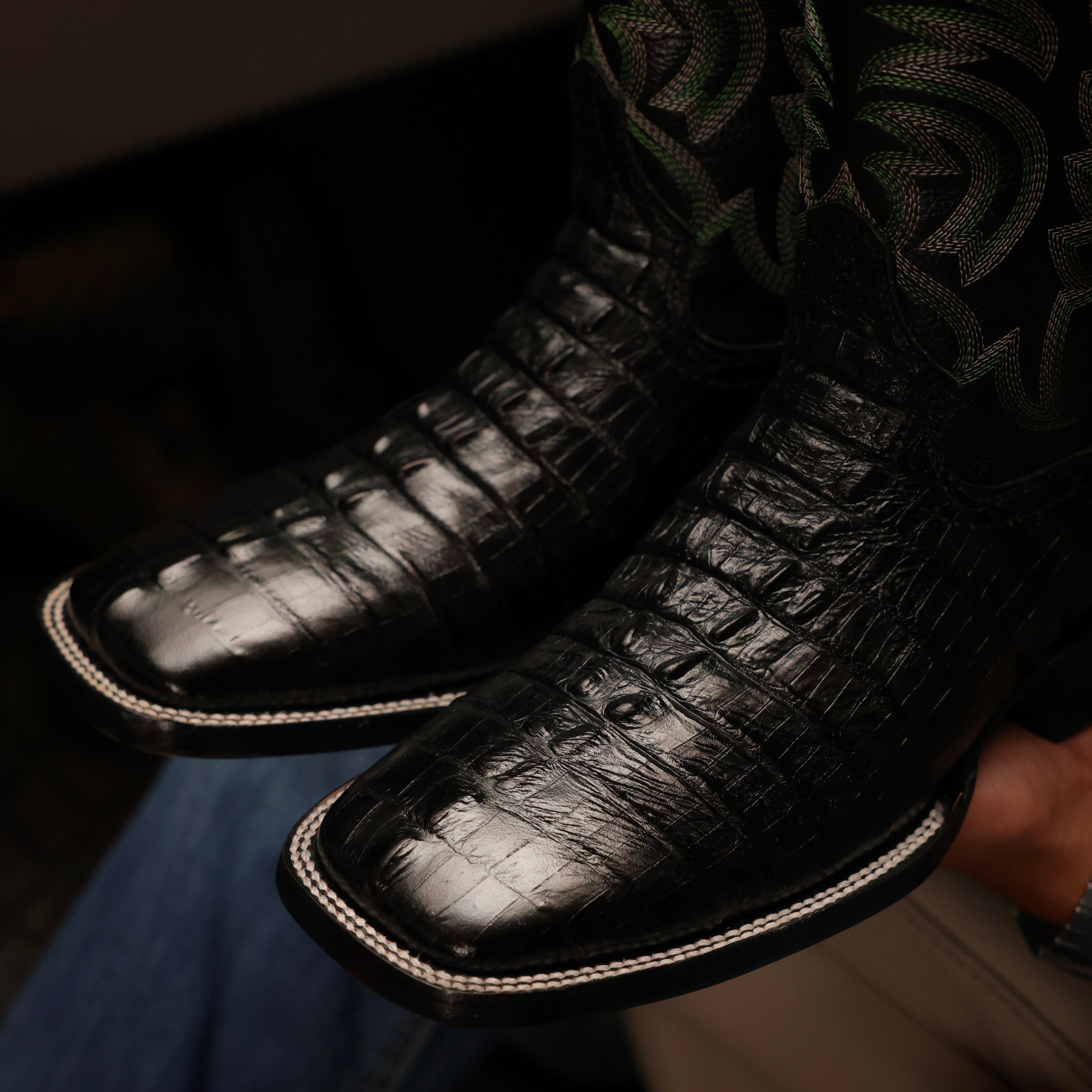 Black Caiman Leather Boots - Square Toe