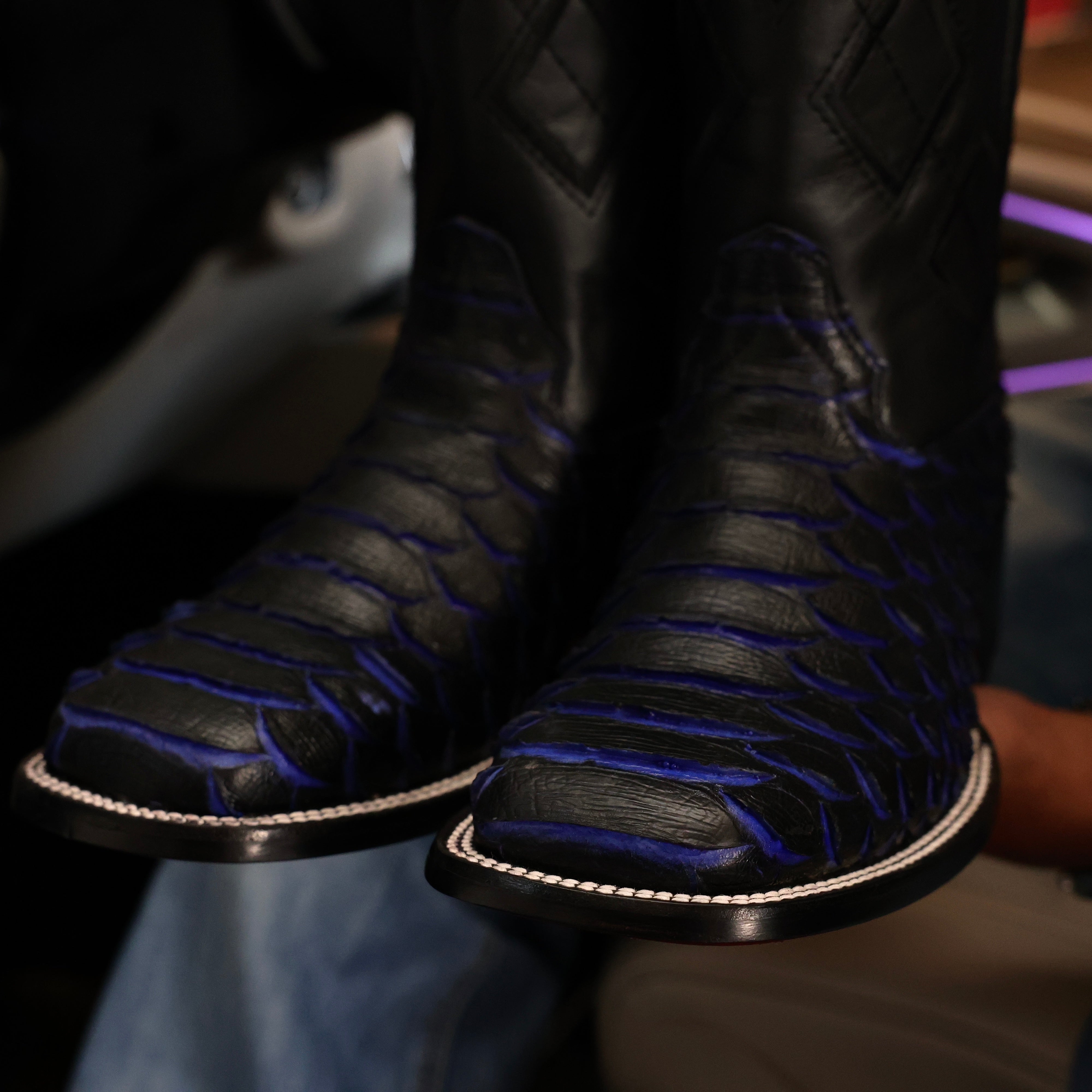 Black & Indigo Jumbo Python Leather Boots - Square Toe