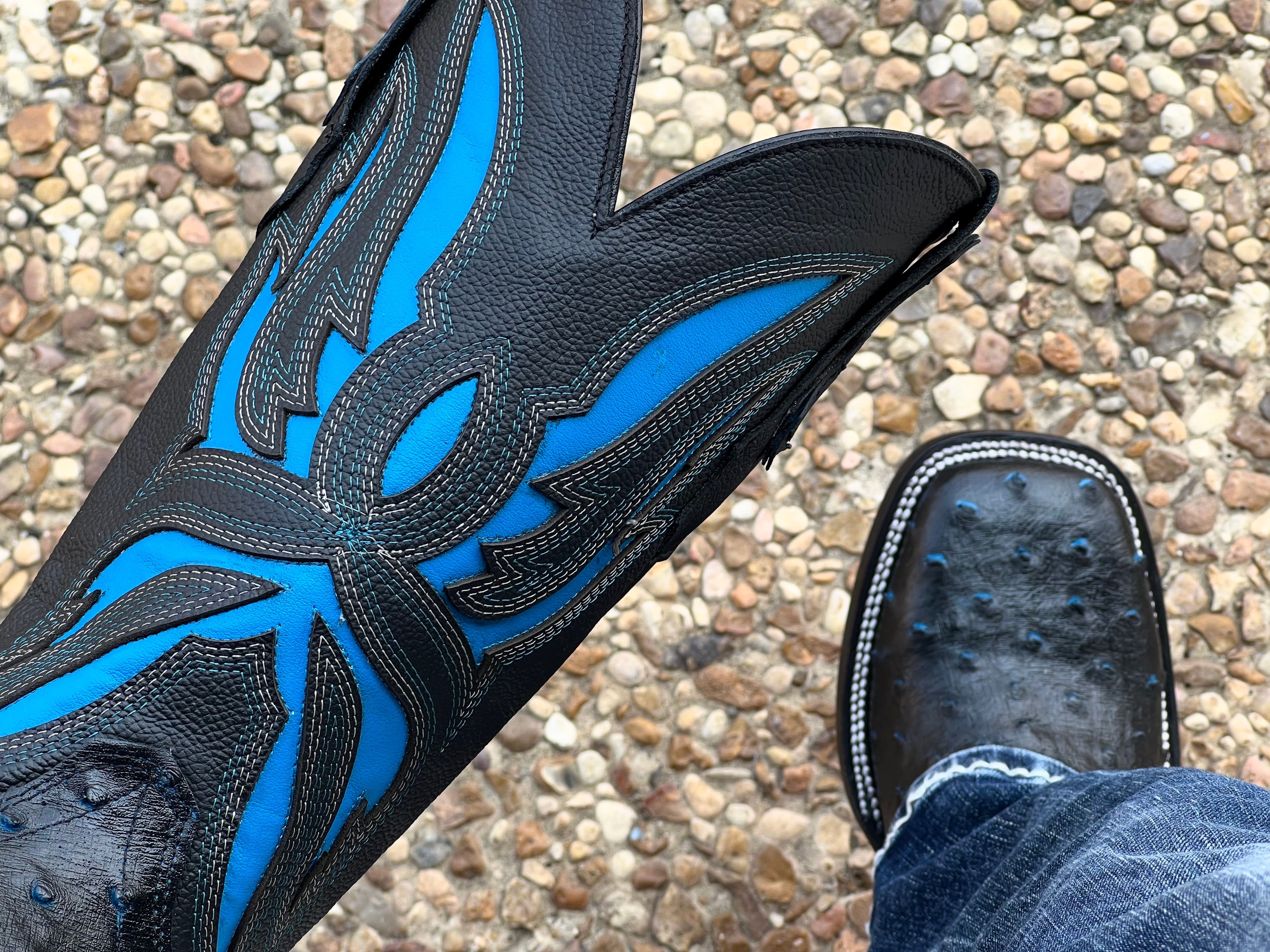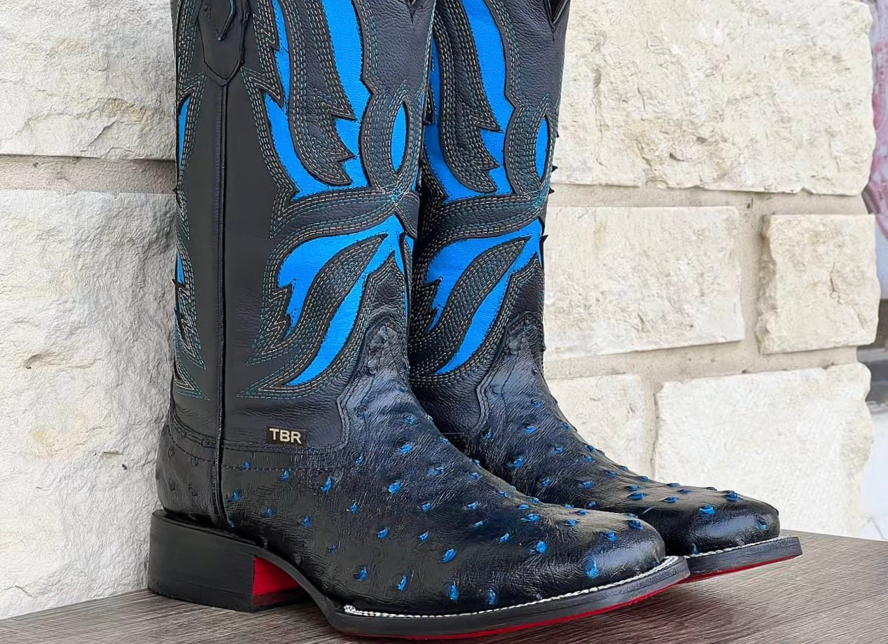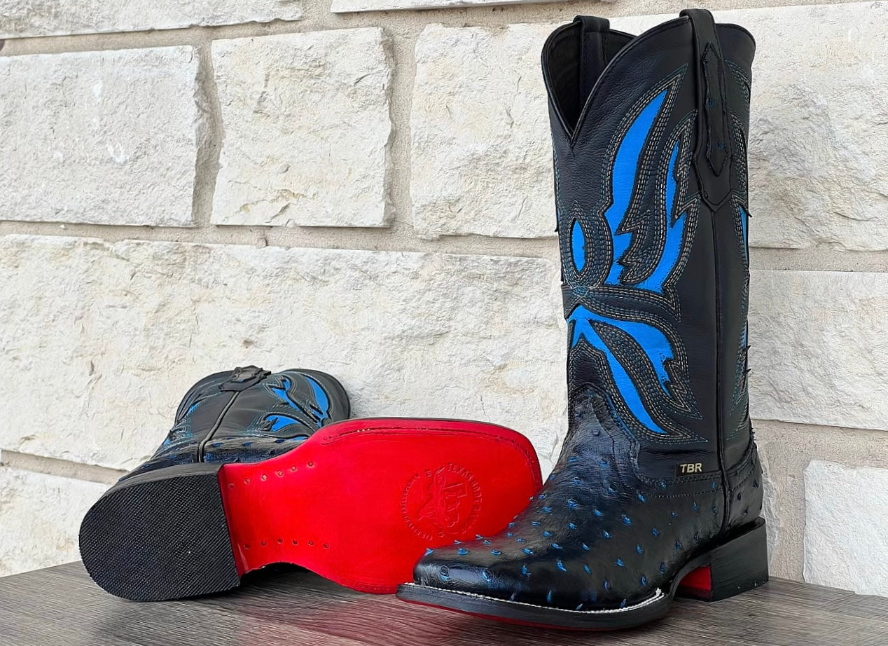 Men’s Black-Blue Ostrich Leather Boots With Red Soles
