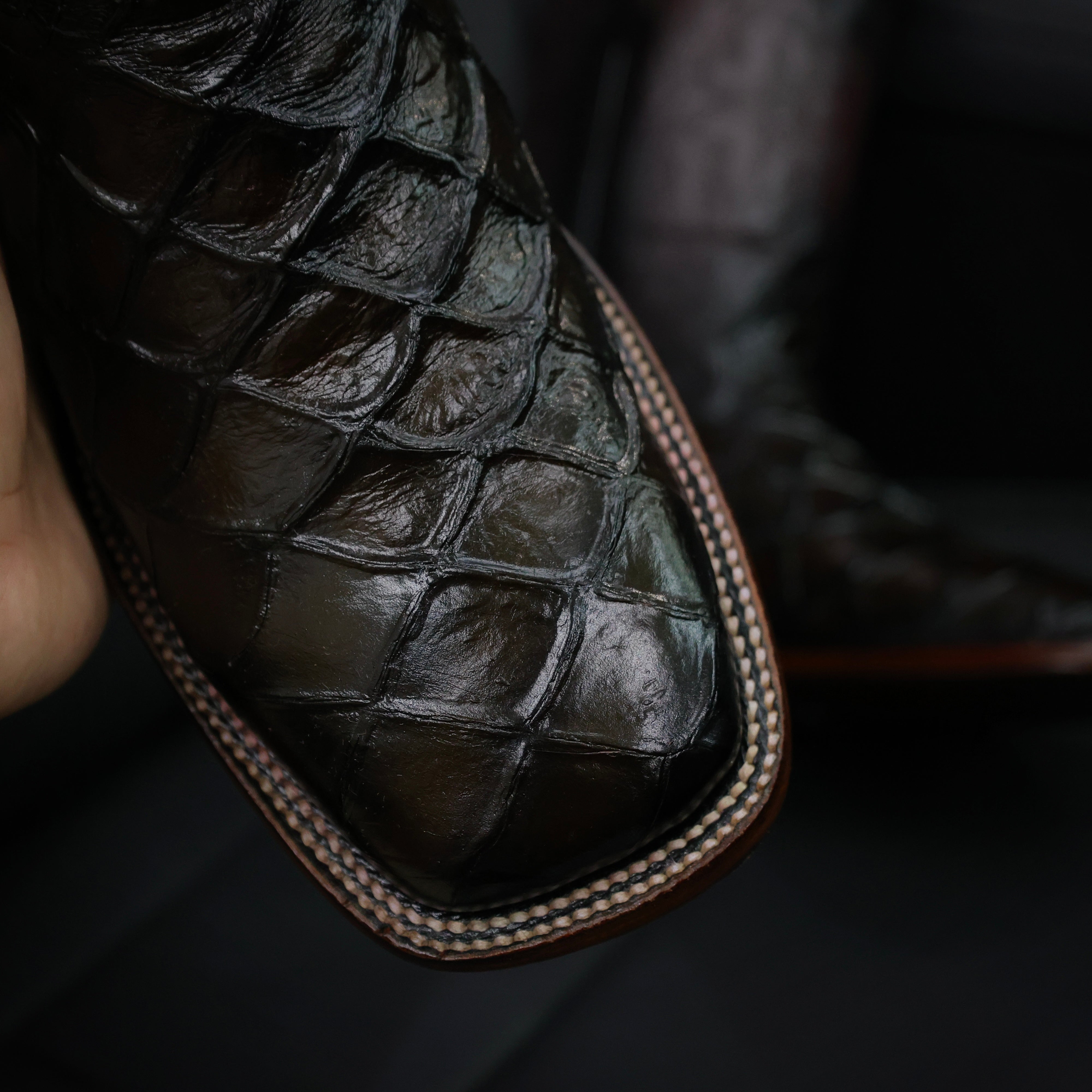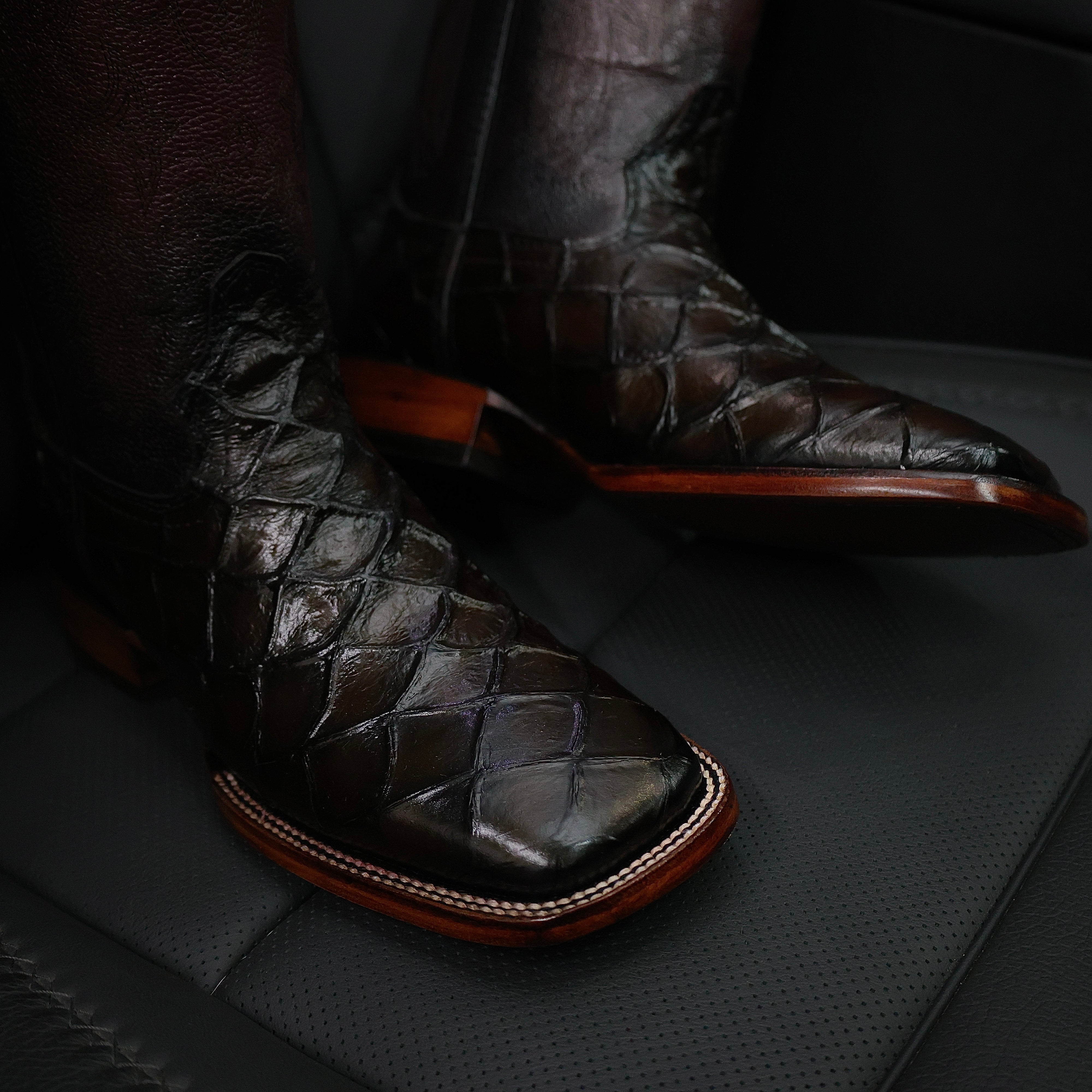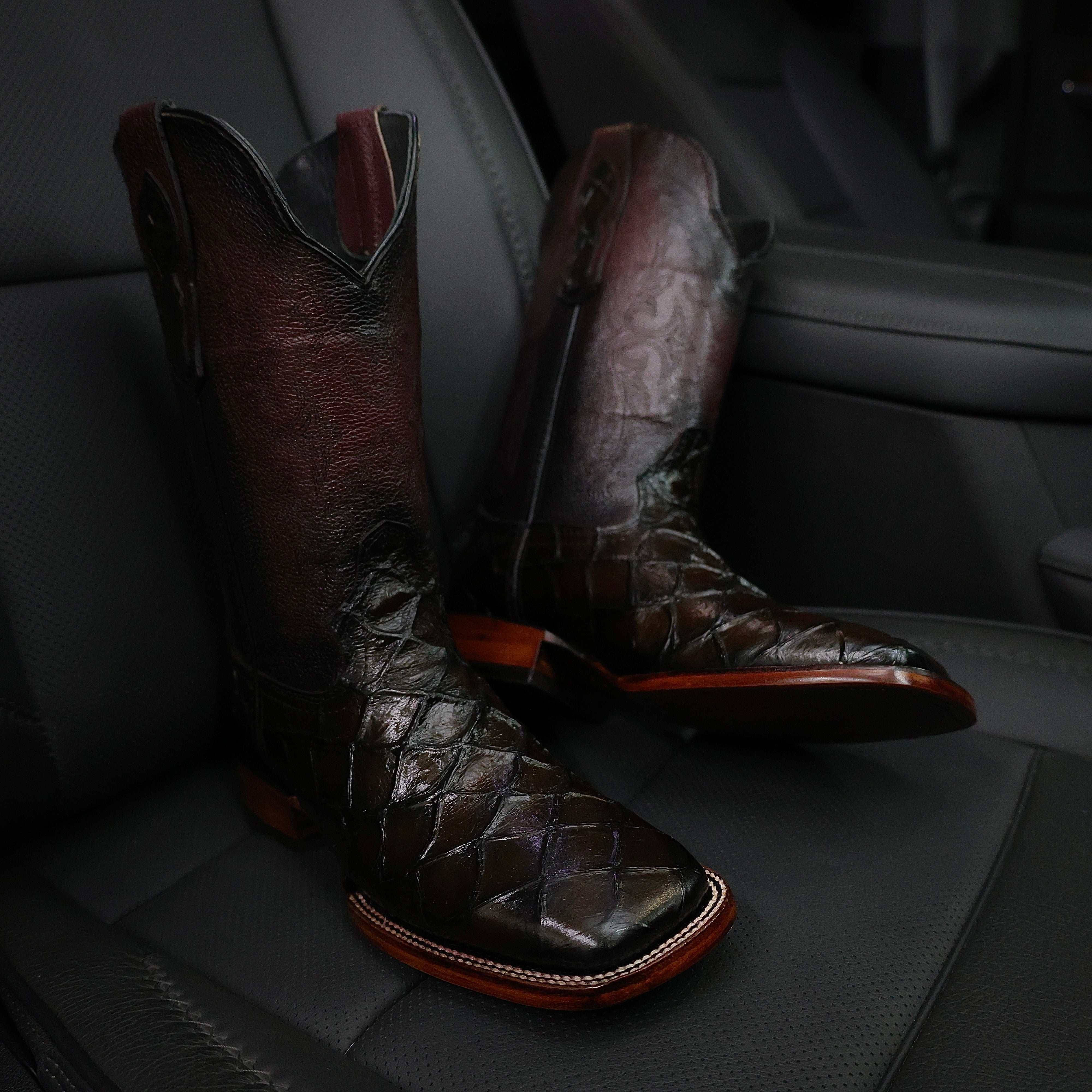 Dark Wine Pirarucu Leather Boots — Square Toe
