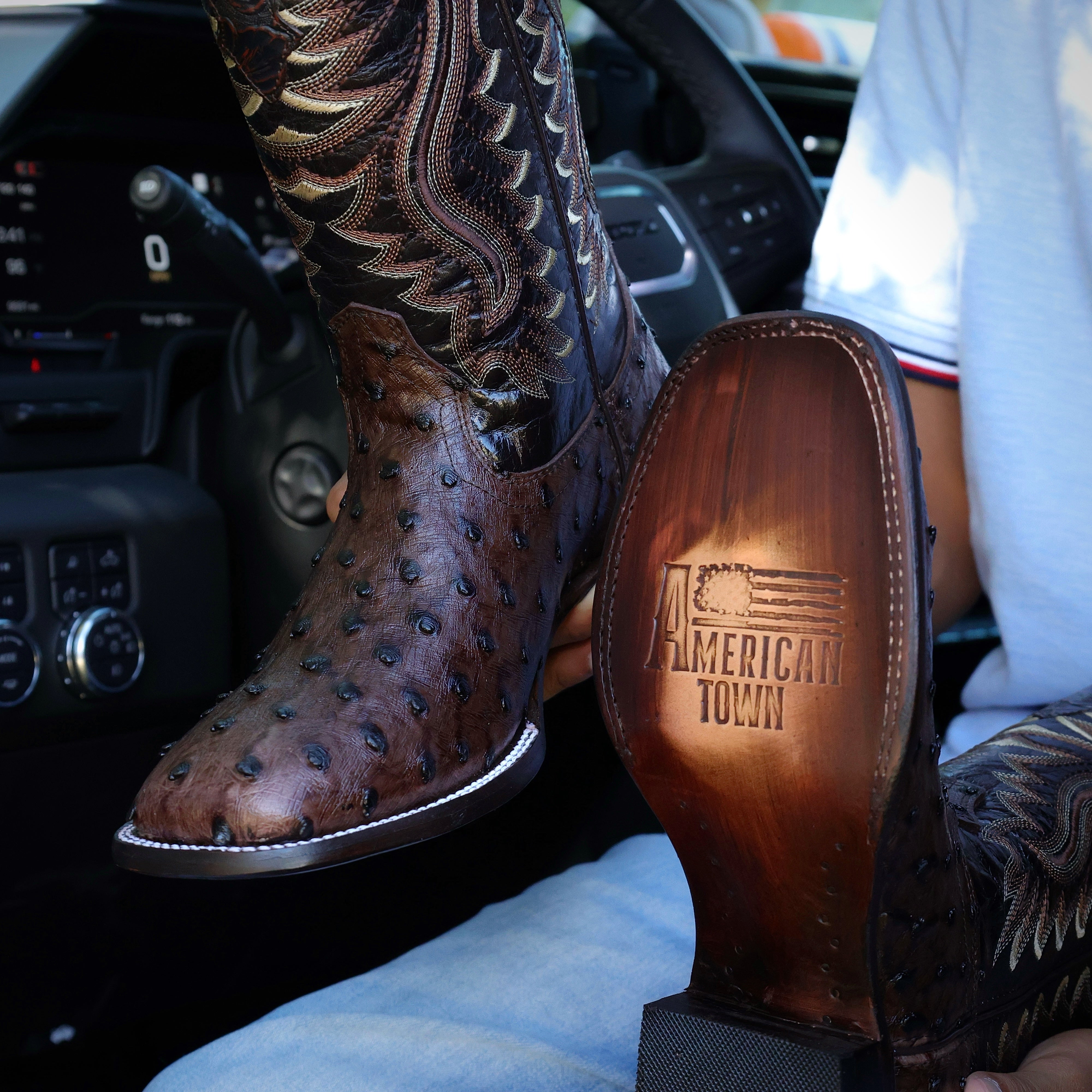 Men’s Chocolate Brown Genuine Ostrich Boots — Square Toe