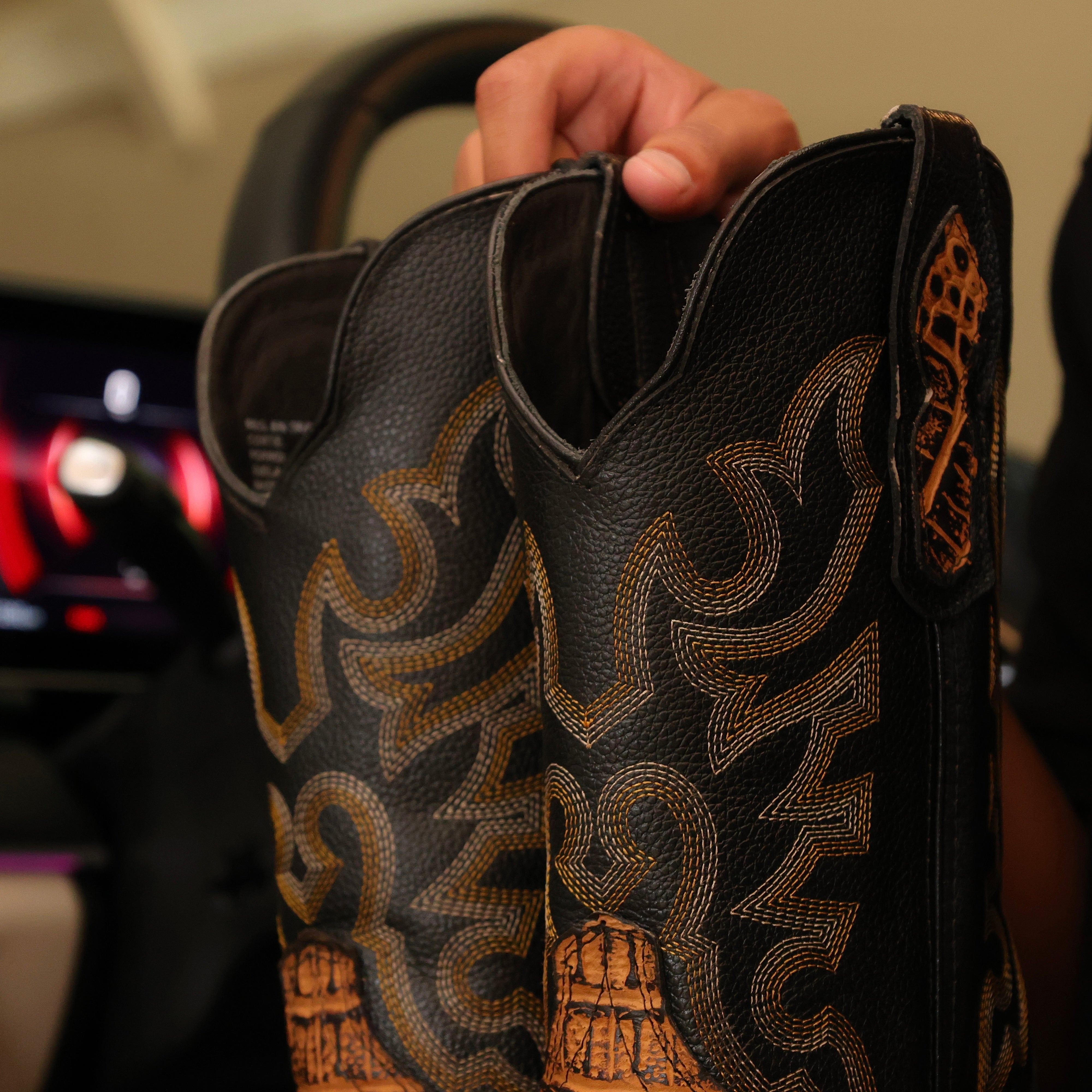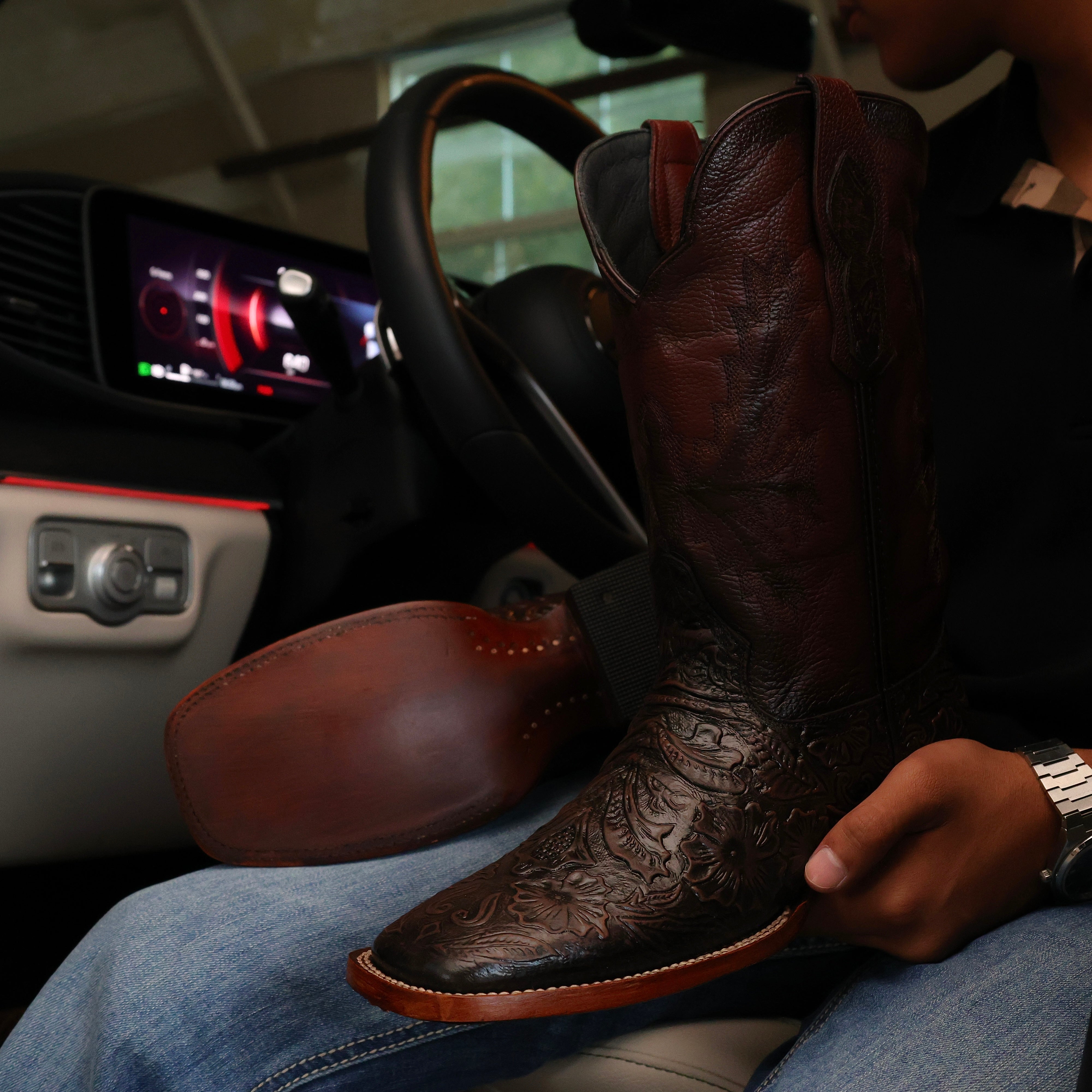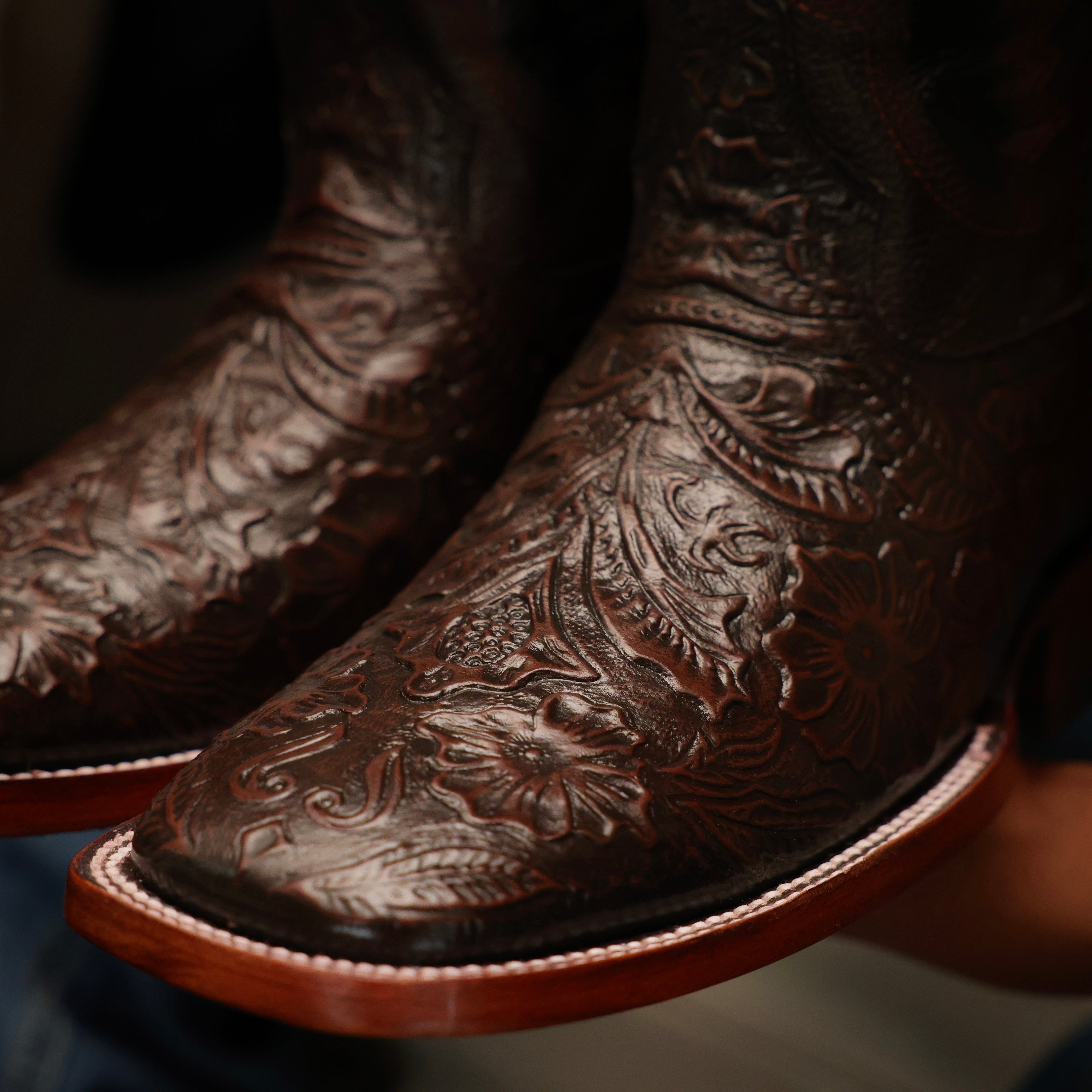 Chocolate Brown Hand-Tooled Leather Boots — Square Toe