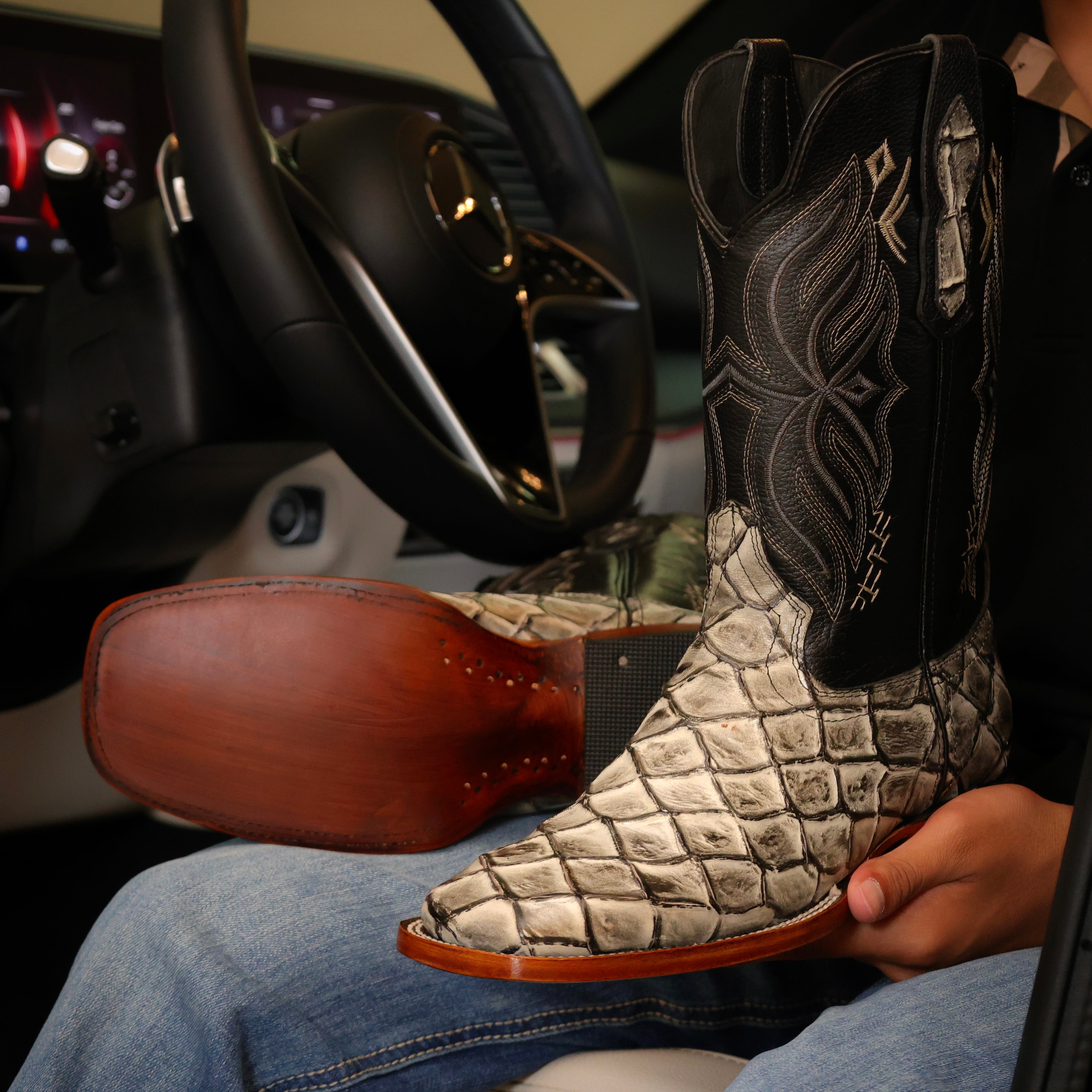 Grey Caimán Neck Leather Boots With Black Shaft — Square Toe