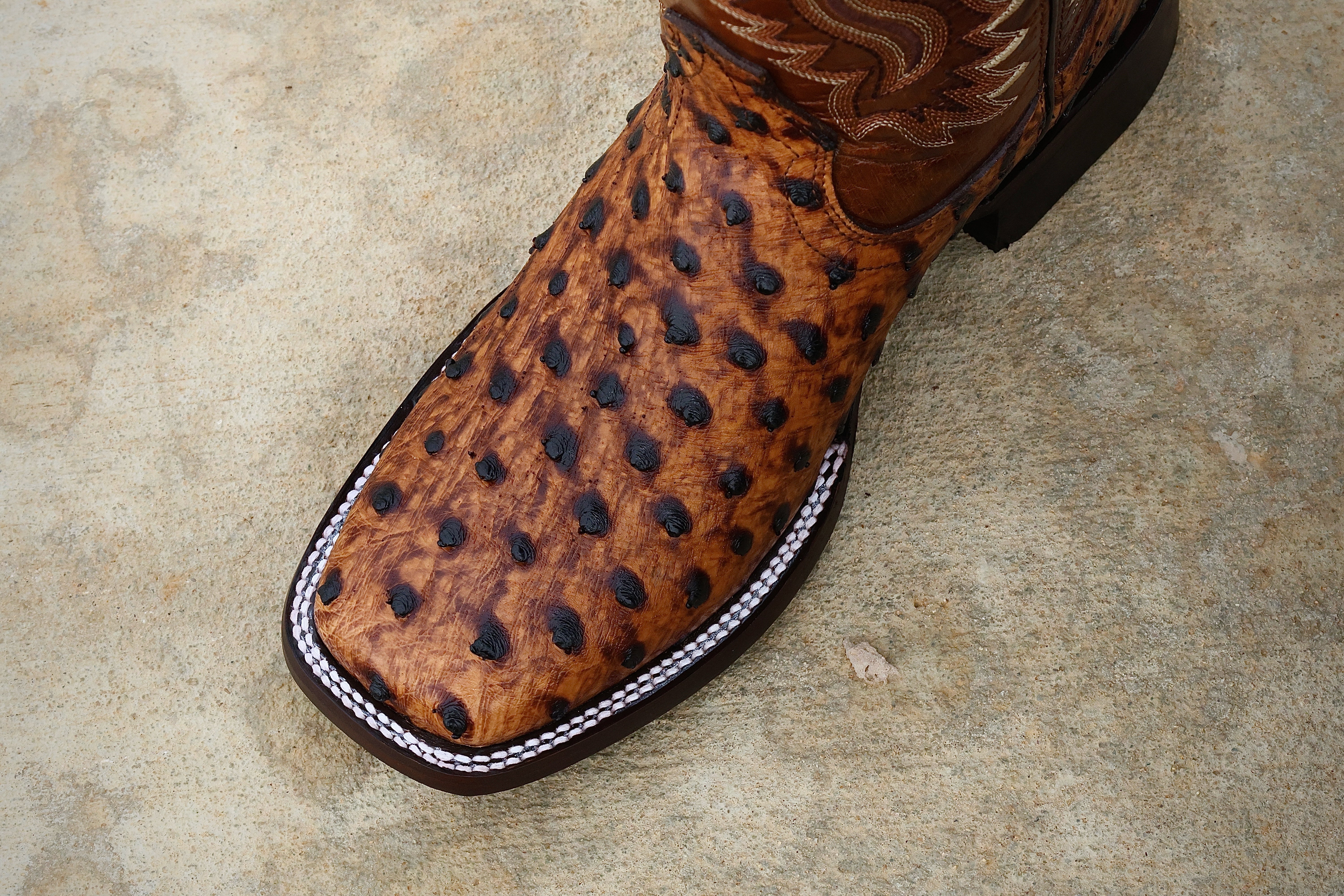 Cognac Ostrich Leather Boots — Square Toe