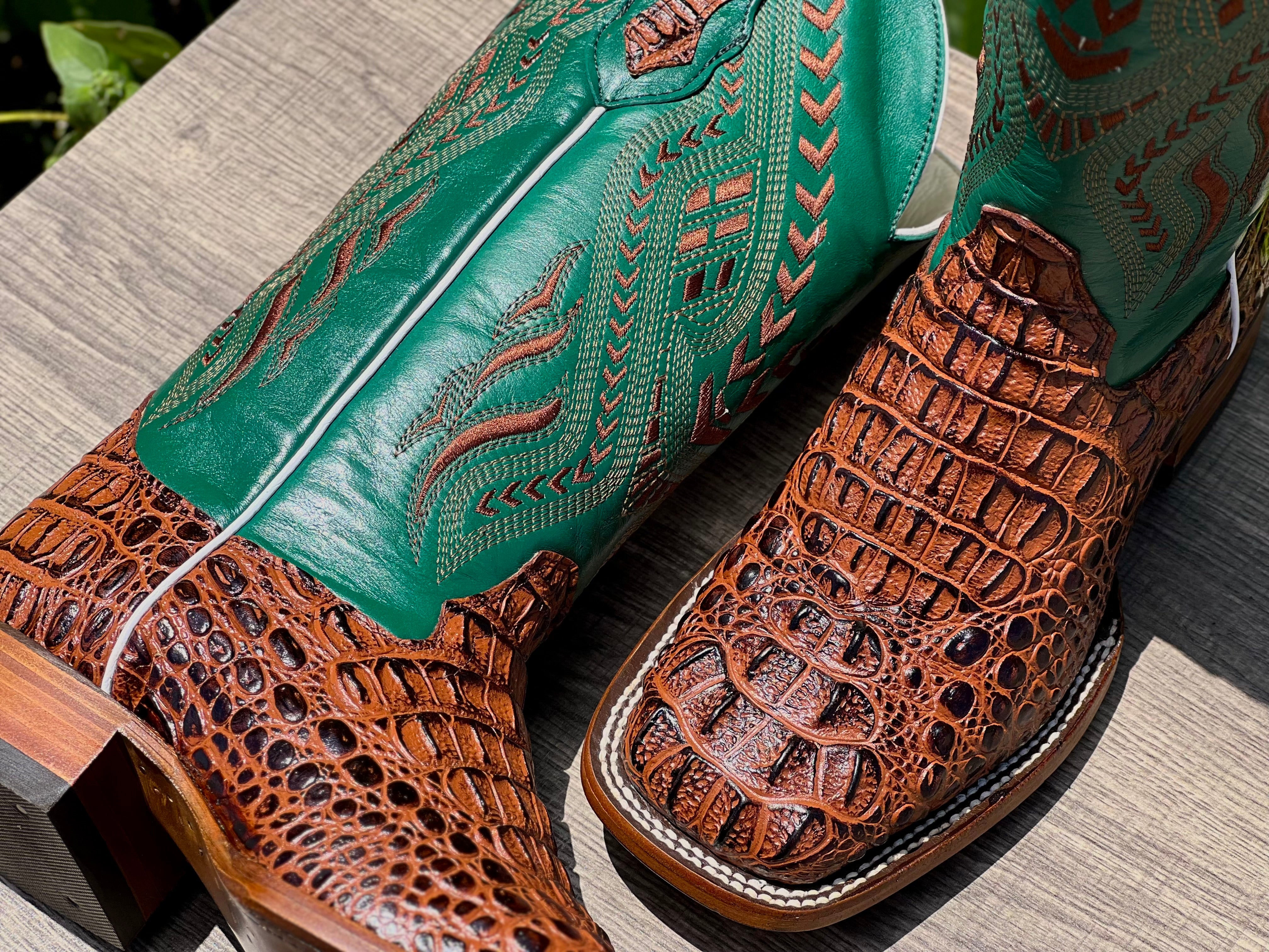 Men’s Cognac Crocodile Leather Boots With Green Shaft