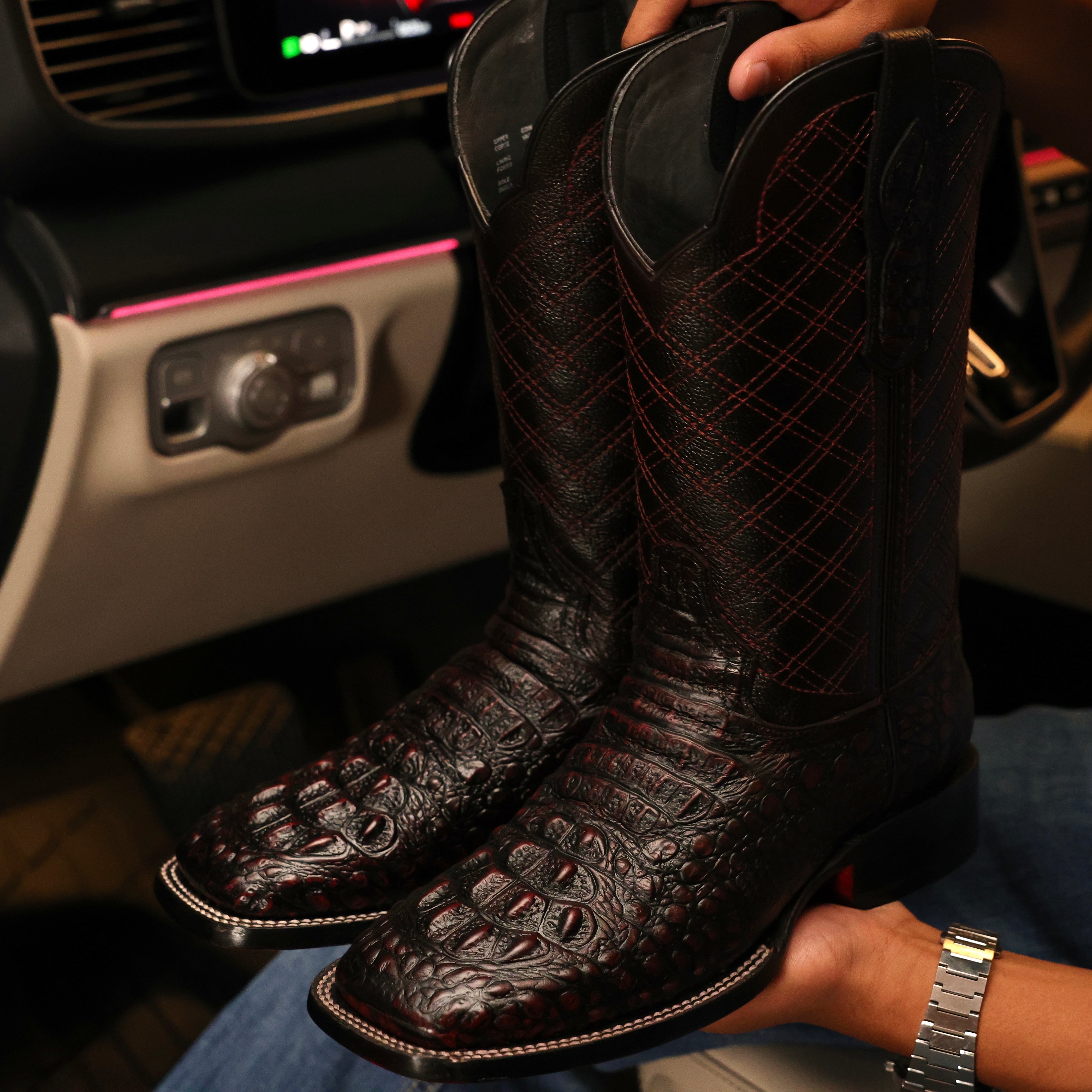Black Cherry Caiman Neck Leather Boots - Square Toe