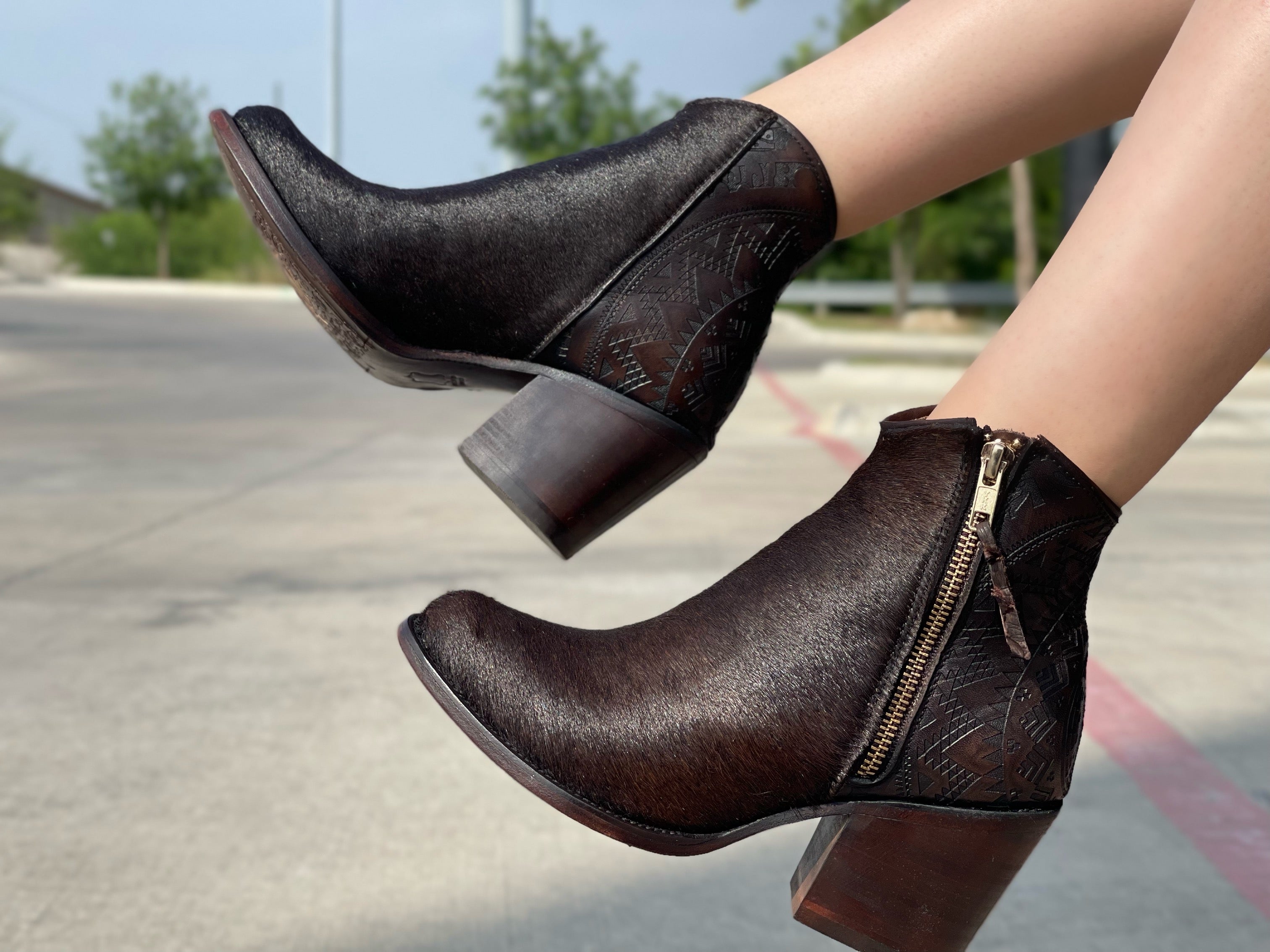 Women’s Brown CowHide Leather Ankle Booties With Floral Embroidery—Round Toe