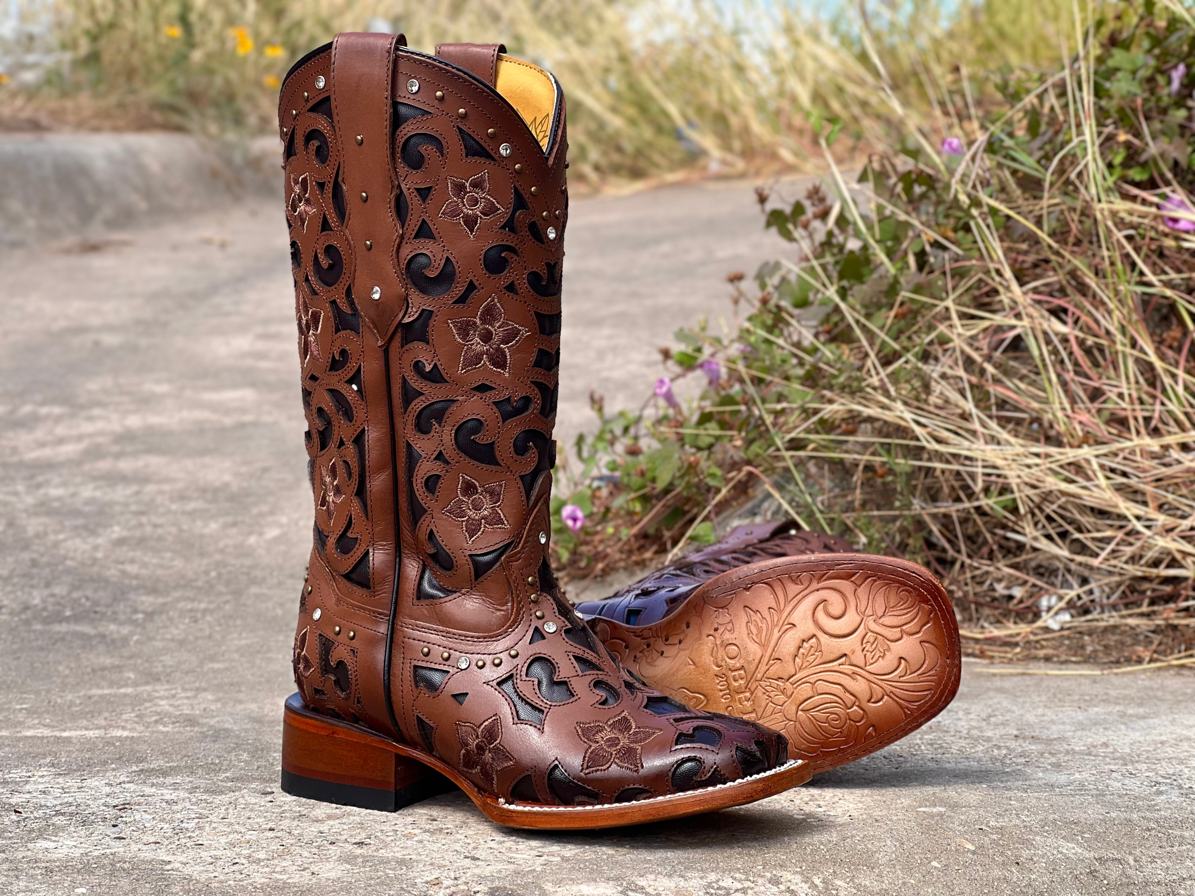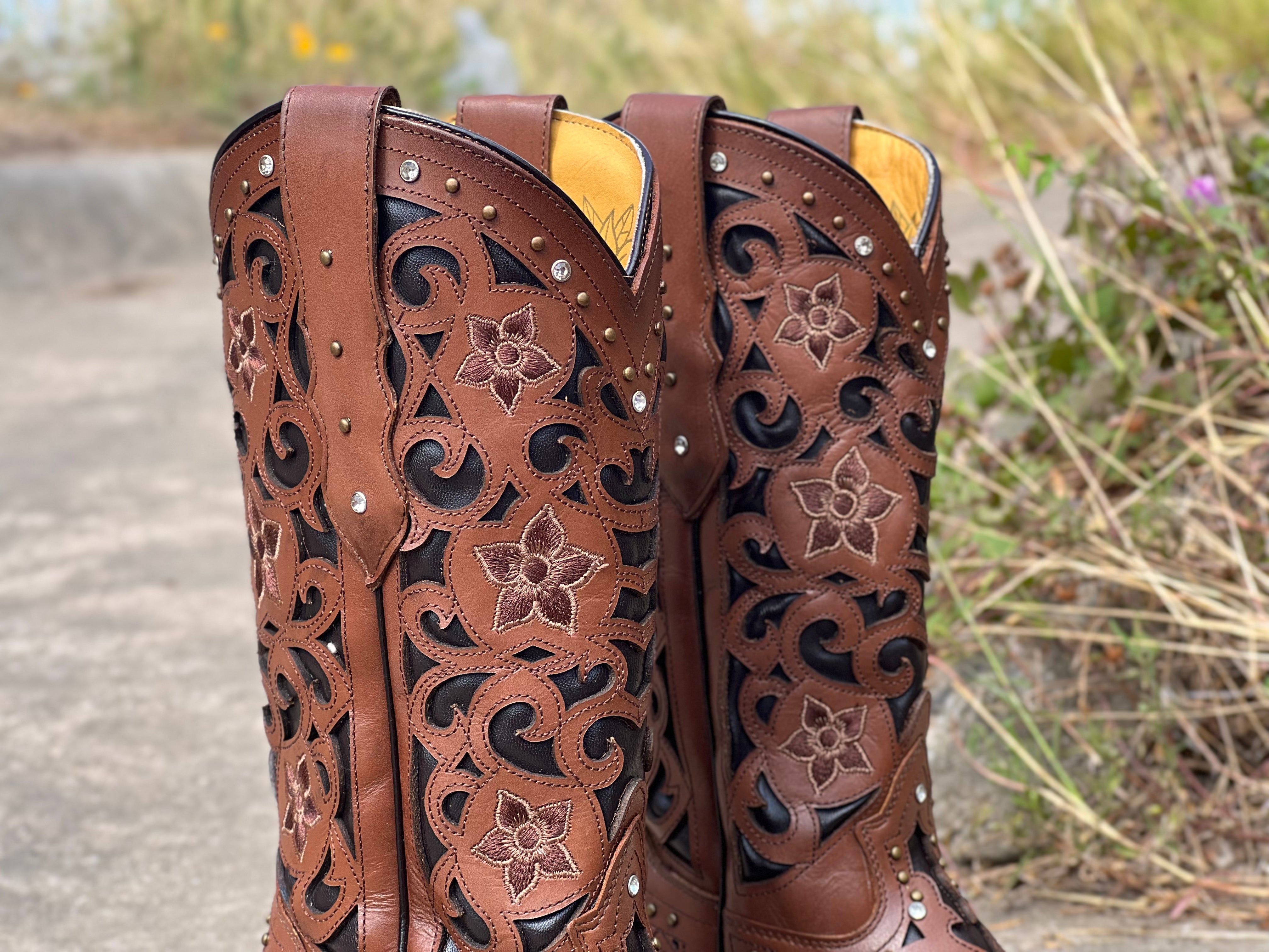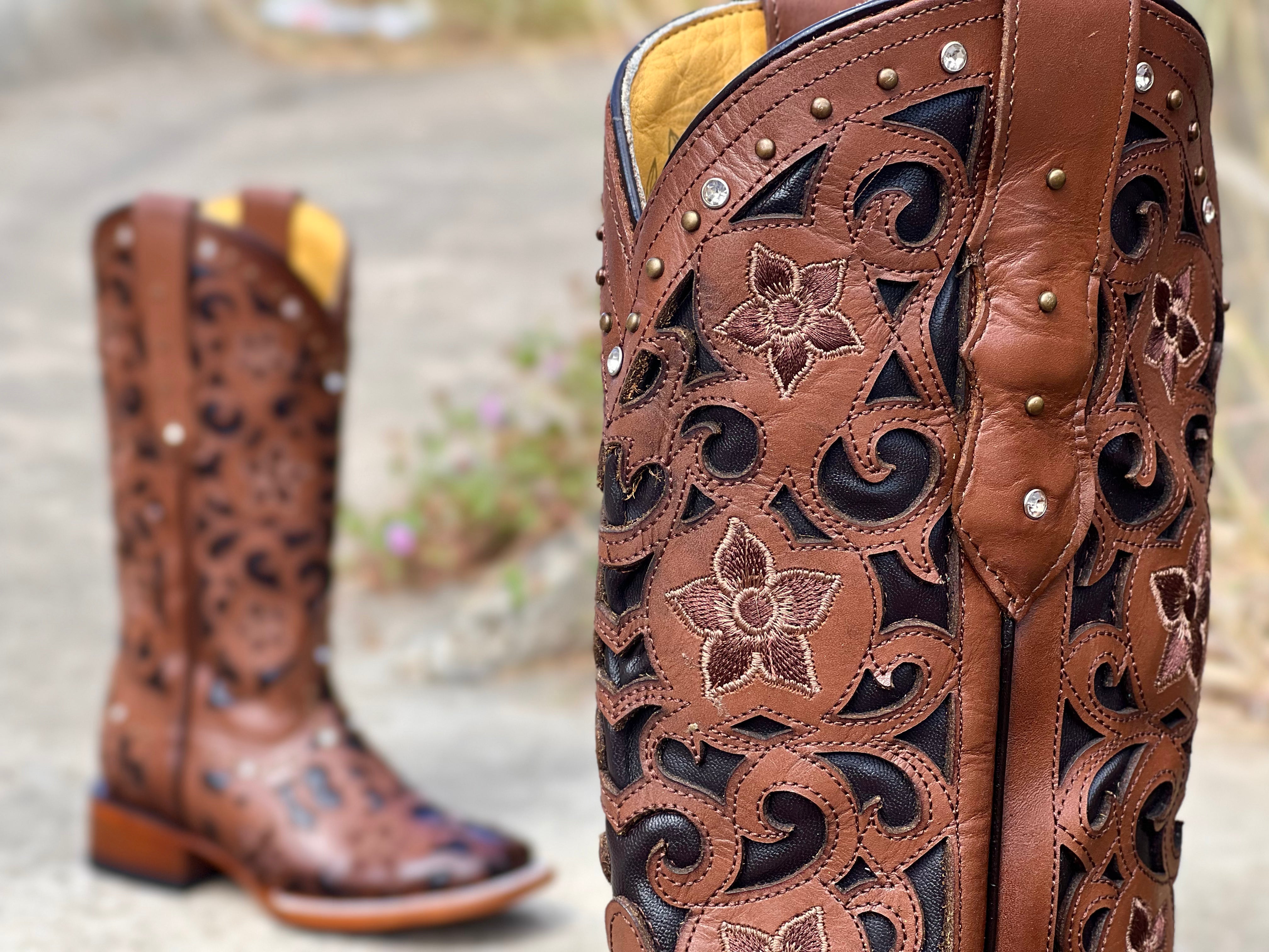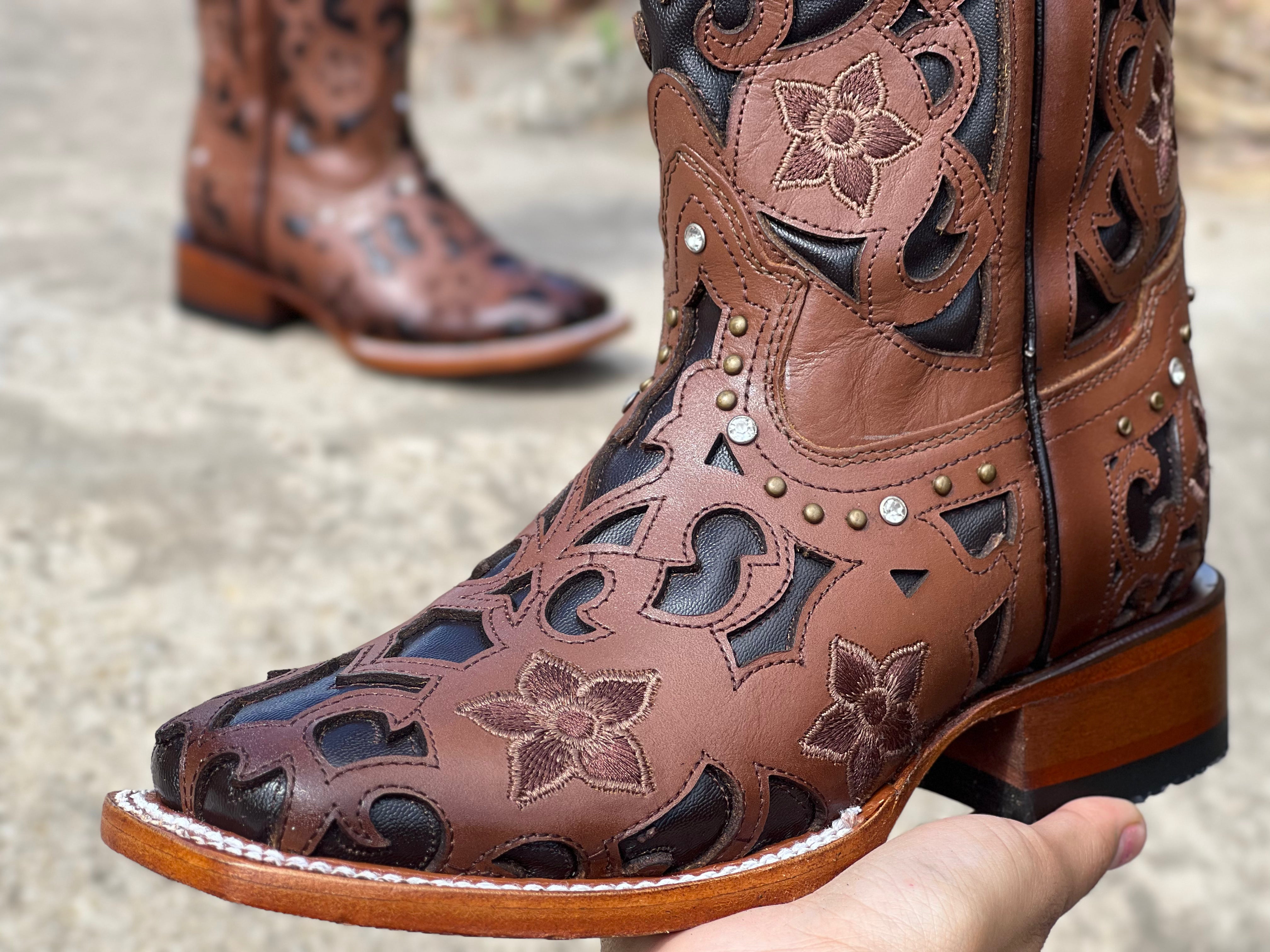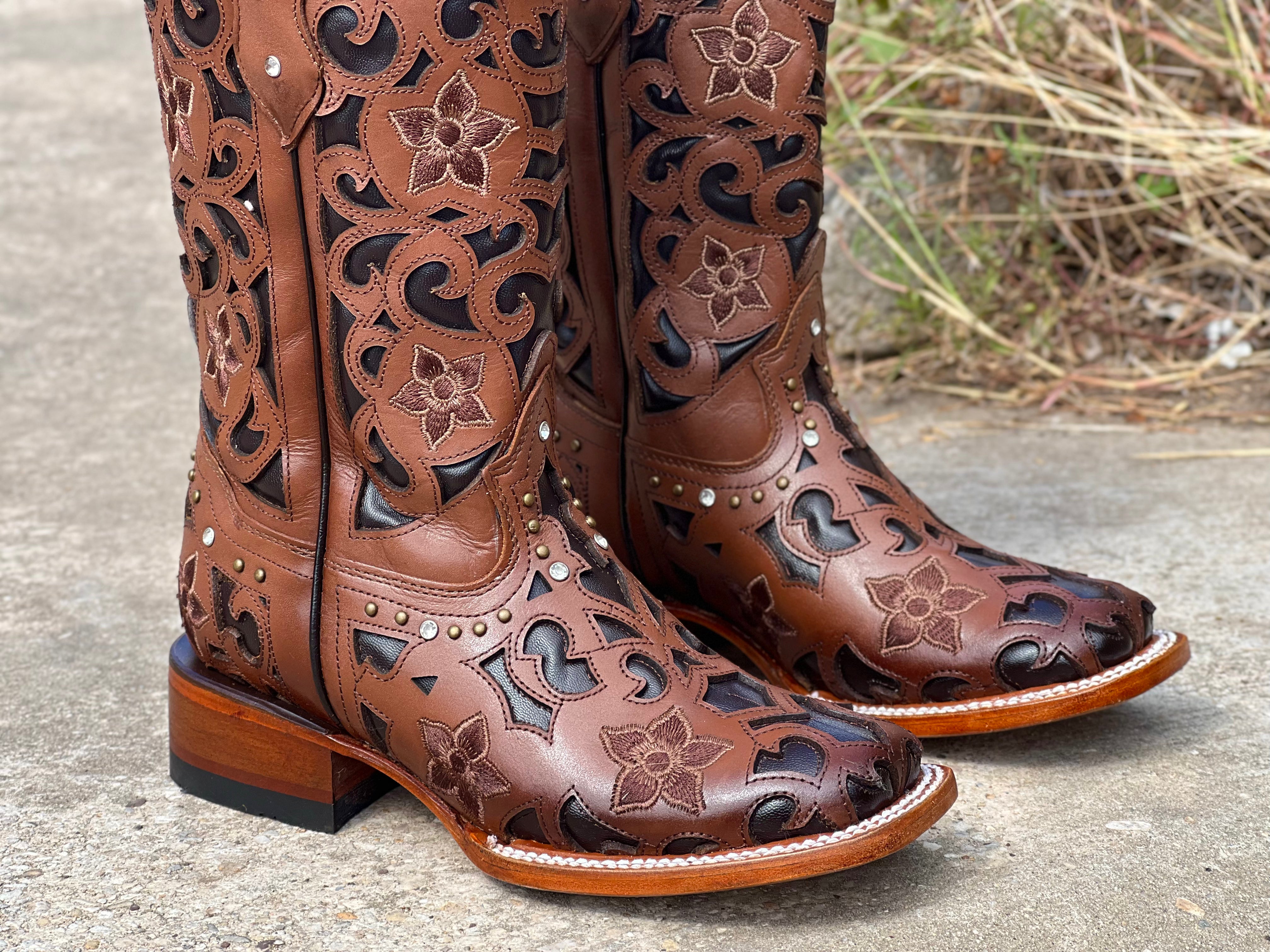 Women’s Cognac Leather Boots With Black Inlay—Square Toe