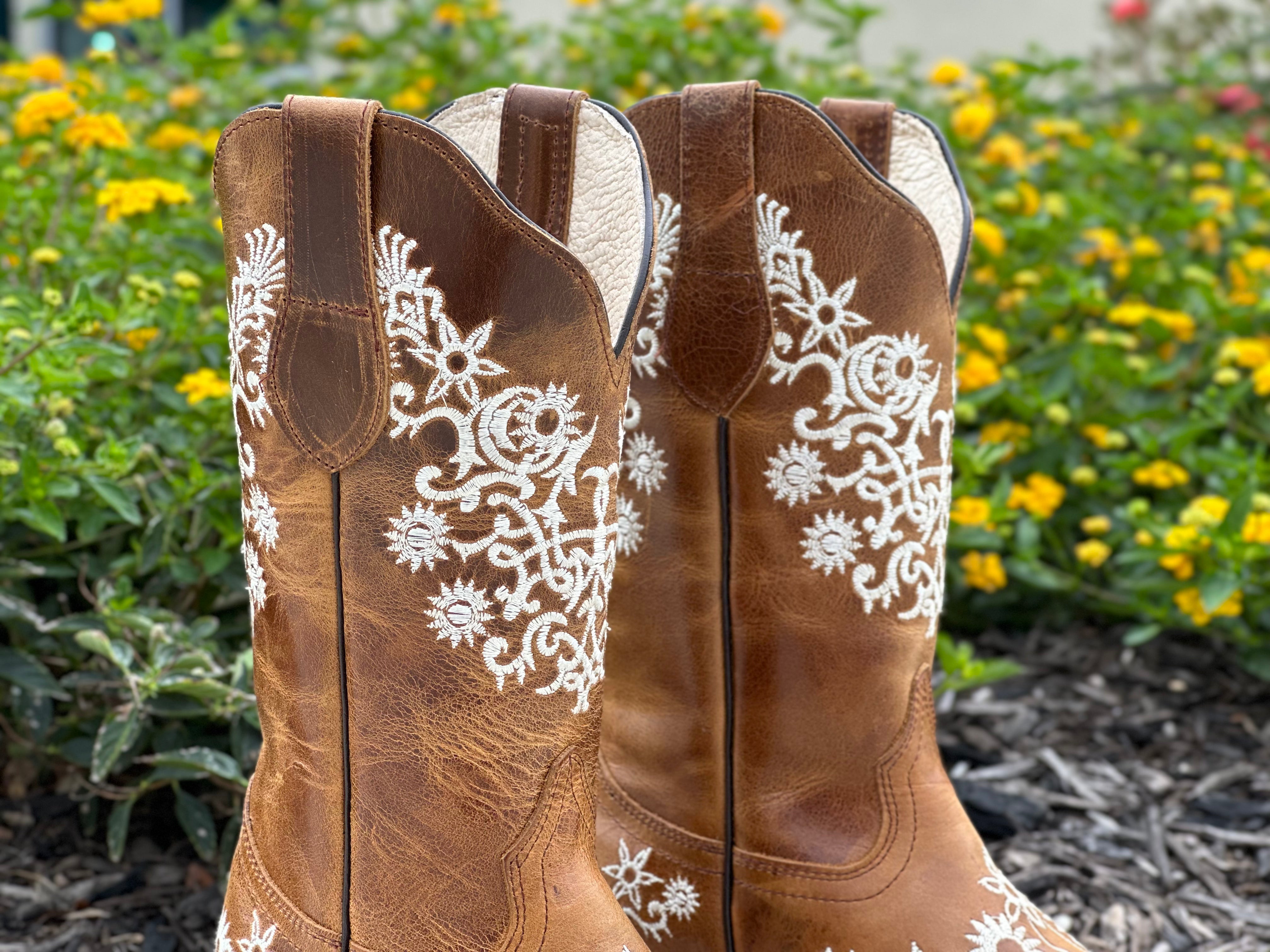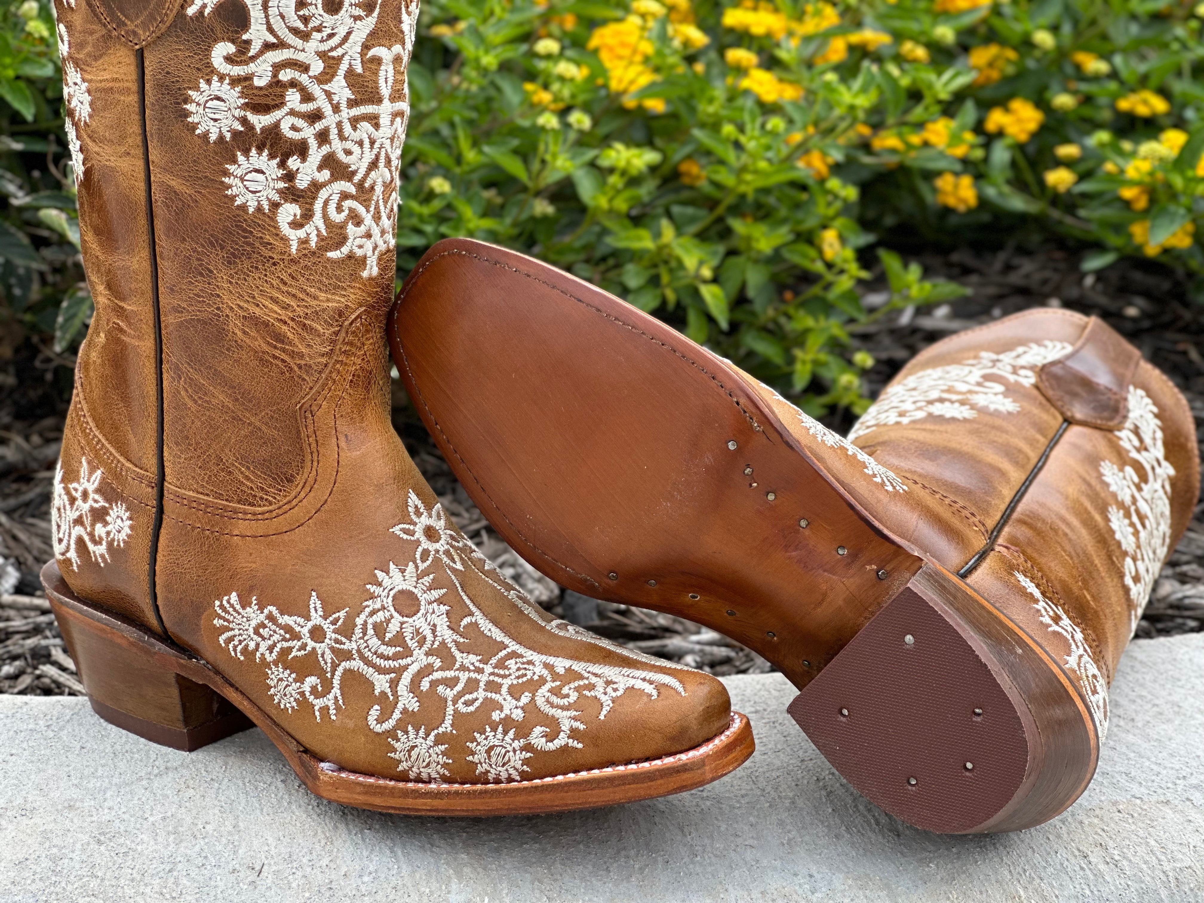 Women’s Honey Leather Boots With White Embroidery-Snip Toe