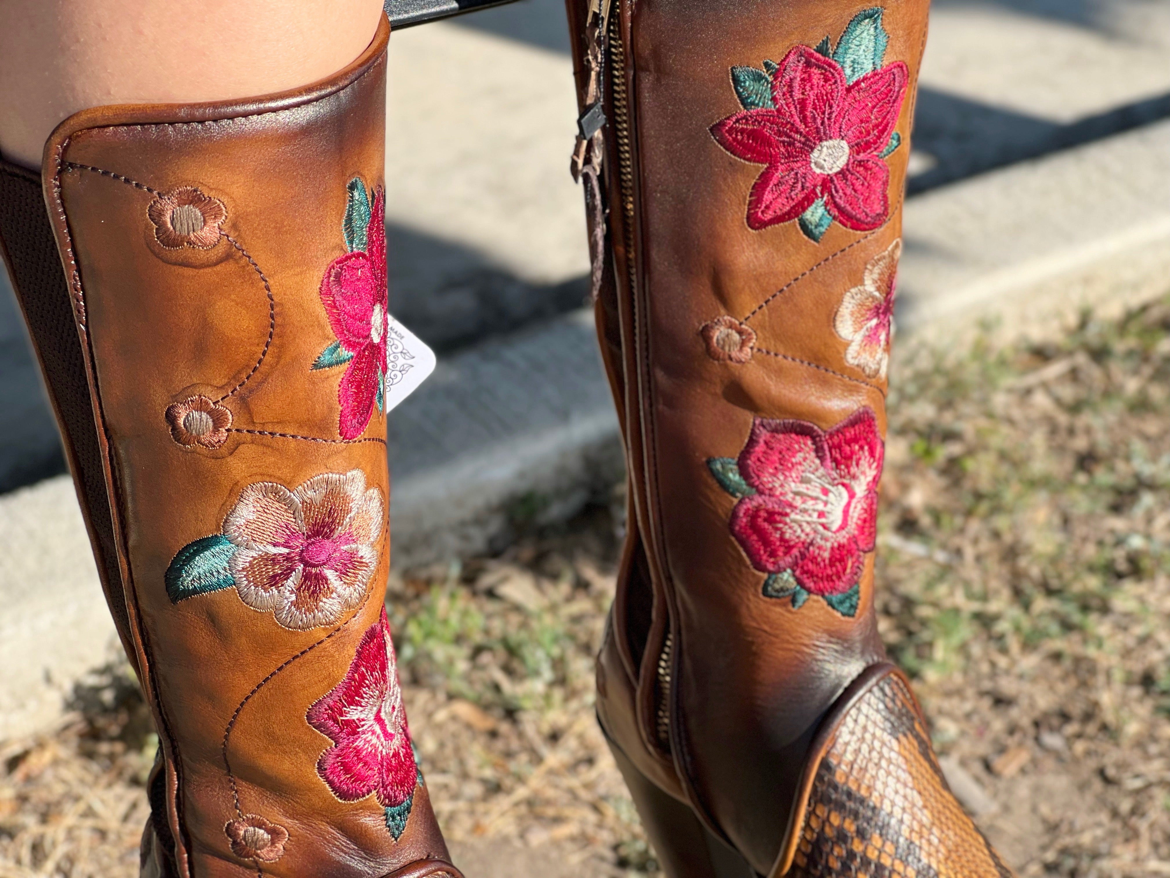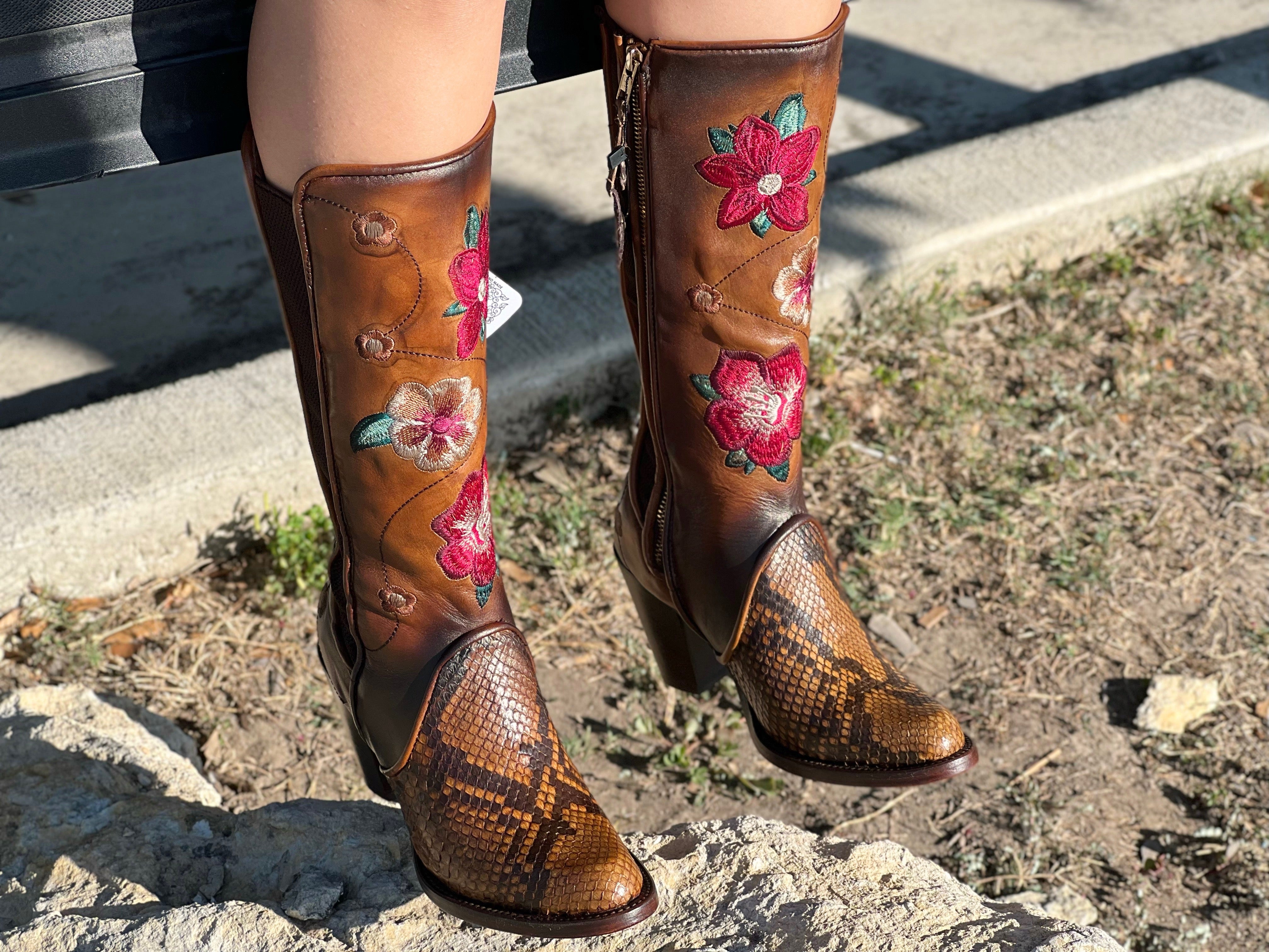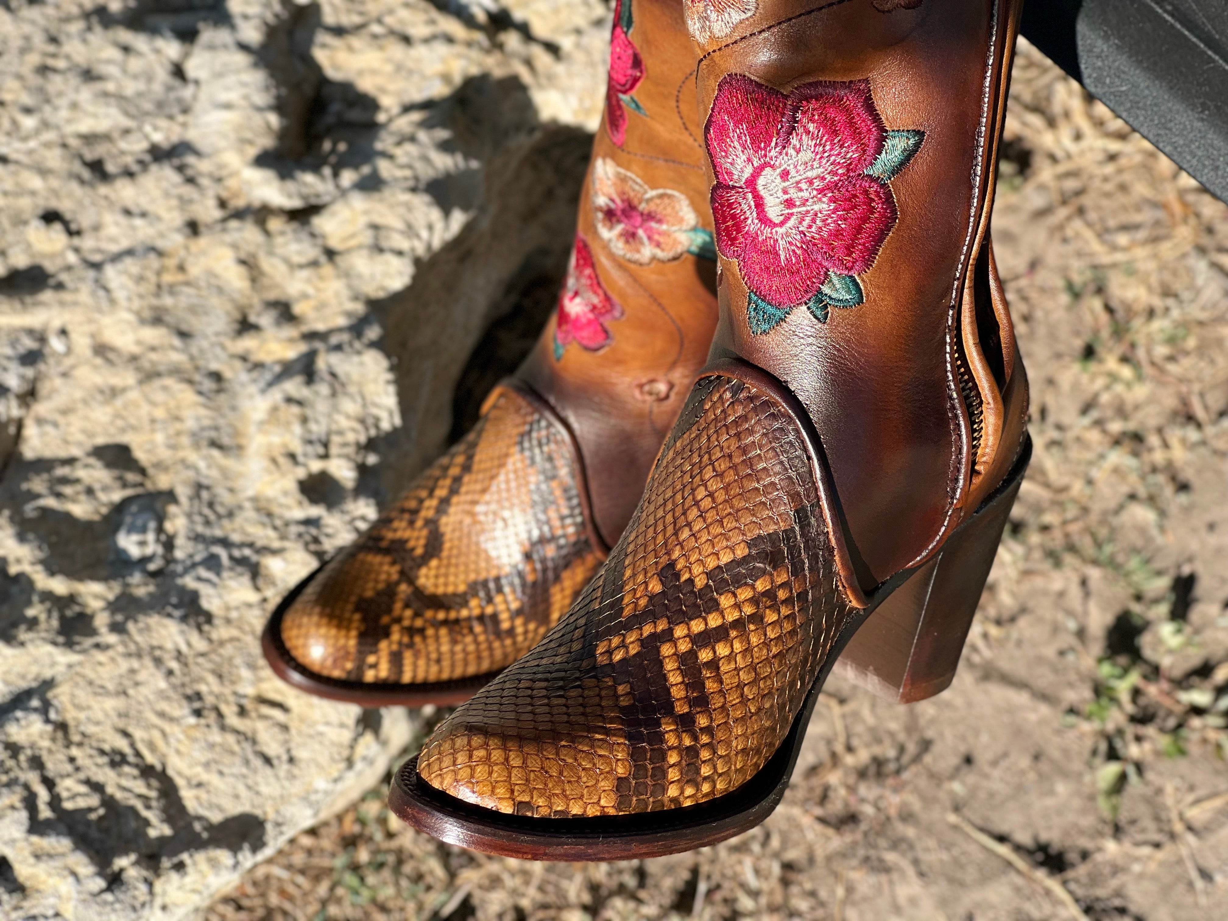 Women’s Original Honey Python Leather Boots With Floral Embroidery