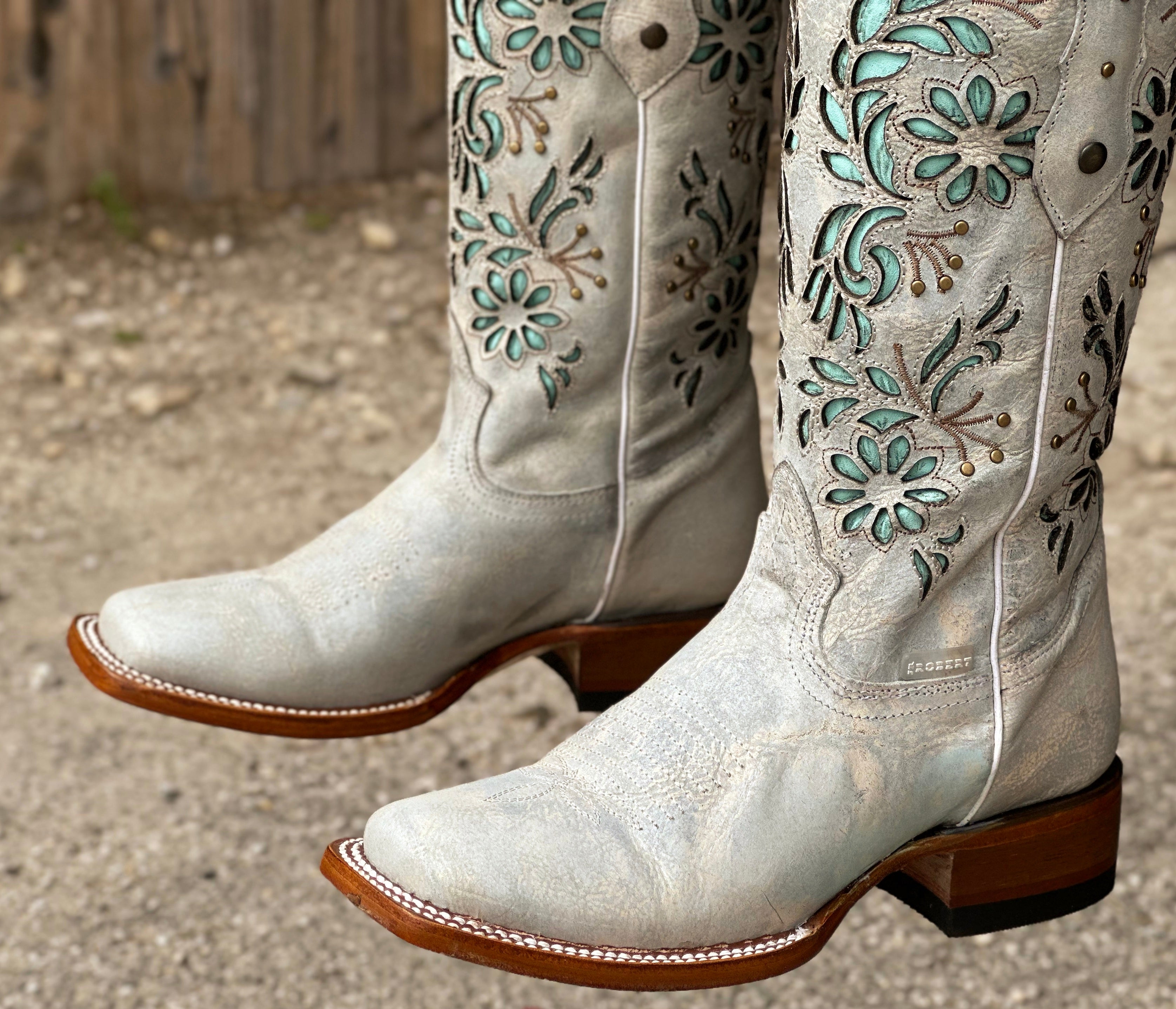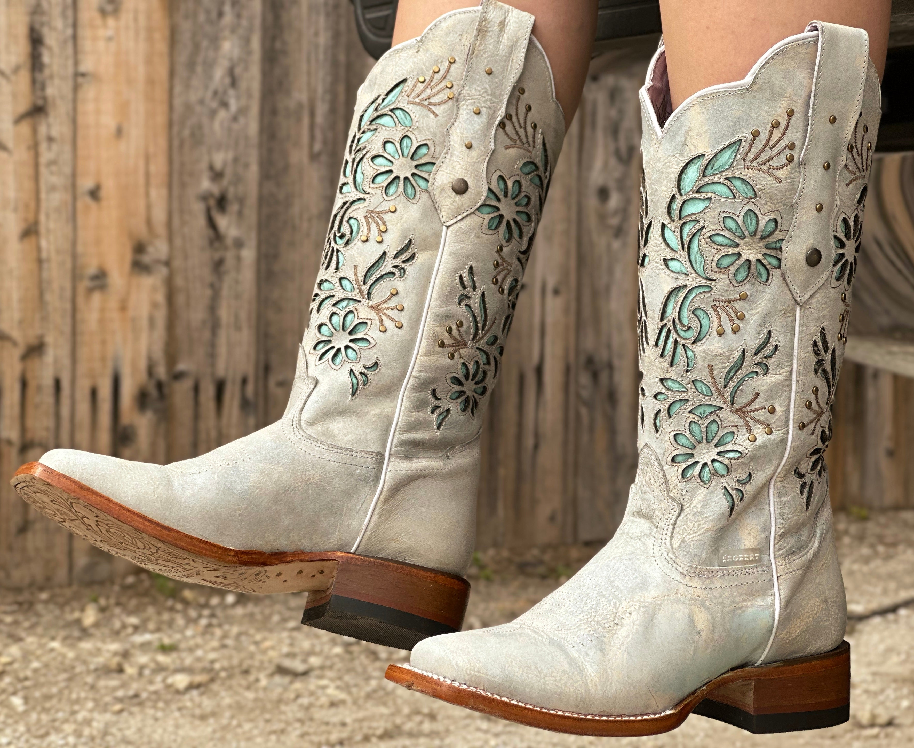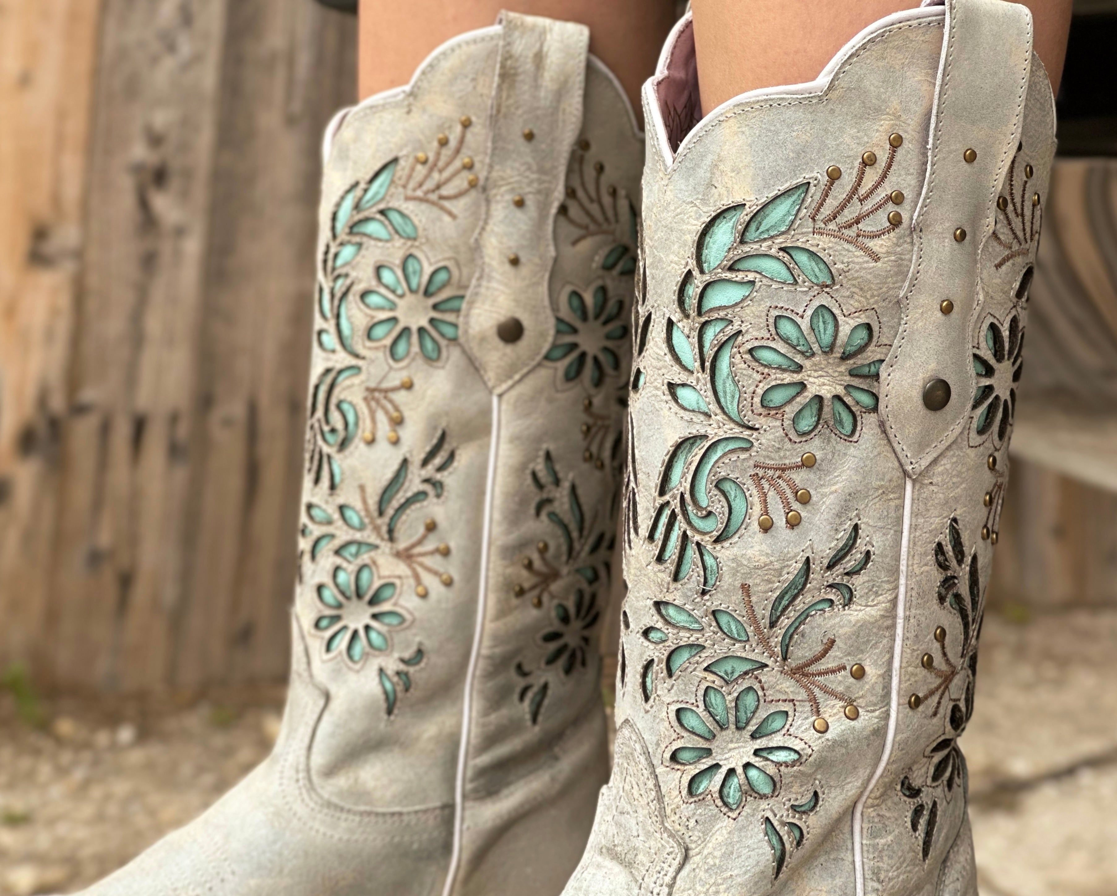 Women’s Pearl White Leather Boots With Turquoise Inlay