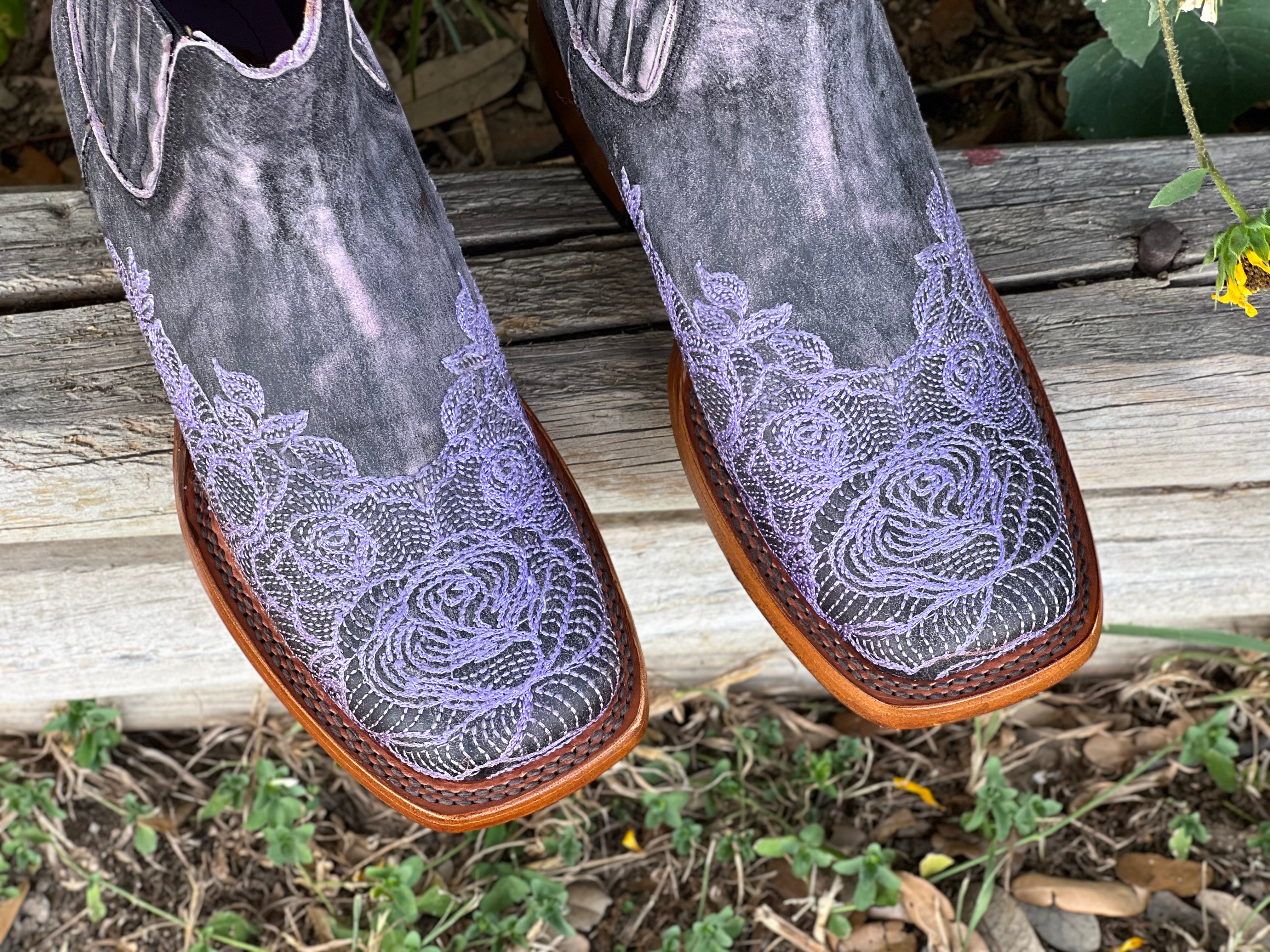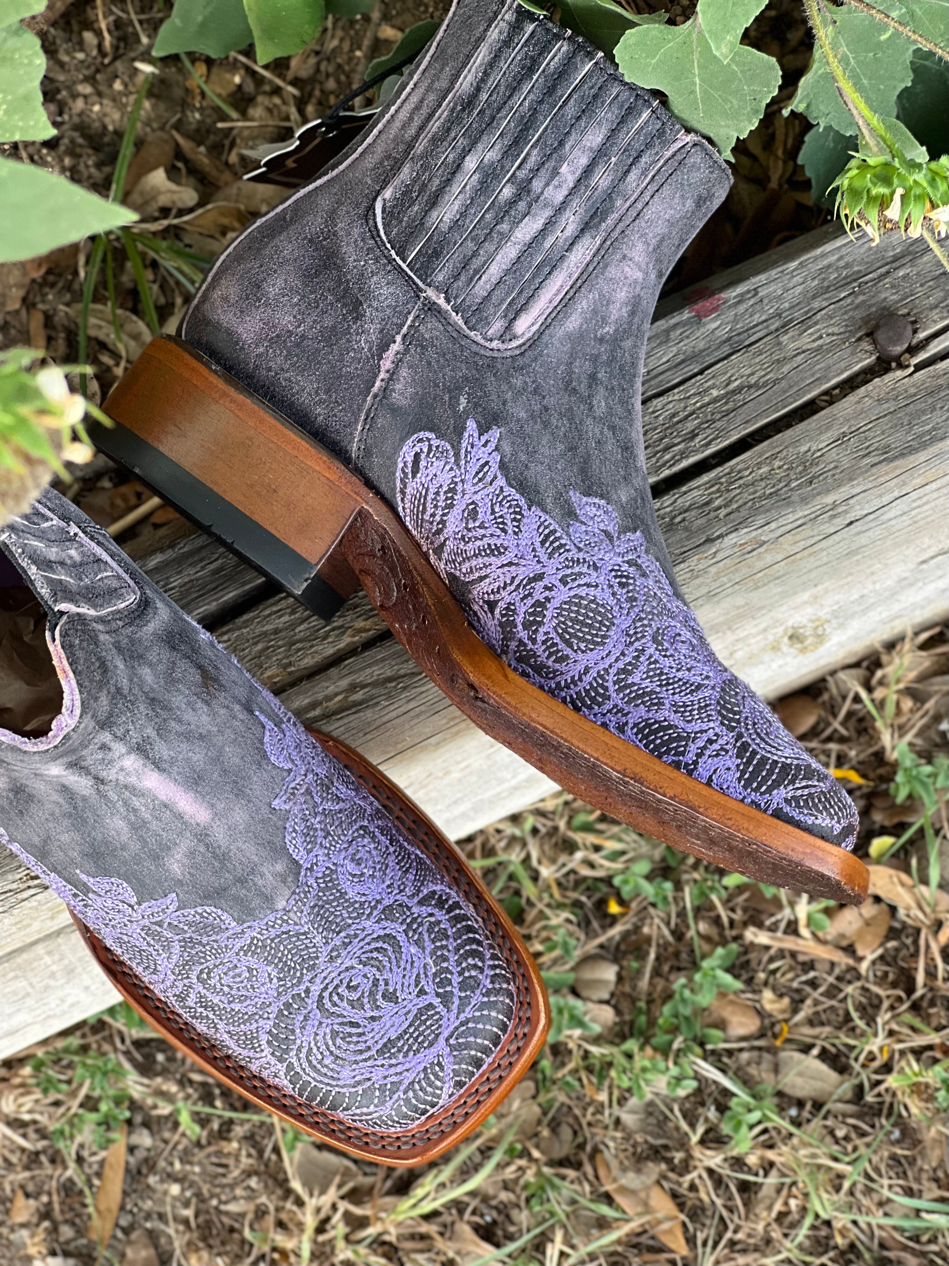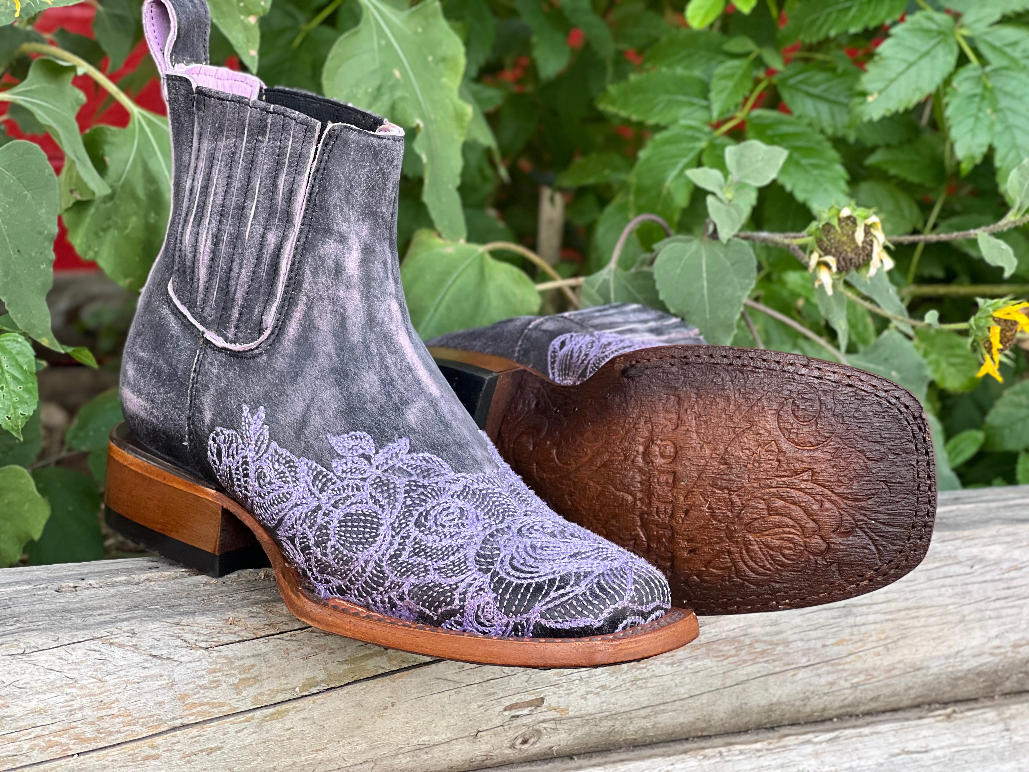 Women’s Weathered Squared Toe Leather Boots With Lilac Embroidery