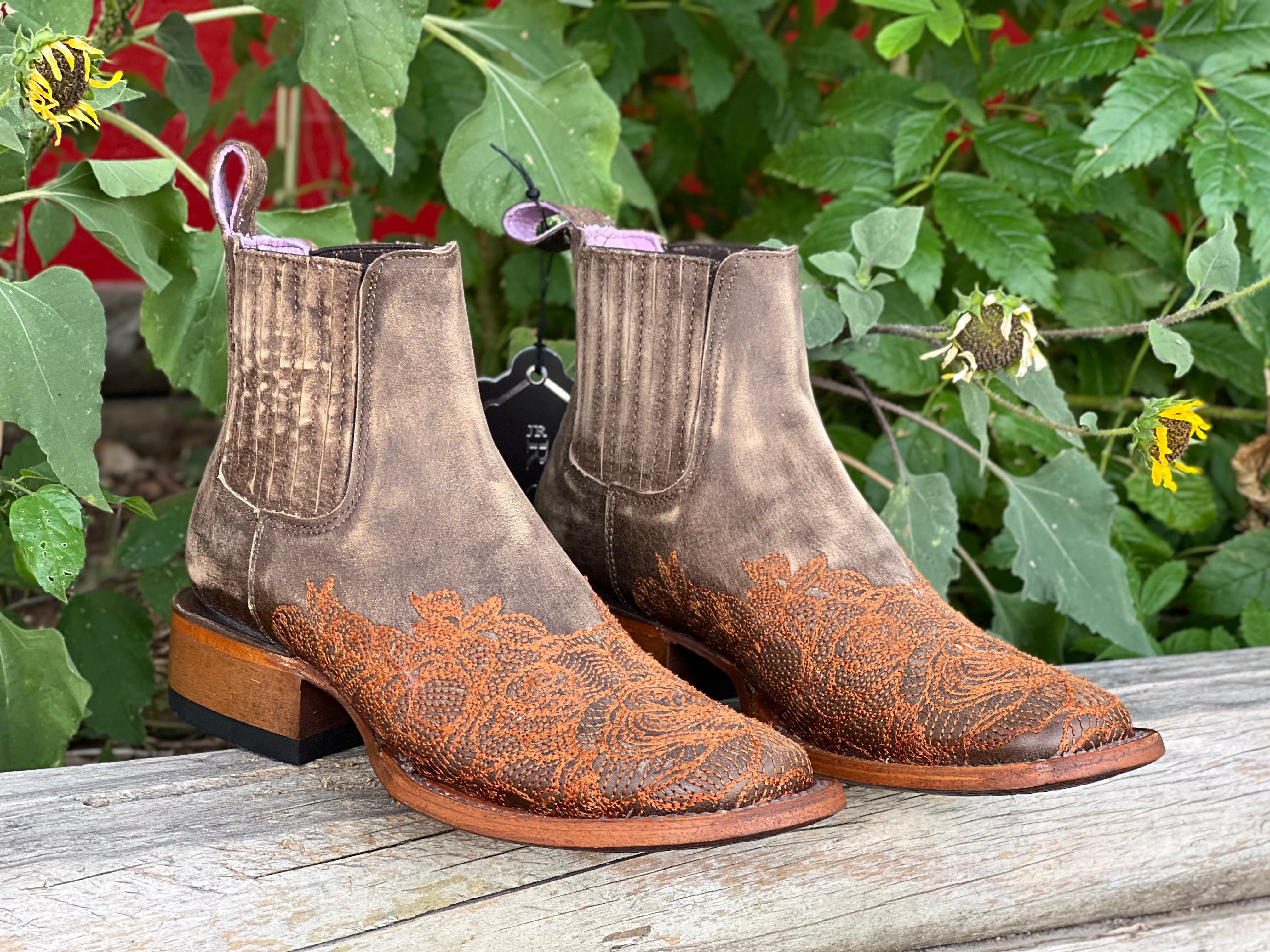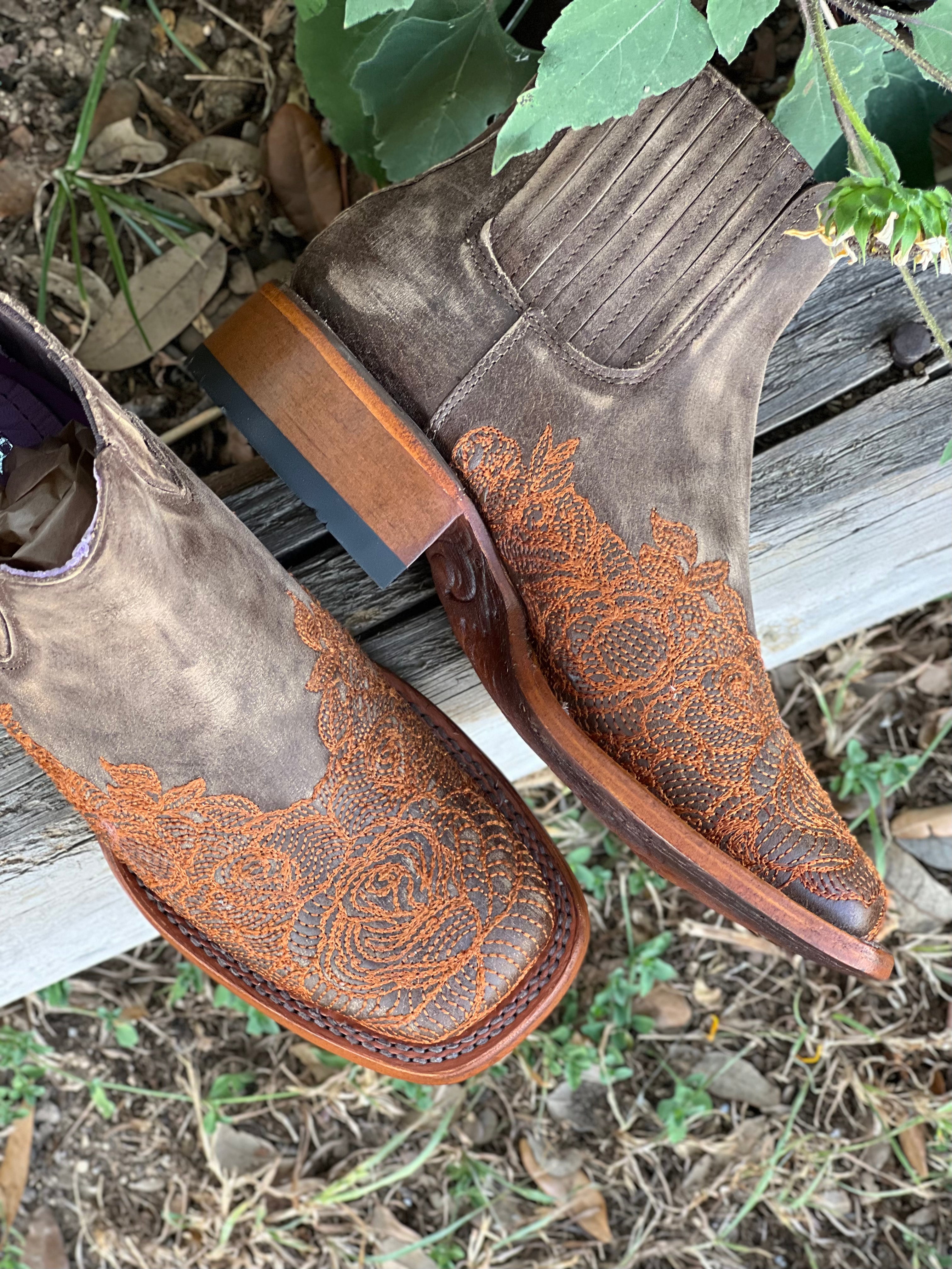 Women’s Weathered Squared Toe Leather Boots With Orange Embroidery