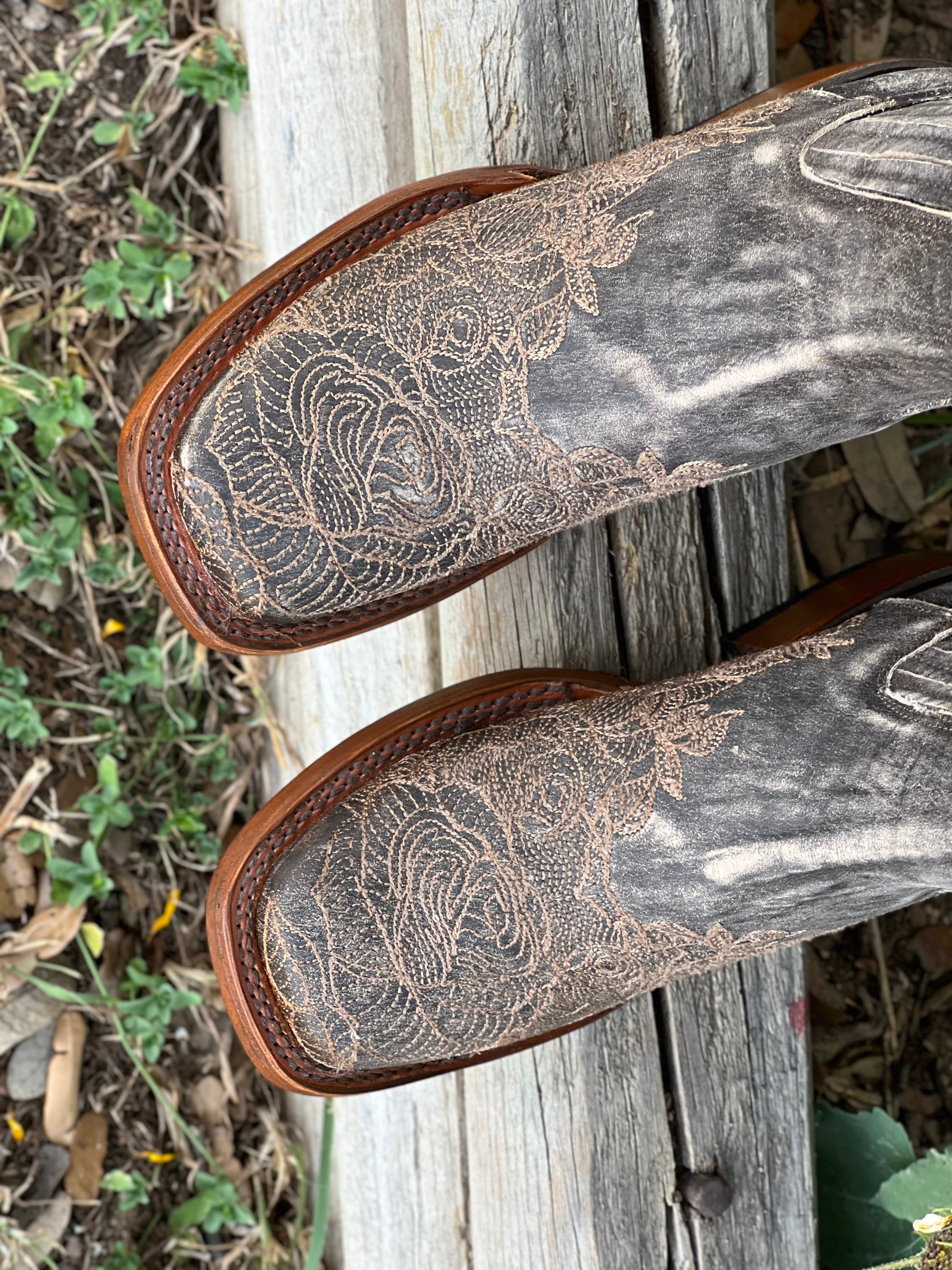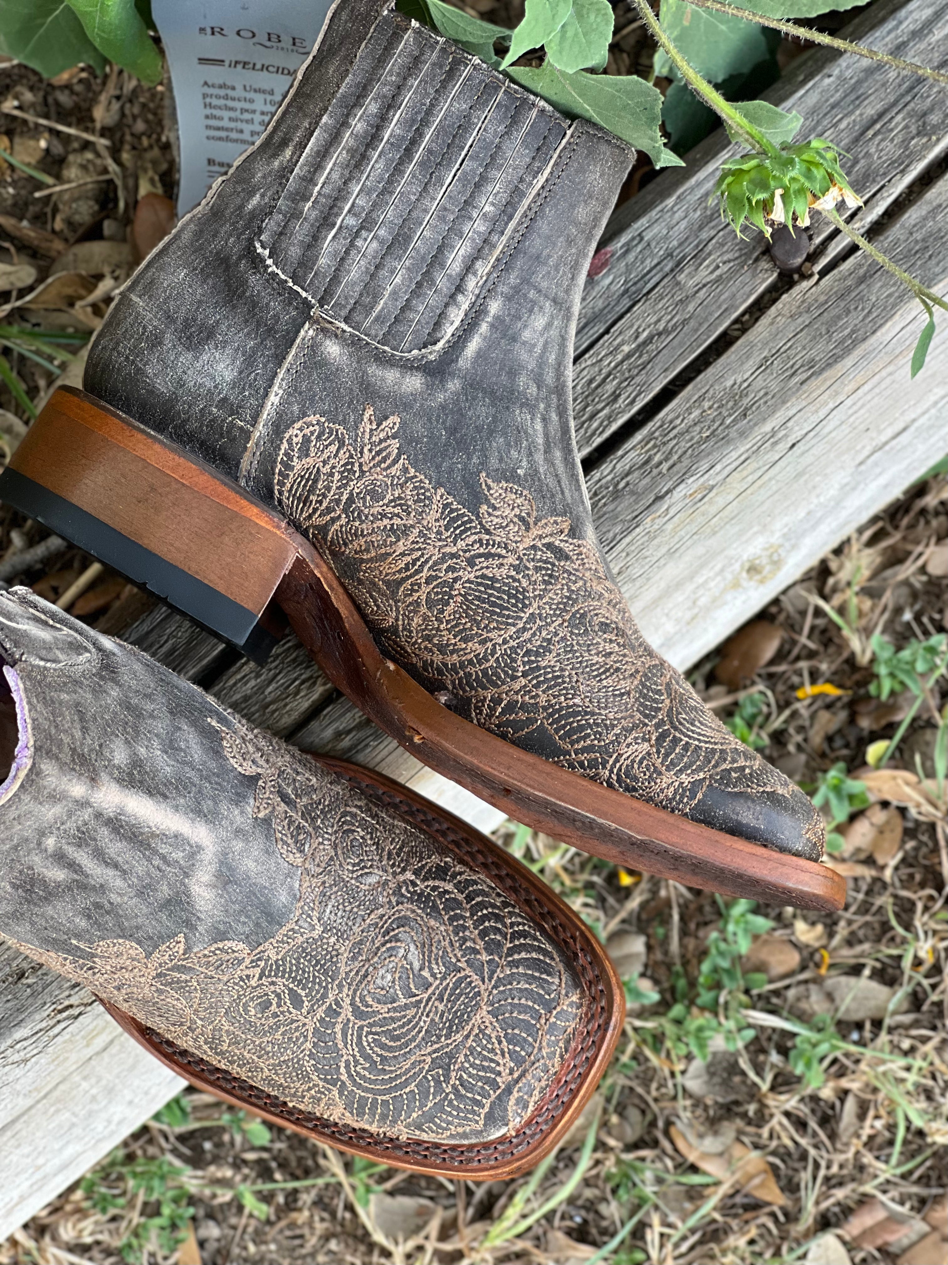 Women’s Weathered Squared Toe Leather Boots With Tan Embroidery